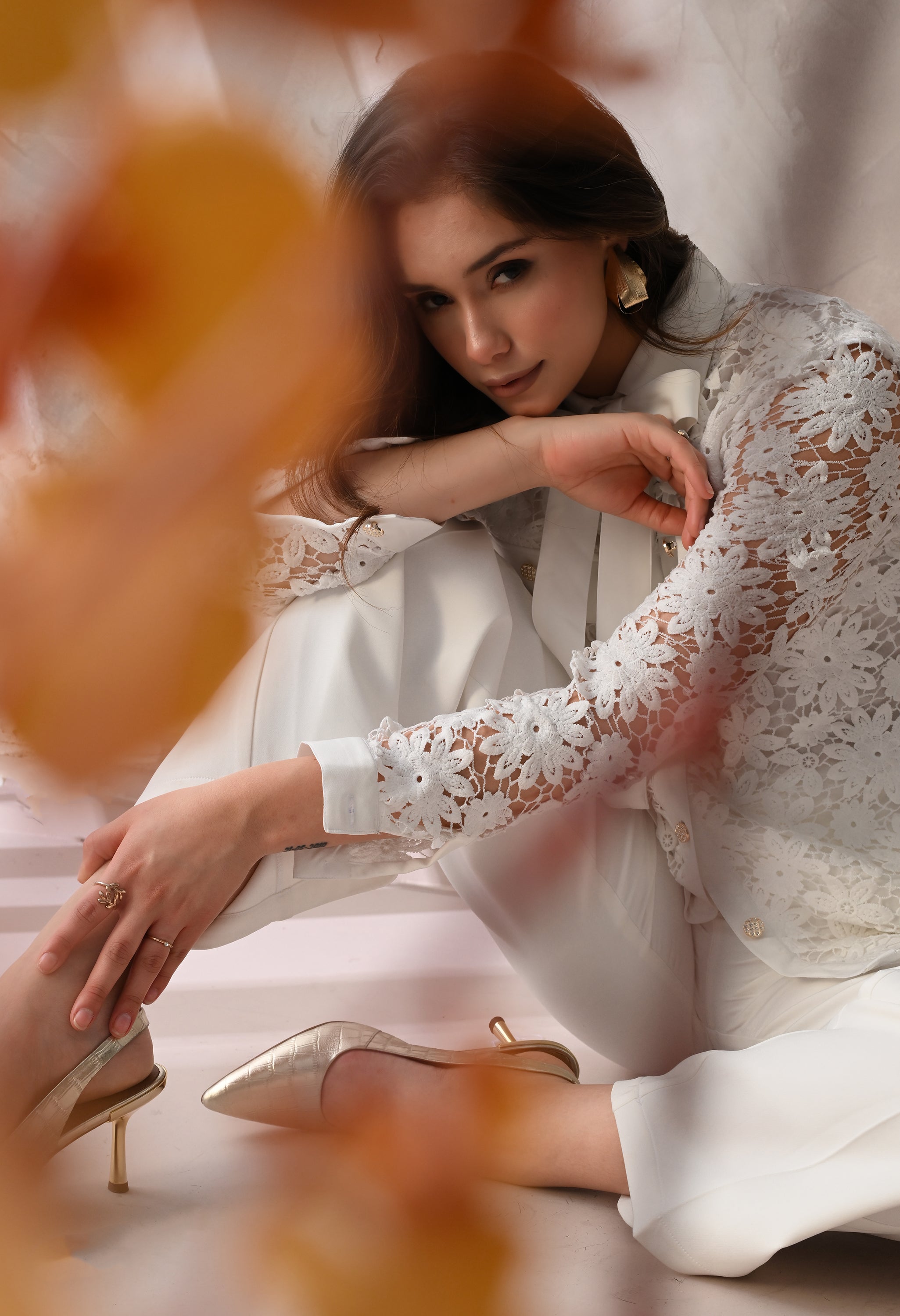 SHEER ORGANZA BUTTON - DOWN SHIRT WITH FLORAL LACE CUFFS AND MATCHING A INNER