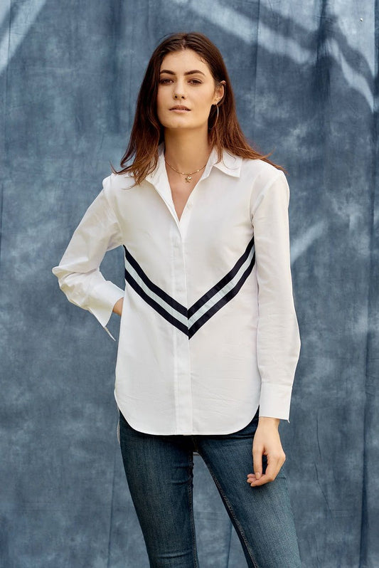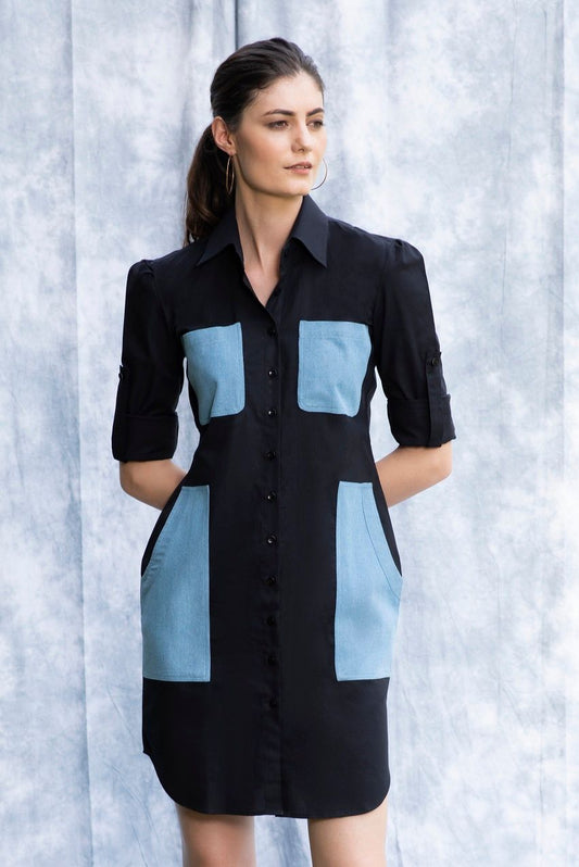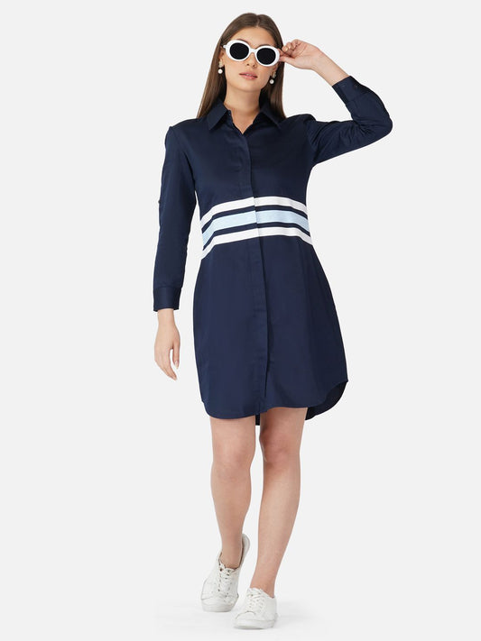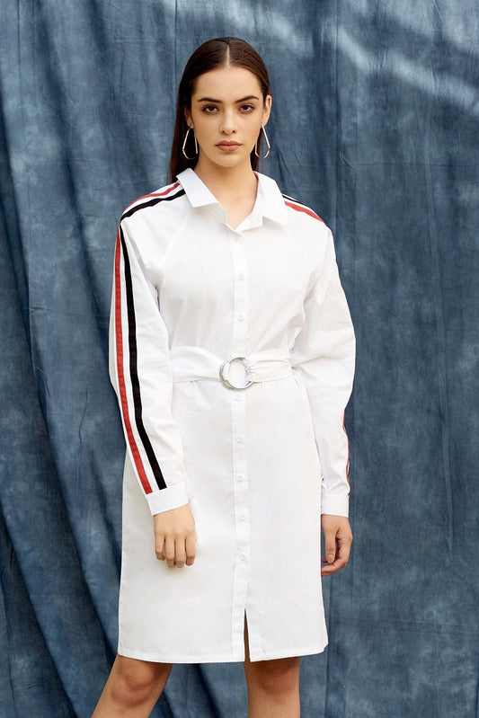 White shirt dress with black and red stripes with belt and roll up sleeves