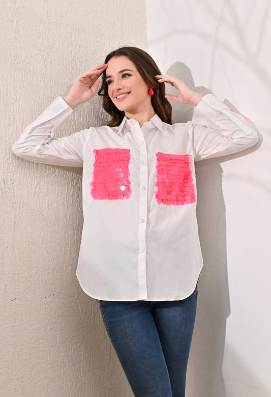 White shirt with neon pink sequence patch pockets