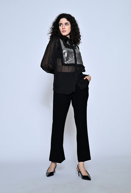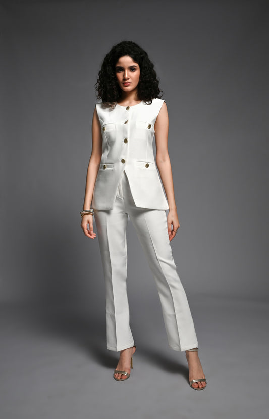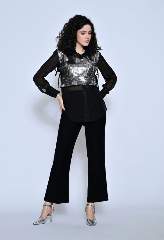 Blue Co-ord set with pink highlights, belt and flared trousers
