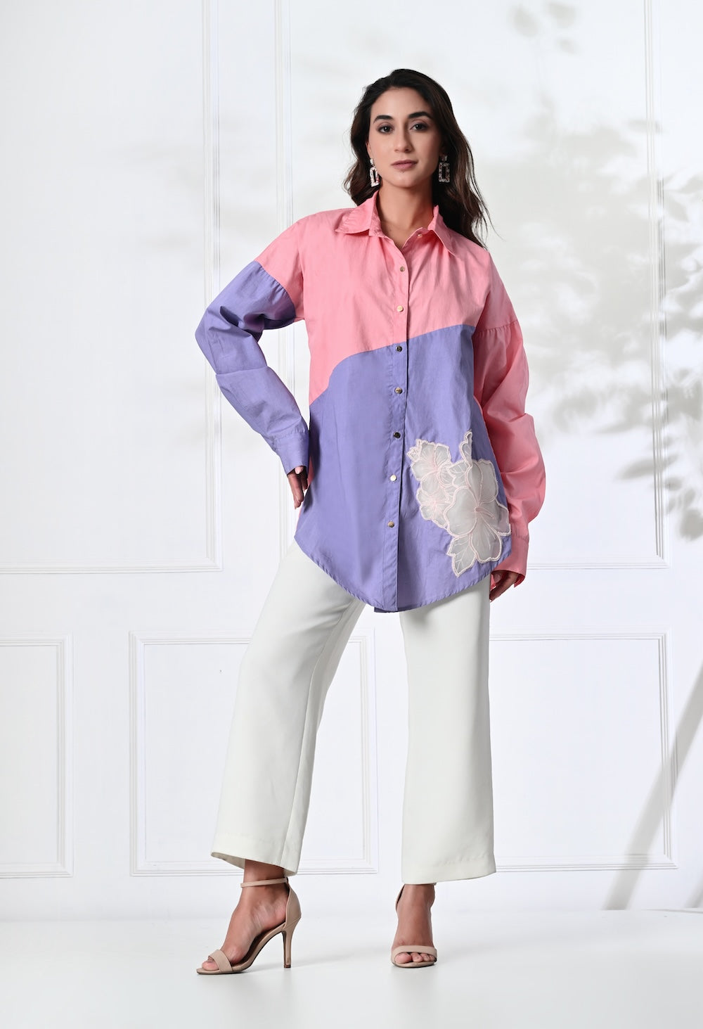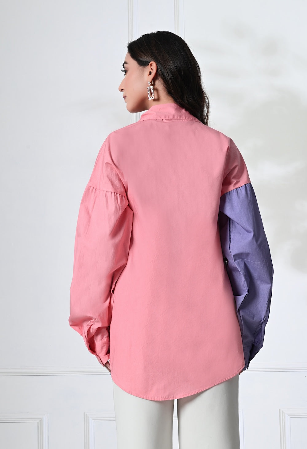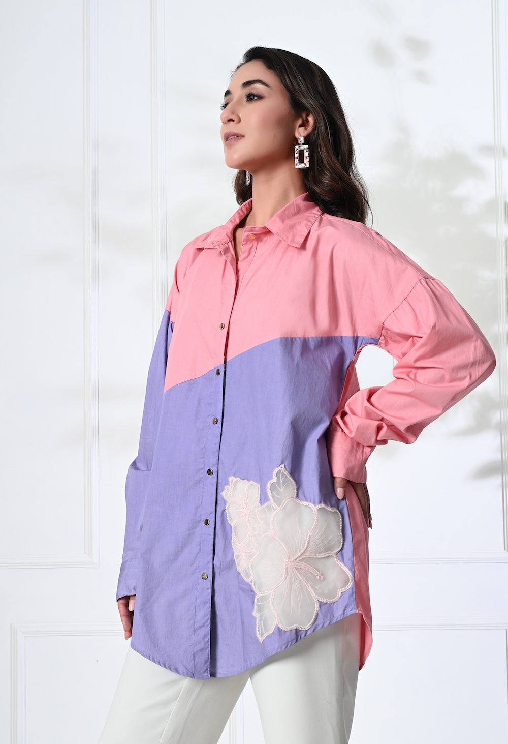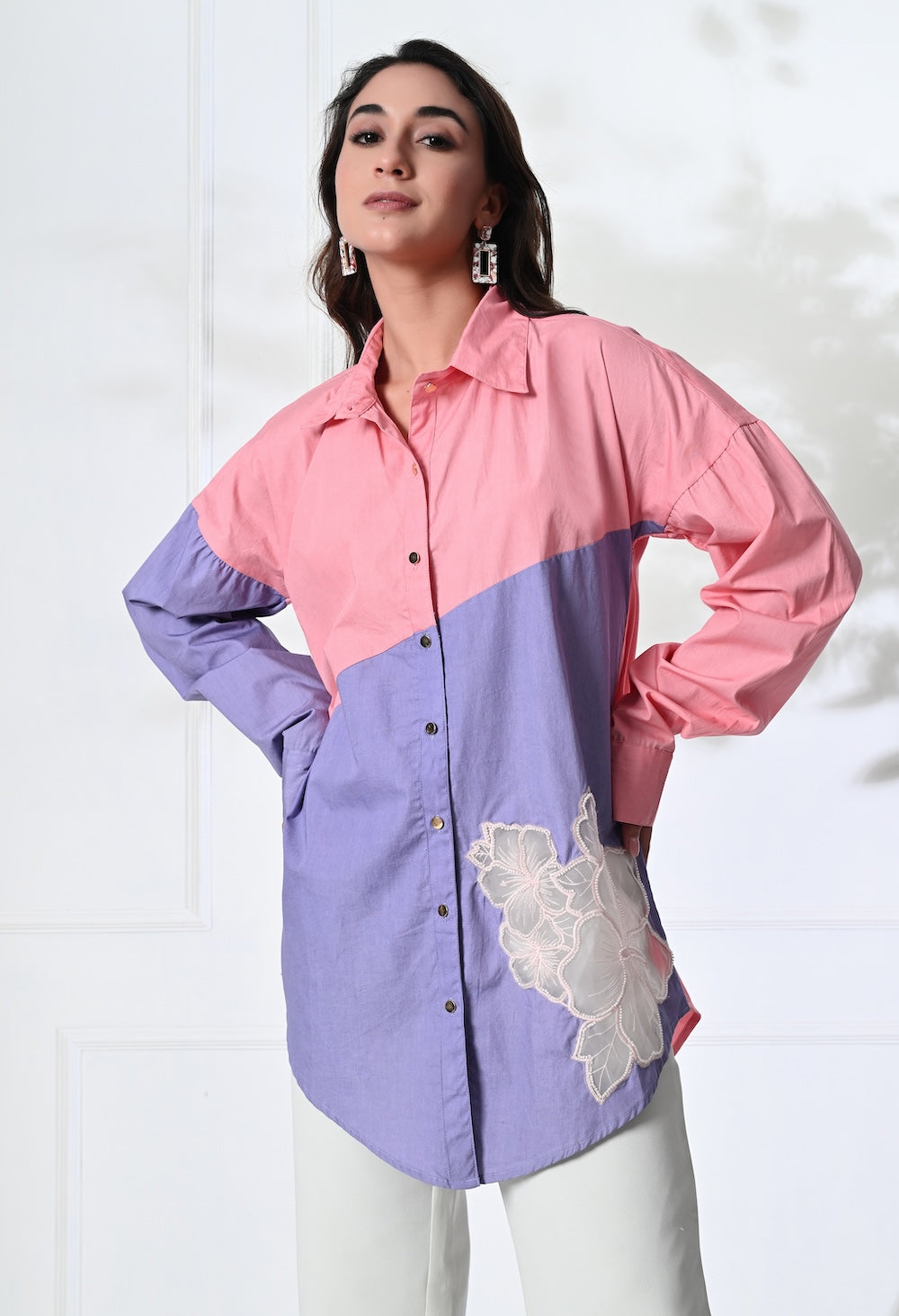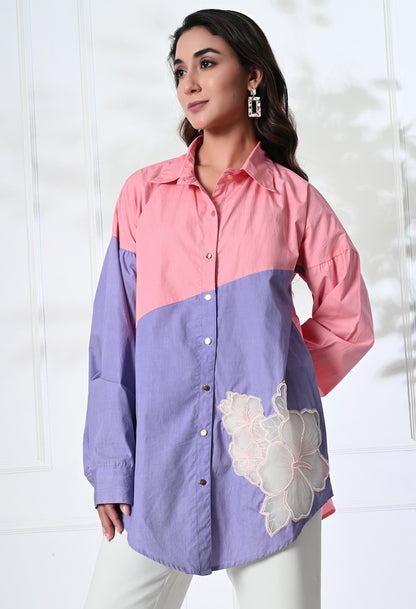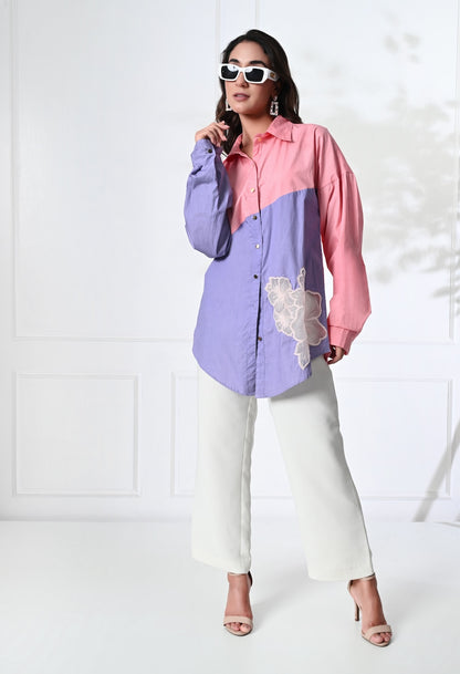 The dual tone pink and purple shirt offers a relaxed silhouette with its playful collar neckline, golden buttons and delicate patch detailing for an effortless style. Team it with pants or denims or make a co-ord set out of it.