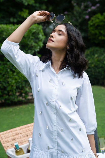 White rhinestone embroidered fit and flare short dress