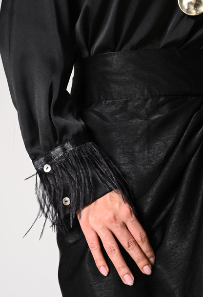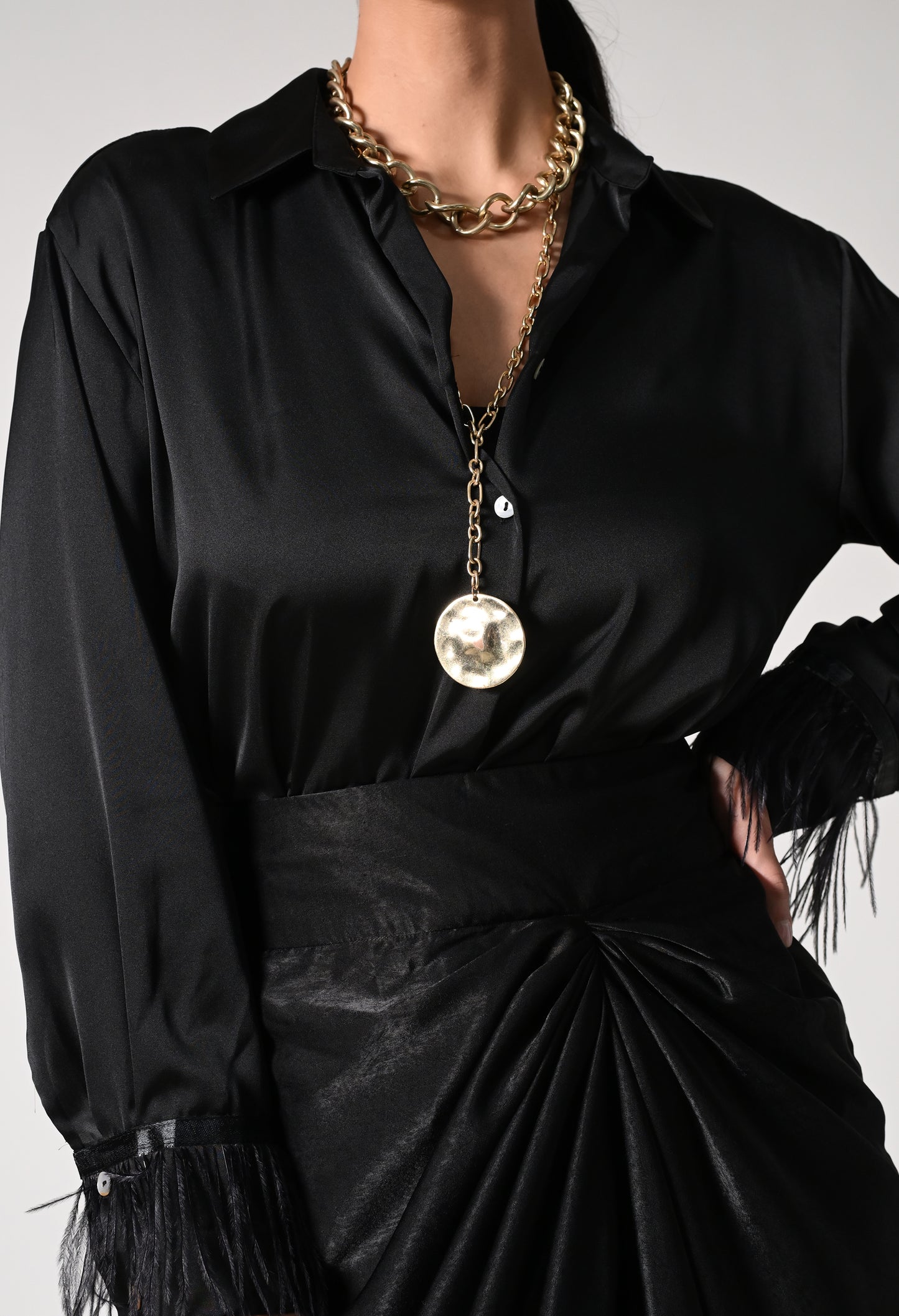 A black stain shirt will live on in your wardrobe forever, and our black satin shirt with fur sleeves is no exception. It can be styled in multiple ways- with skirt, pants, denims, shorts, just anything