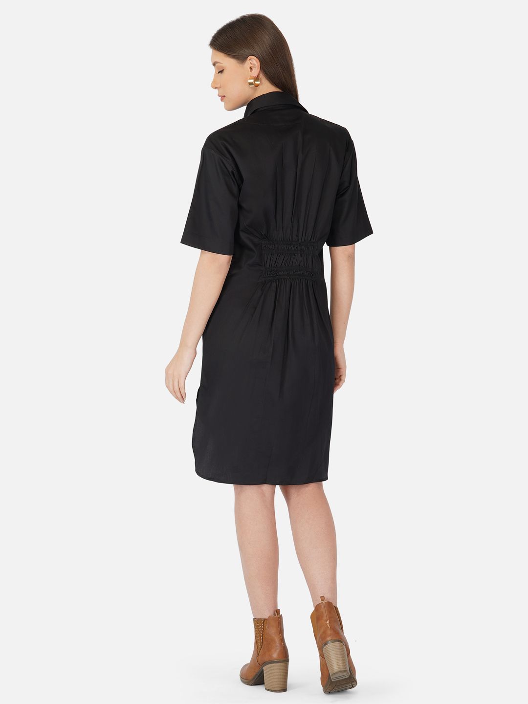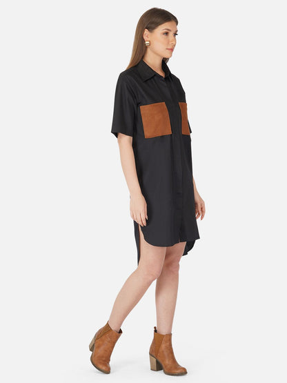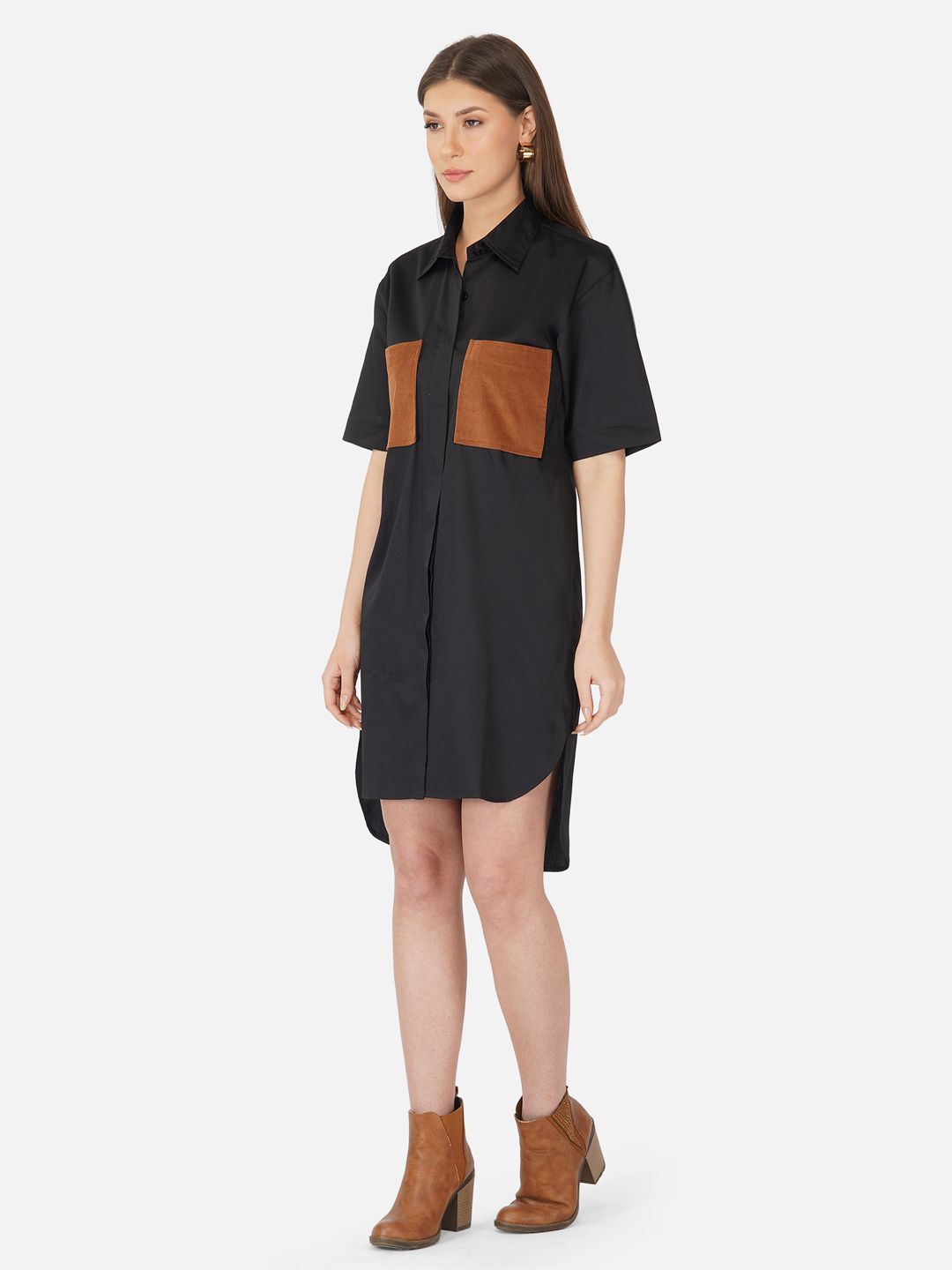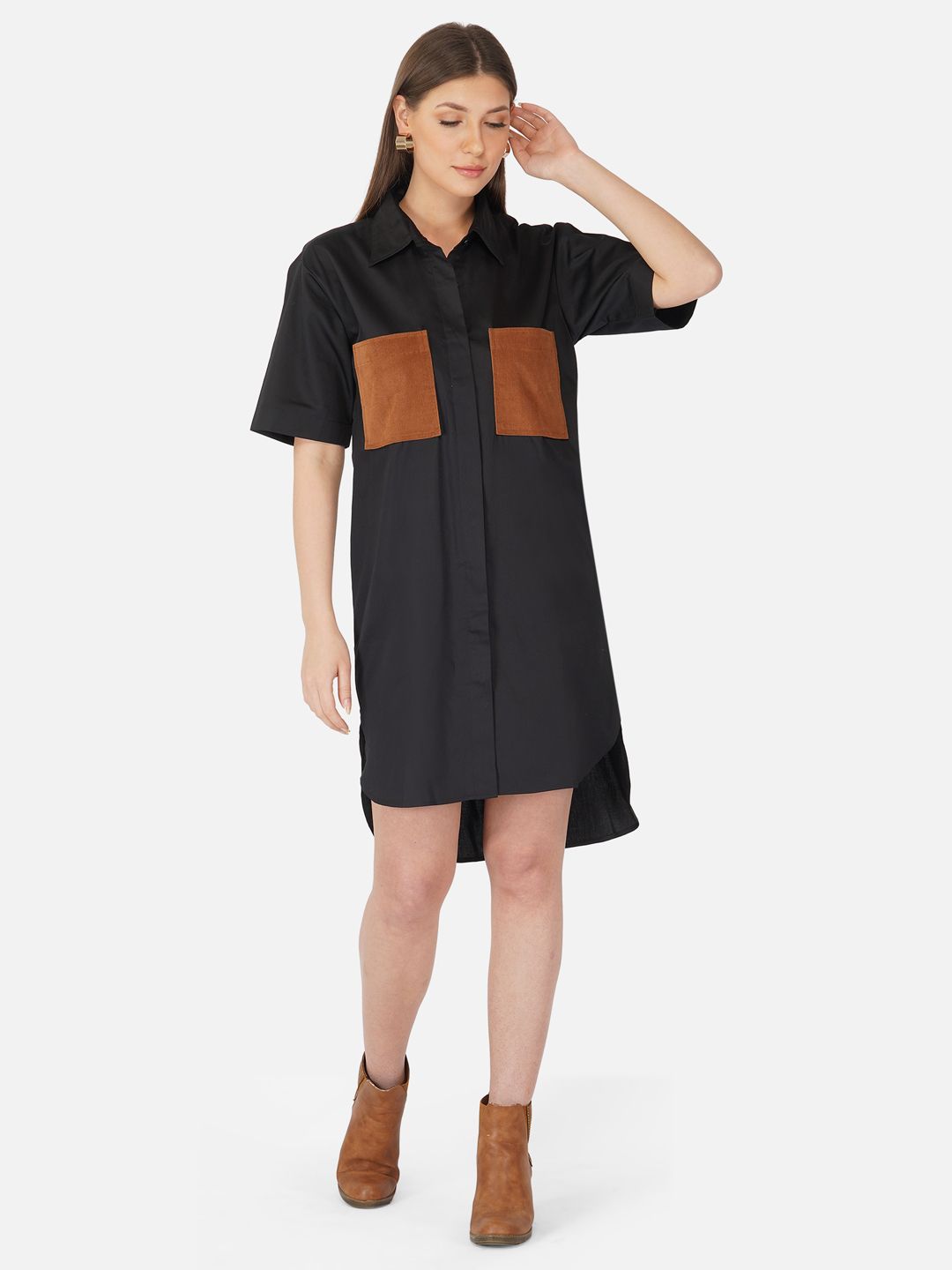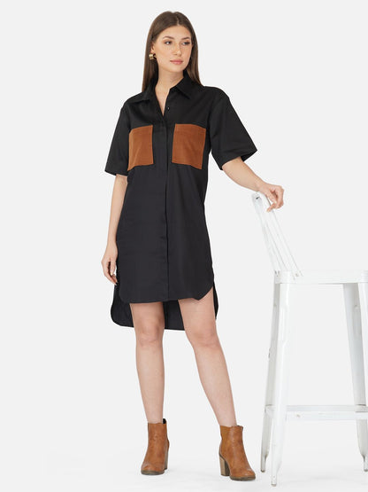 Black comfortable shirt dress handcrafted in premium cotton with brown patch pockets. A perfect one for brunch , a casual evening outing or a vacation. Be at your stylish best.