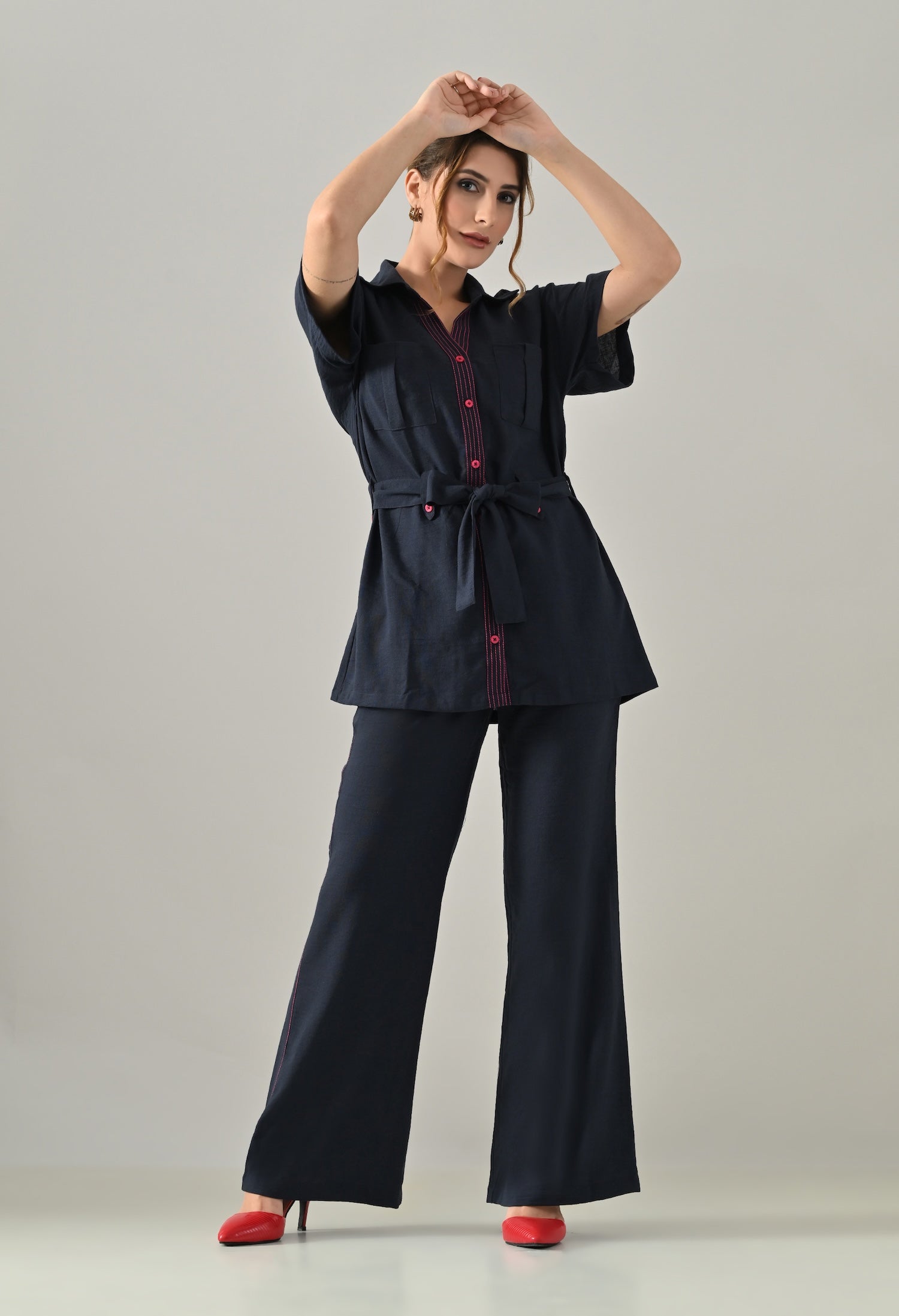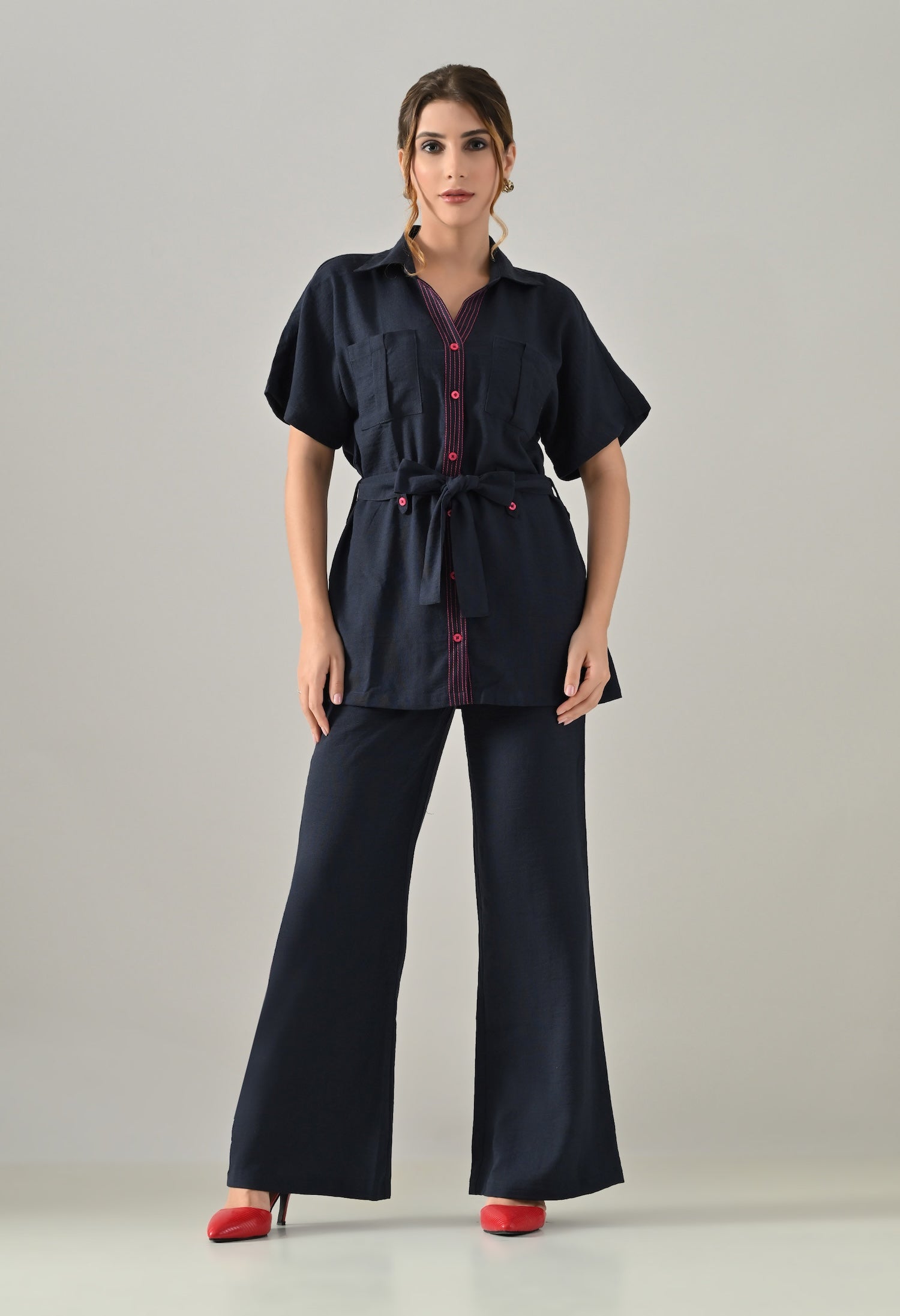 Blue Co-ord set with pink highlights, belt and flared trousers