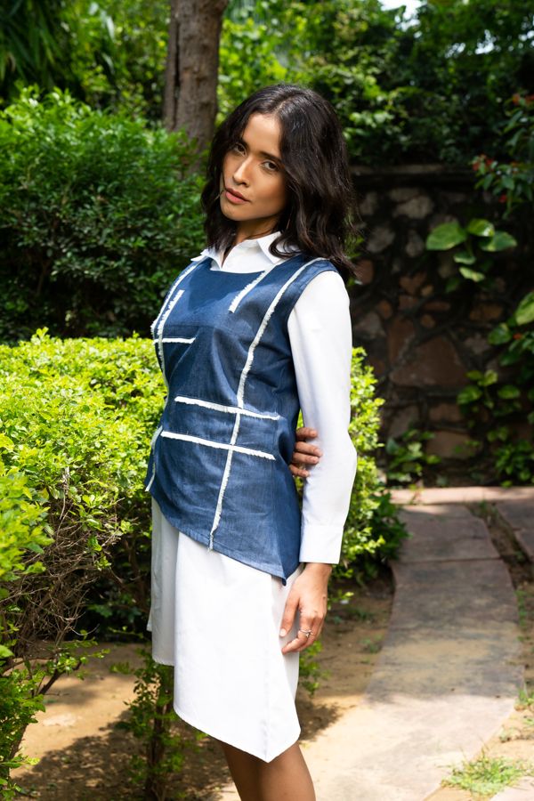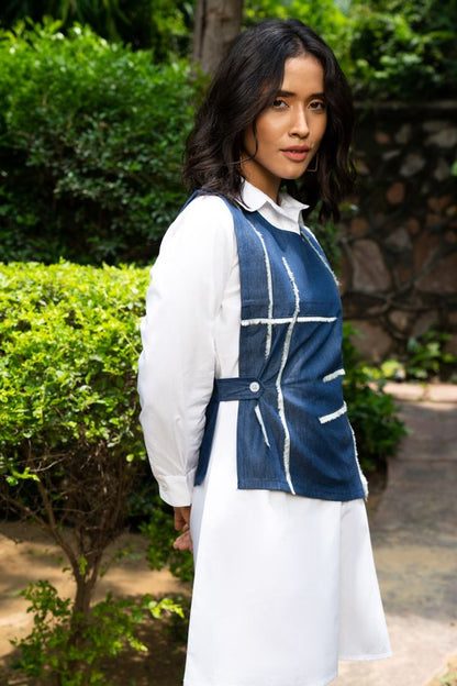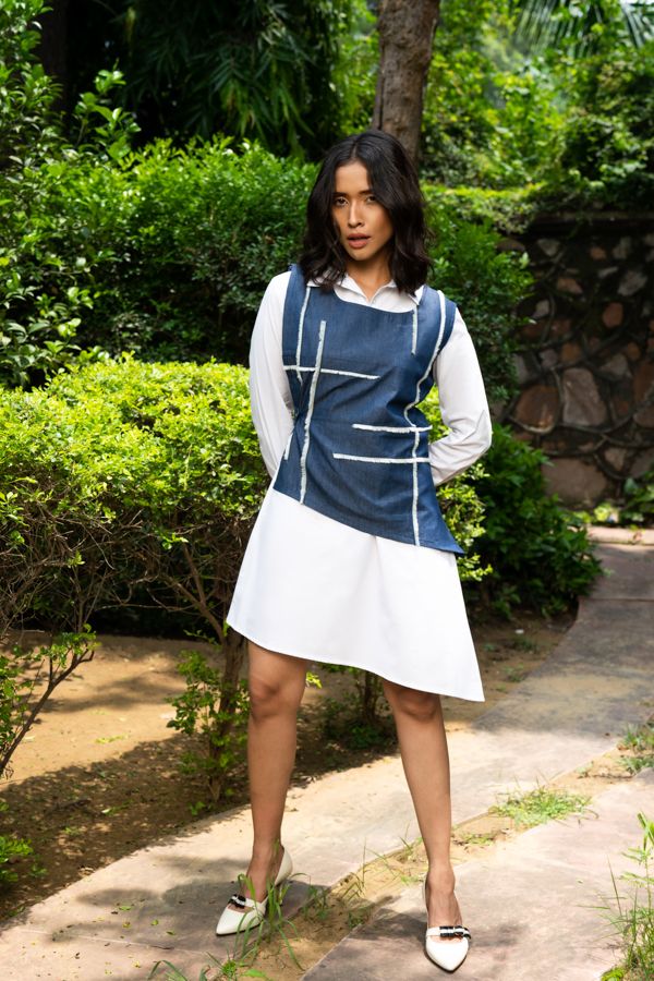 Blue denim and white colorblocked , double layered shirt dress