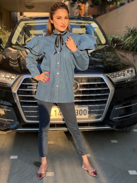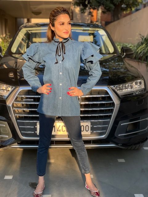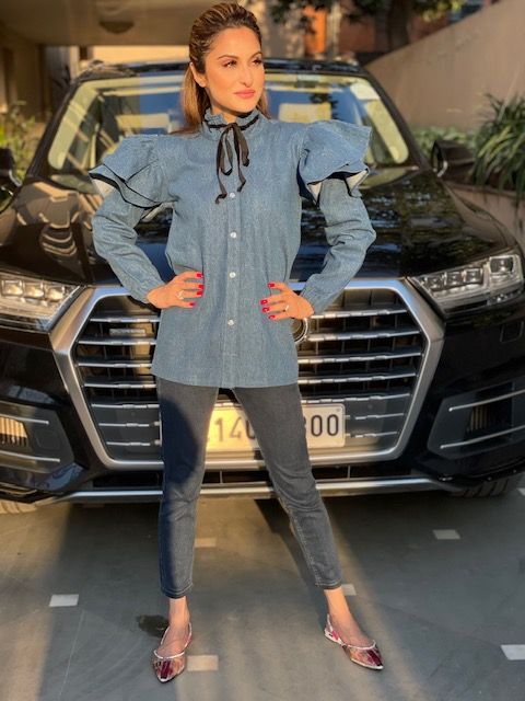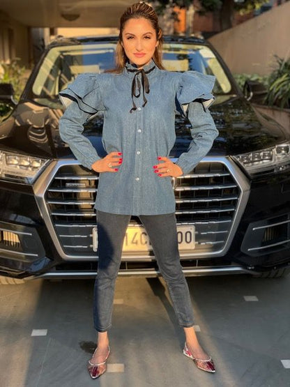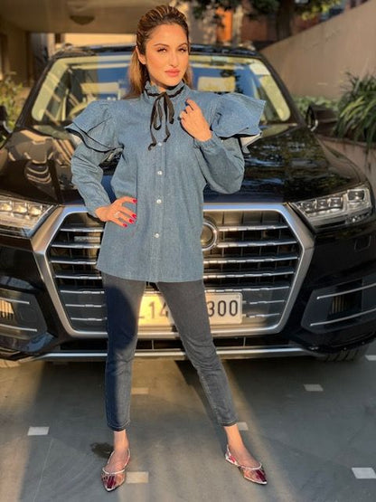 The denim construction of this Anysa shirt seamlessly contrasts with its whimsical tie collar, evoking its refined yet joyful approah.