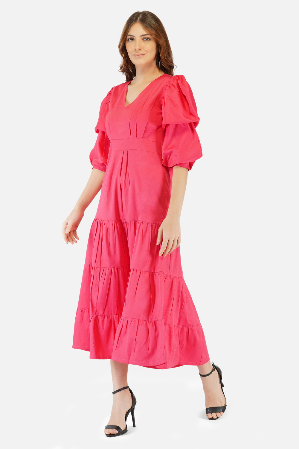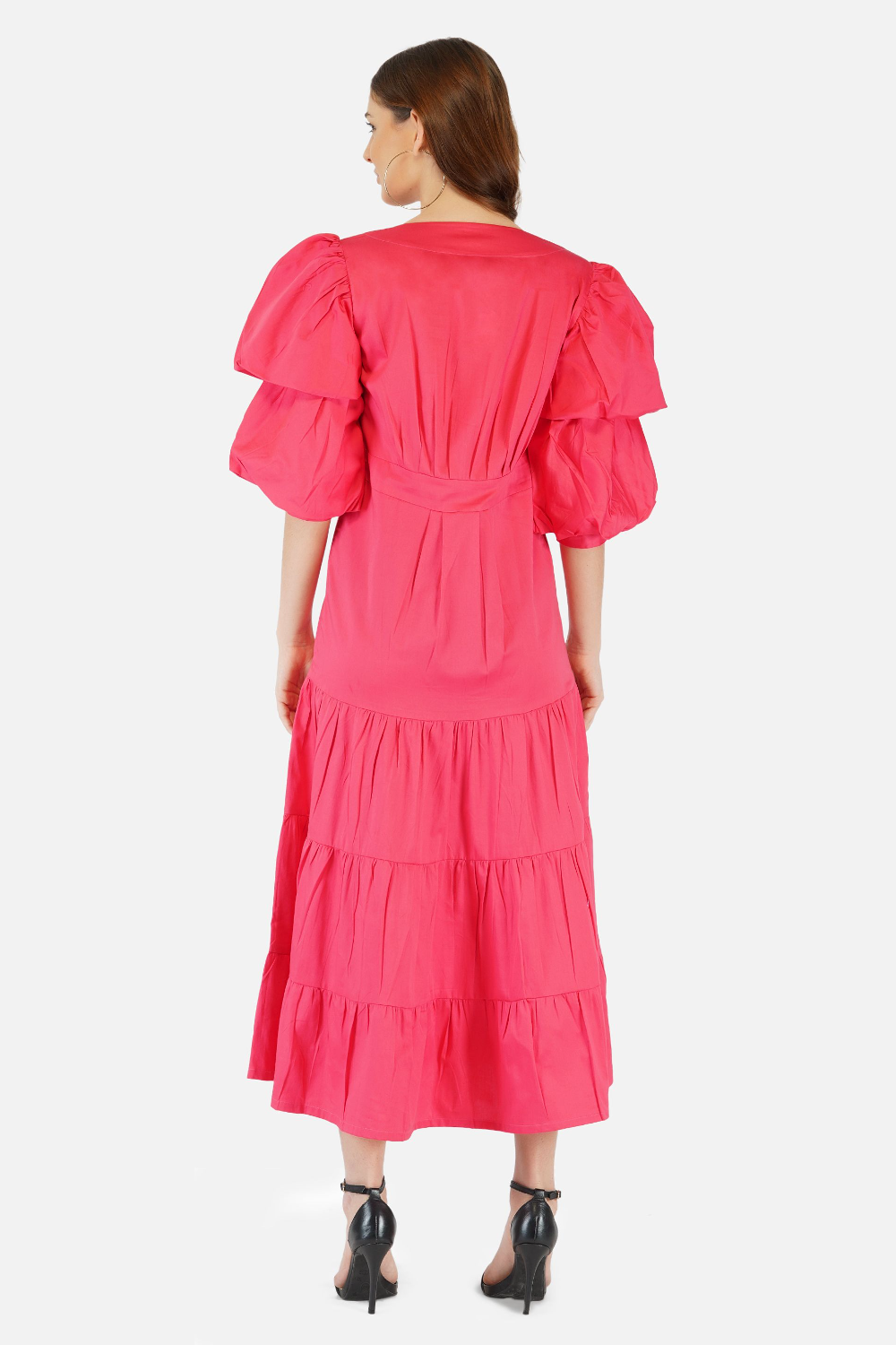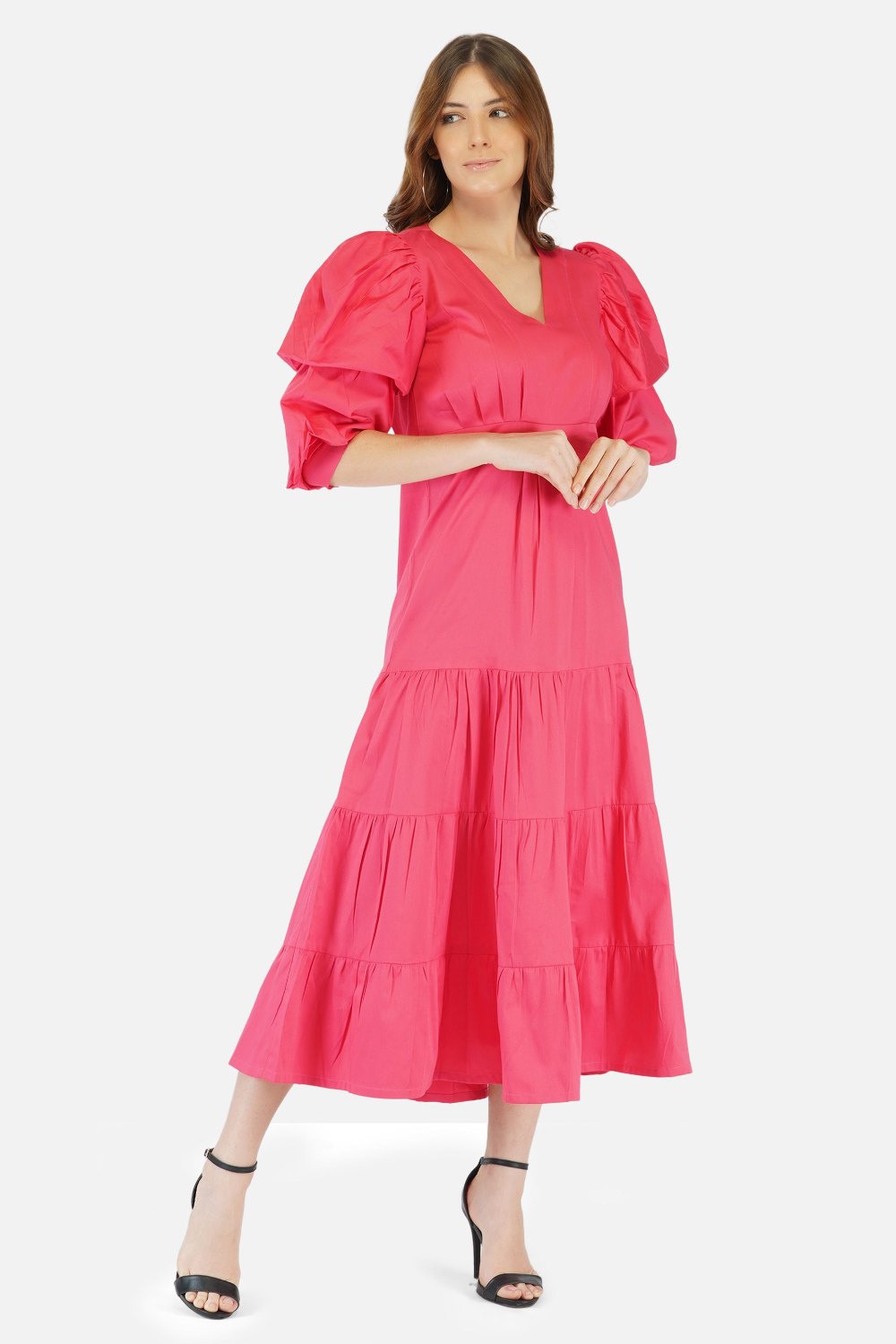 White v neck flowy midi dress with tiers and puffed sleeves . This flattering dress gives a great chic and feminine look