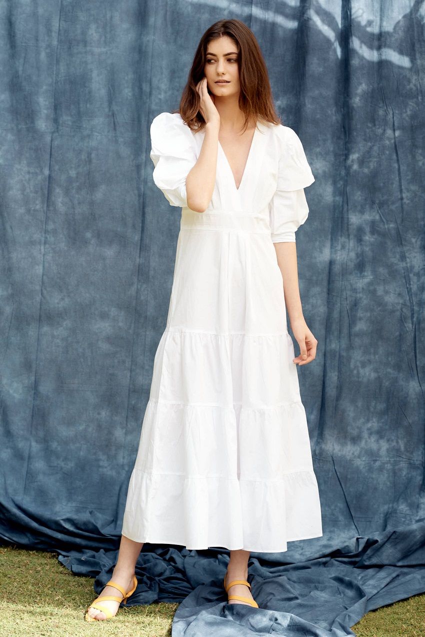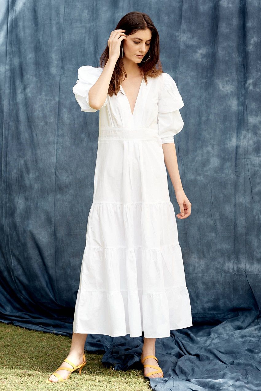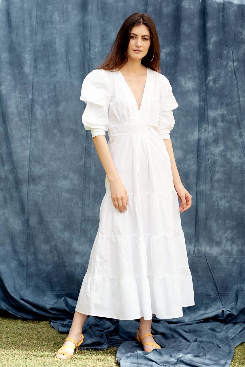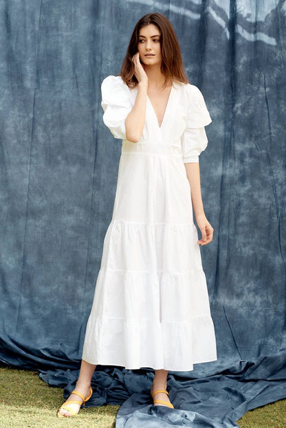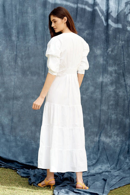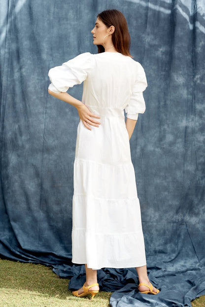 White v neck flowy midi dress with tiers and puffed sleeves . This flattering dress gives a great chic and feminine look