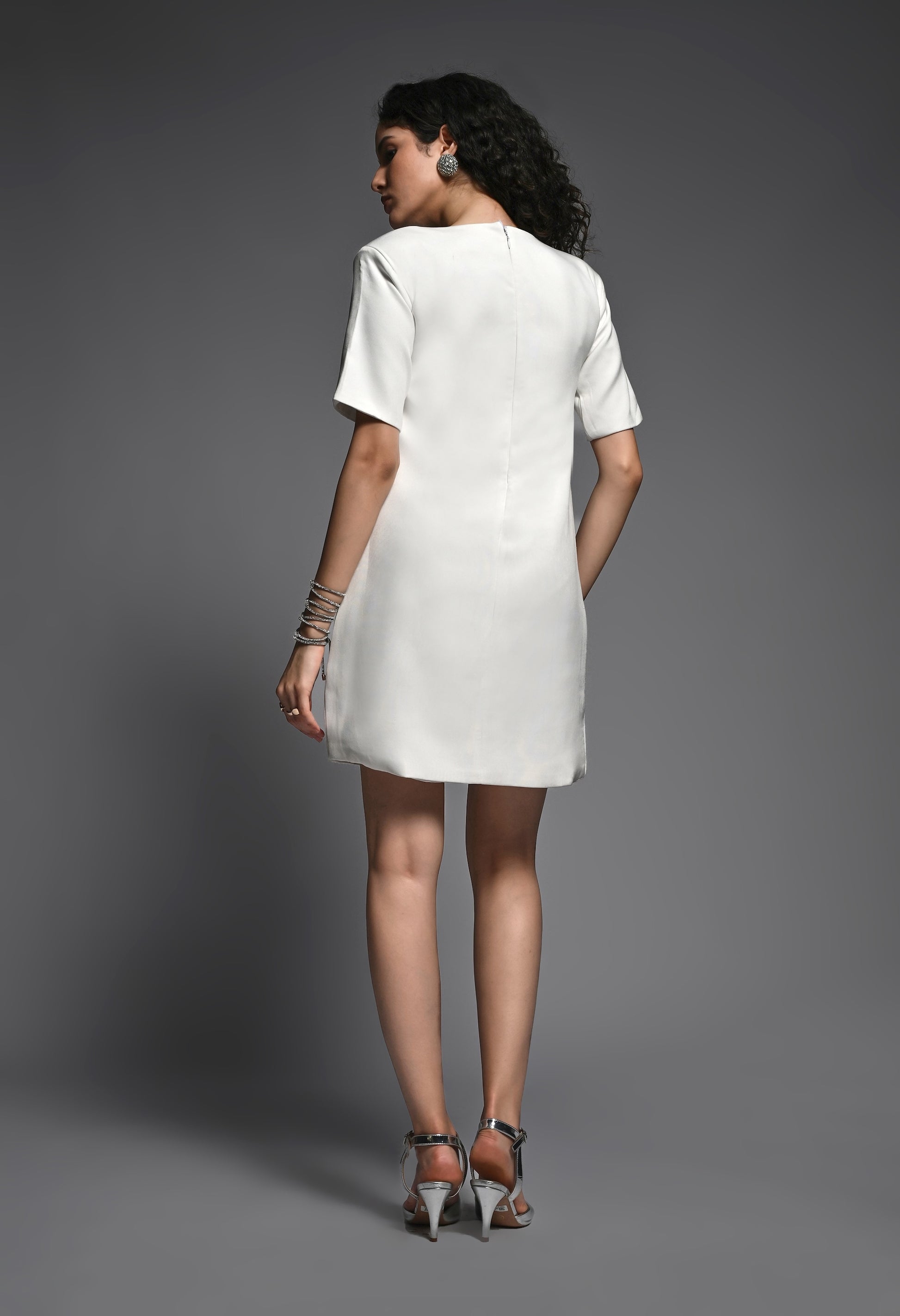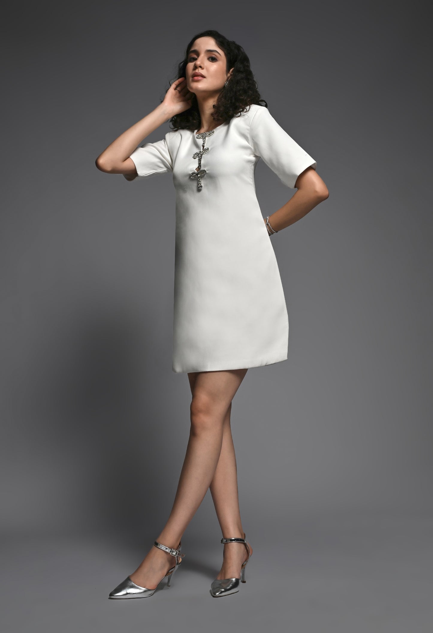 Crafted in soft fabric, this dress features beautiful swarowksi bows on the neck line and a classic A-line shape. Style it with heels or flats.