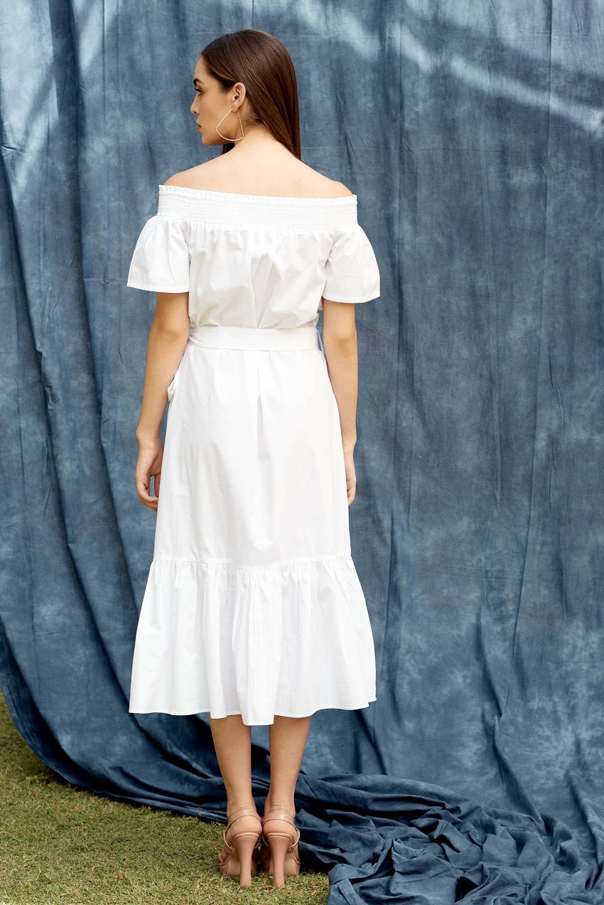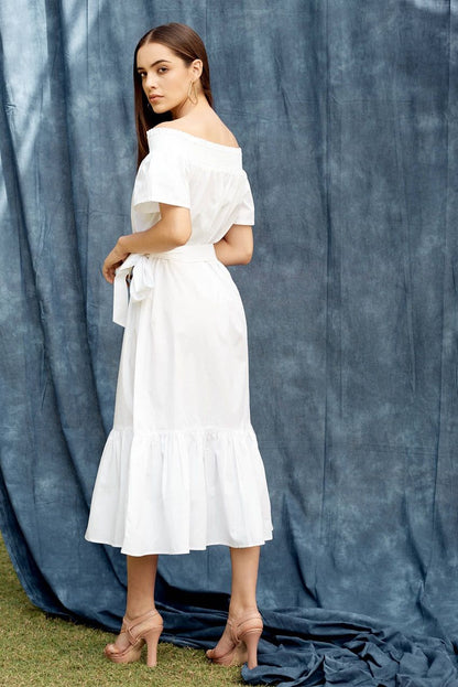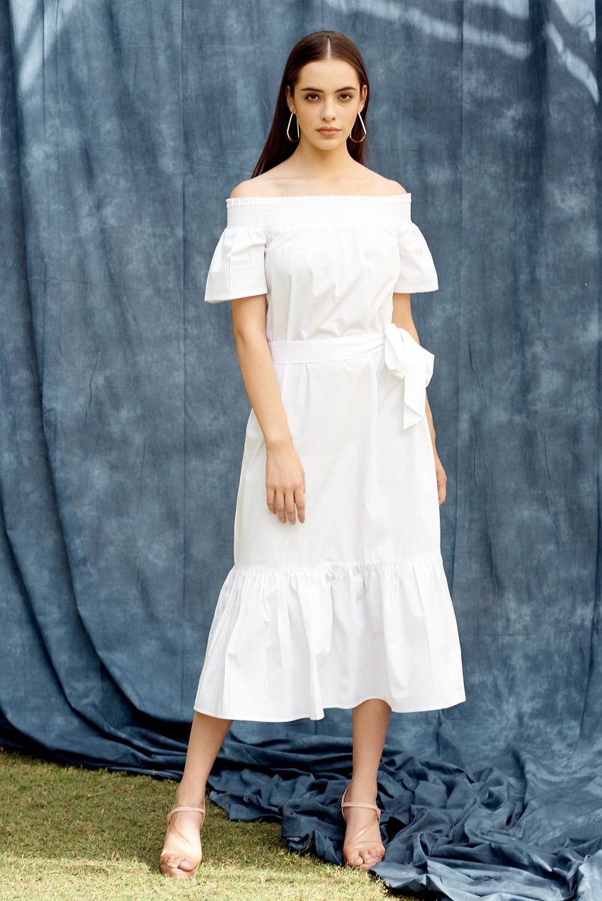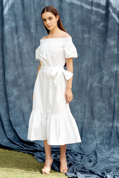 100% Cotton white off shoulder dress with a belt and smocked neck detailing . With subtle sleeves and a flowy A-line, this dress exudes panache.
