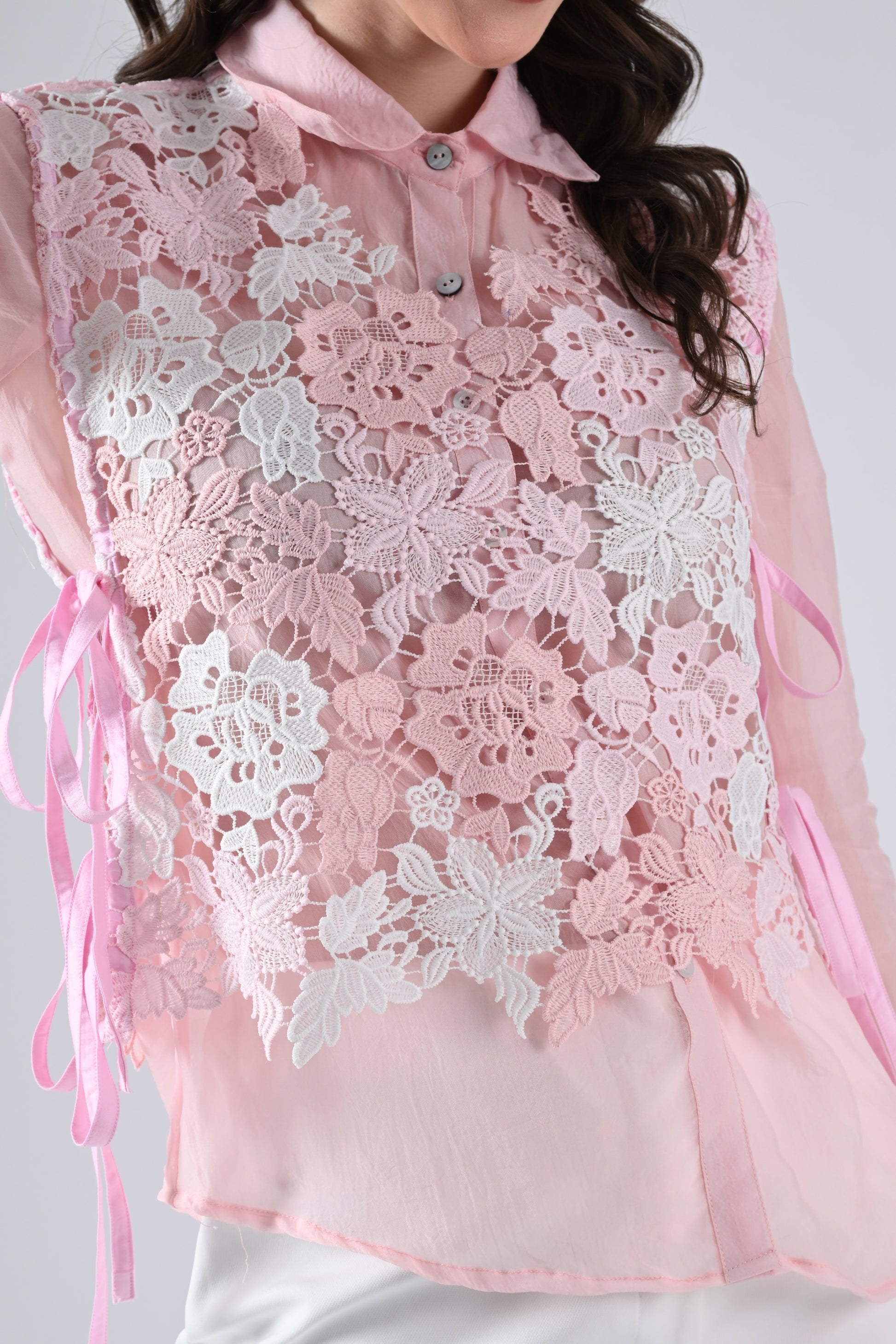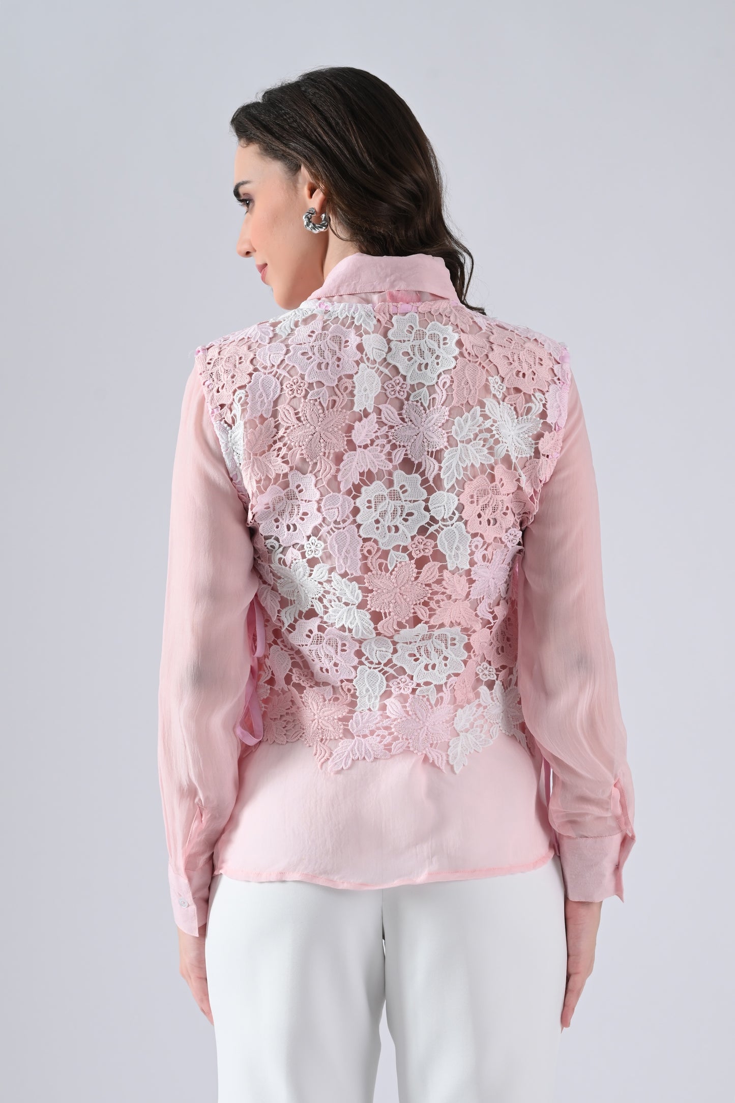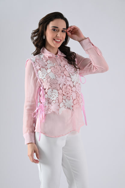 Pink Organza Shirt with Lace-work Cape and Tie Strings