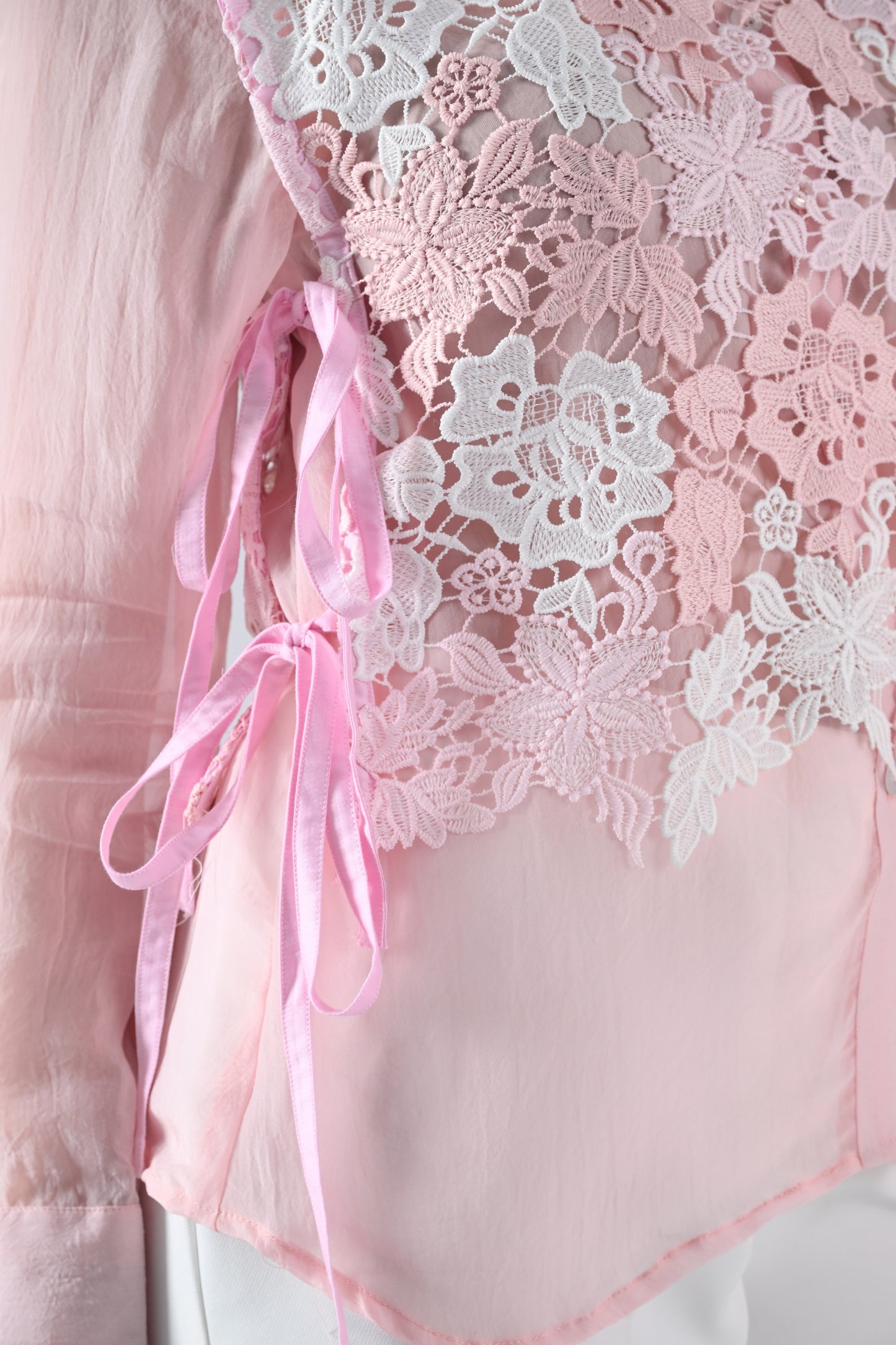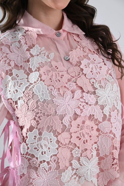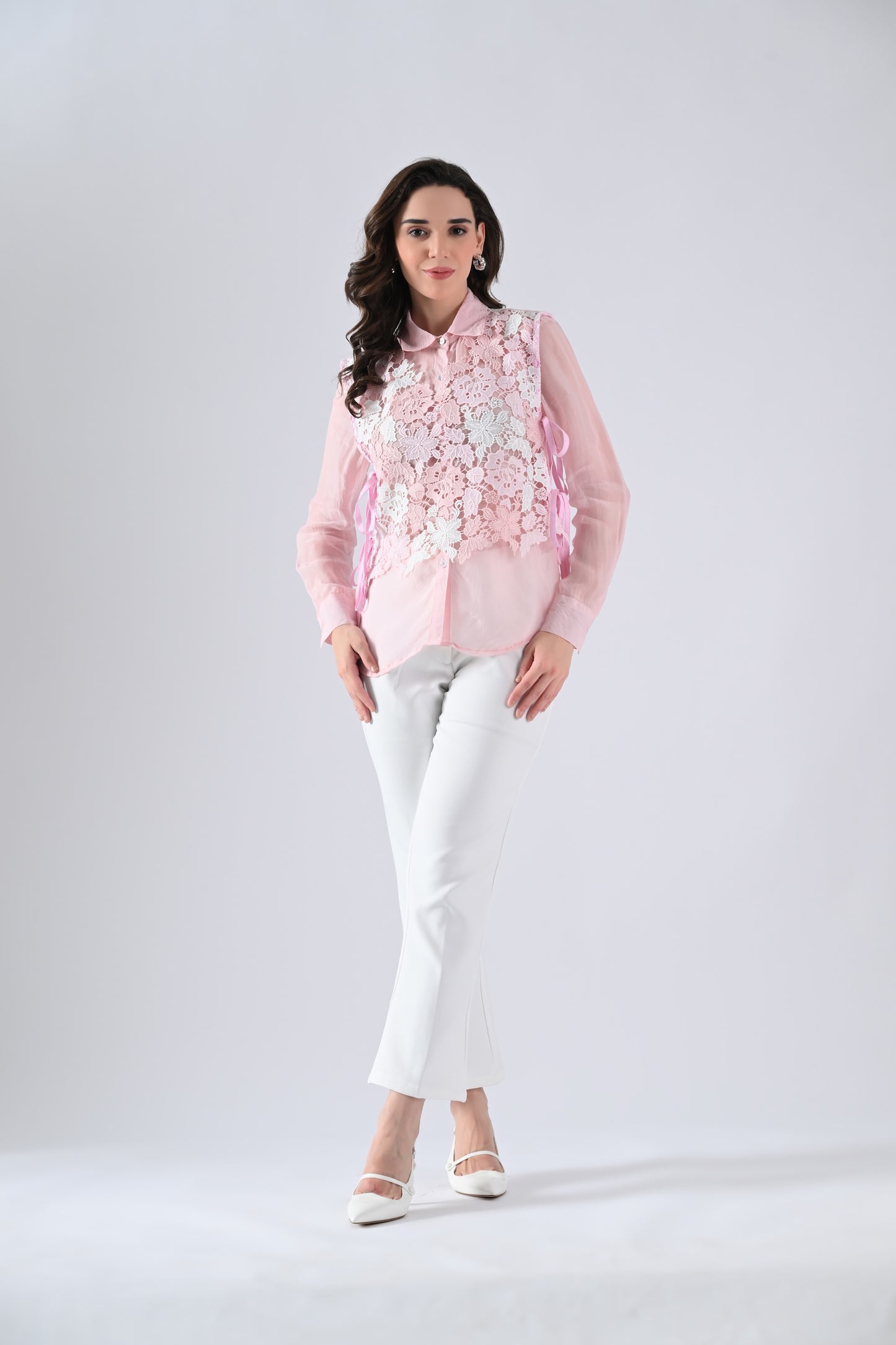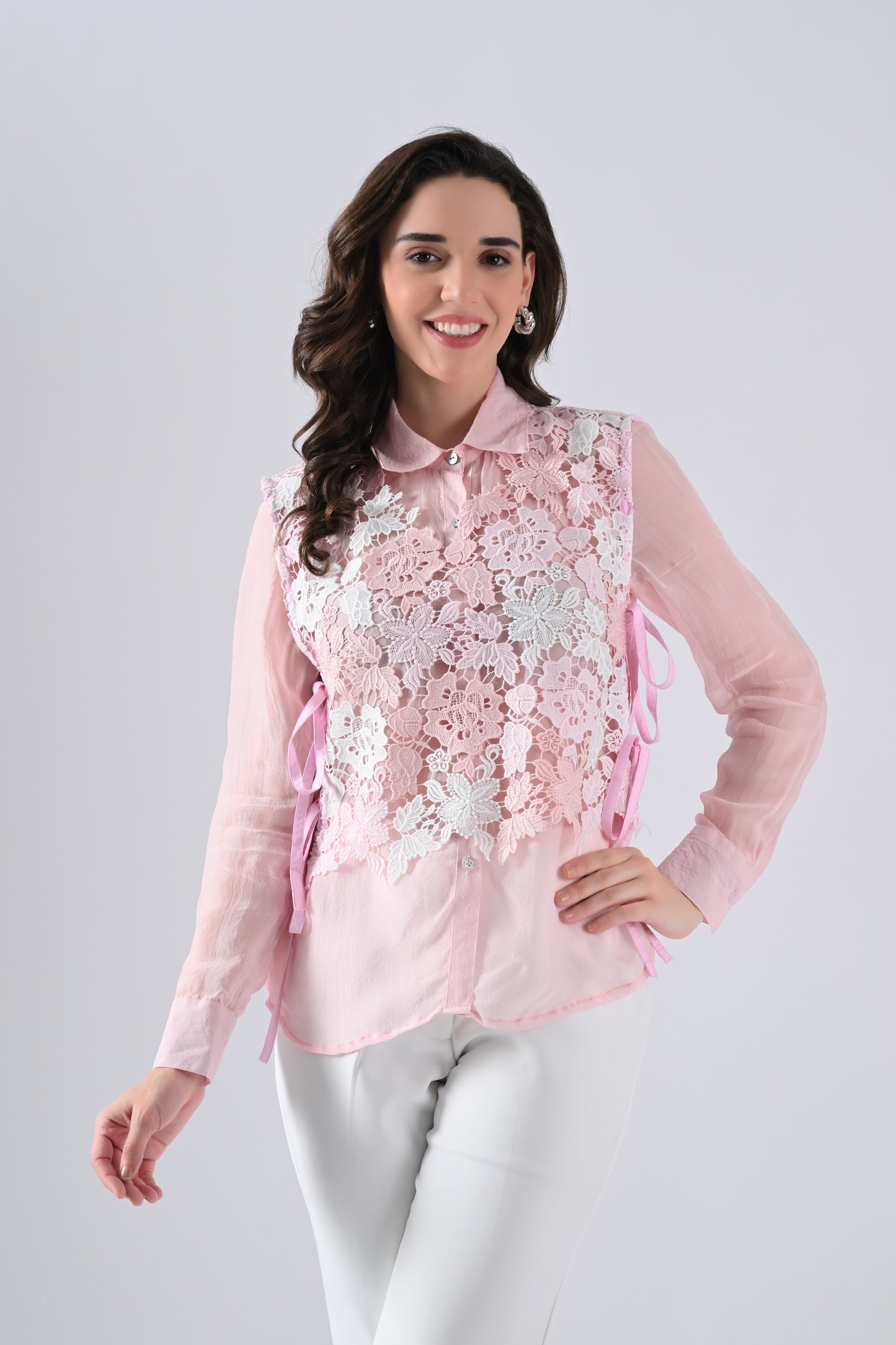 Pink Organza Shirt with Lace-work Cape and Tie Strings