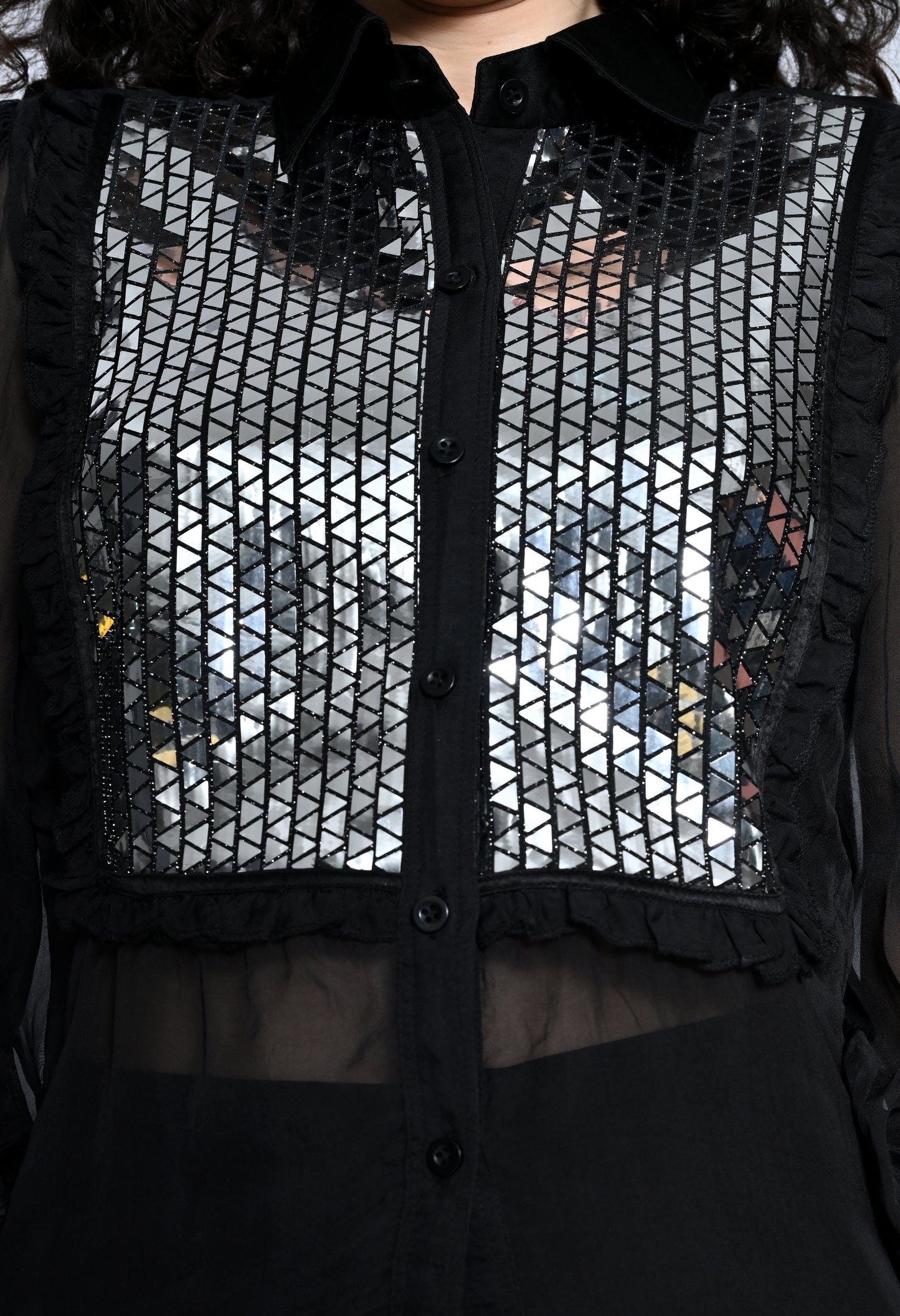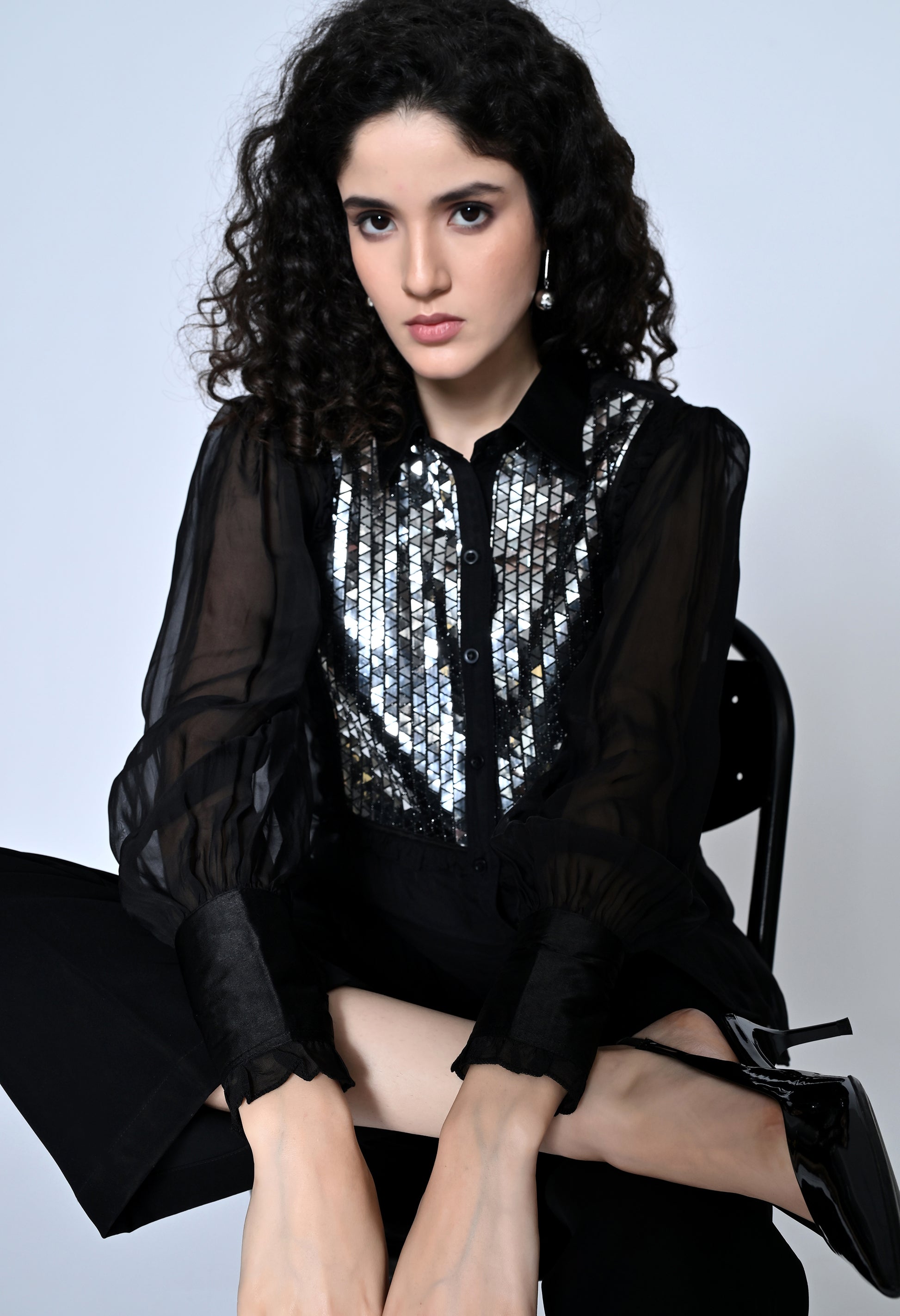 Black shirt crafted in soft organza features front shimmer detailing and pointed collar. We suggest teaming it with a tank top and pants.