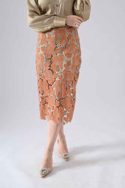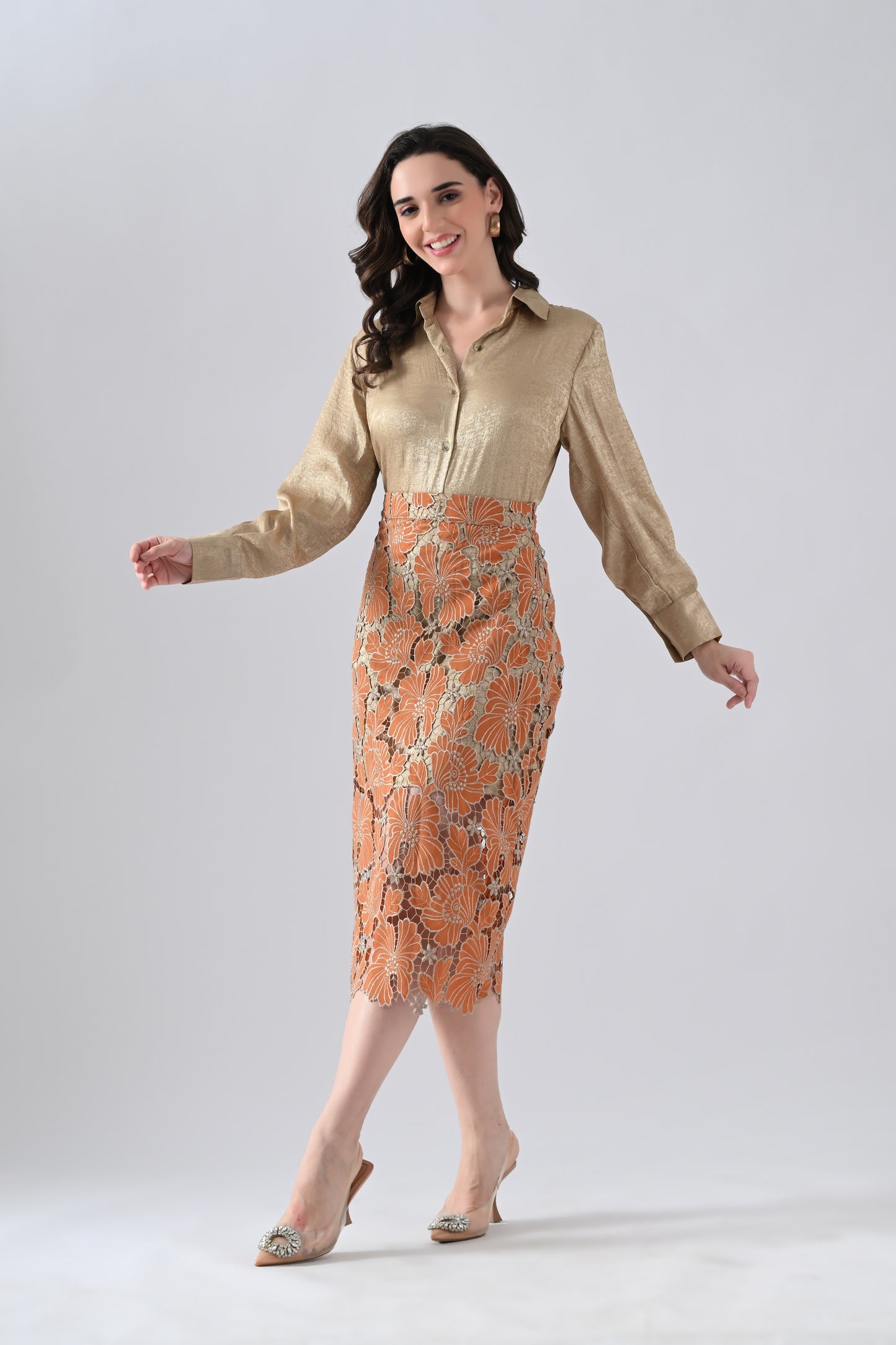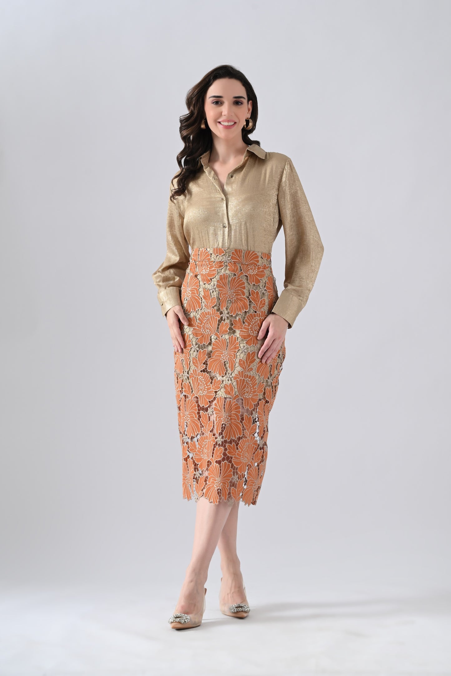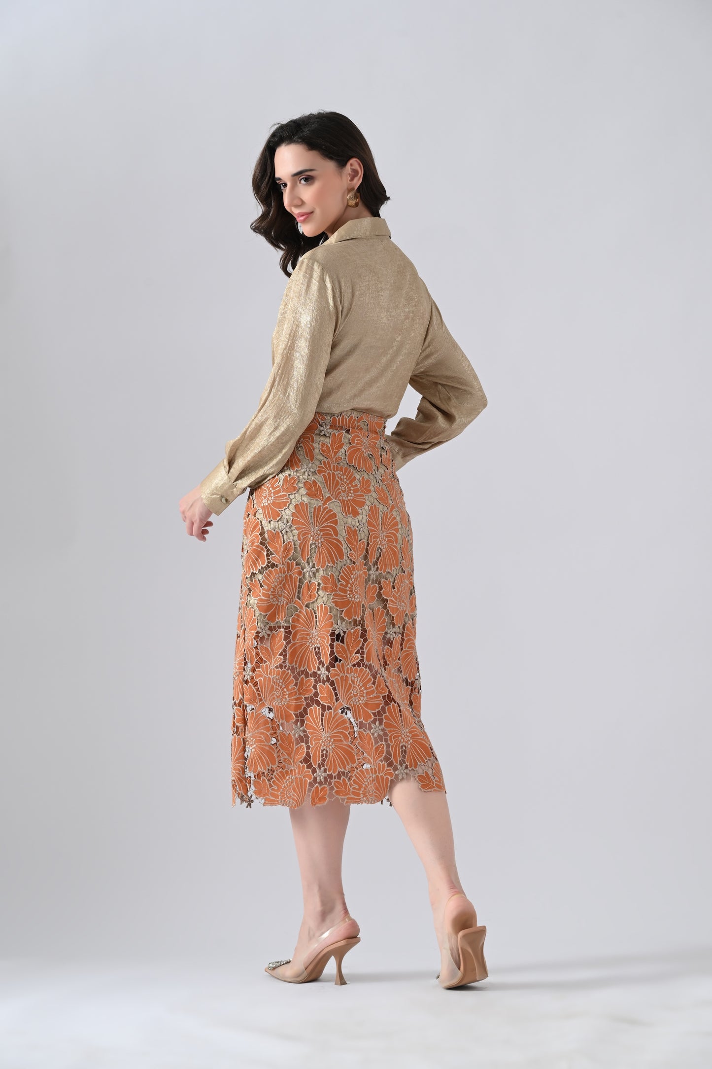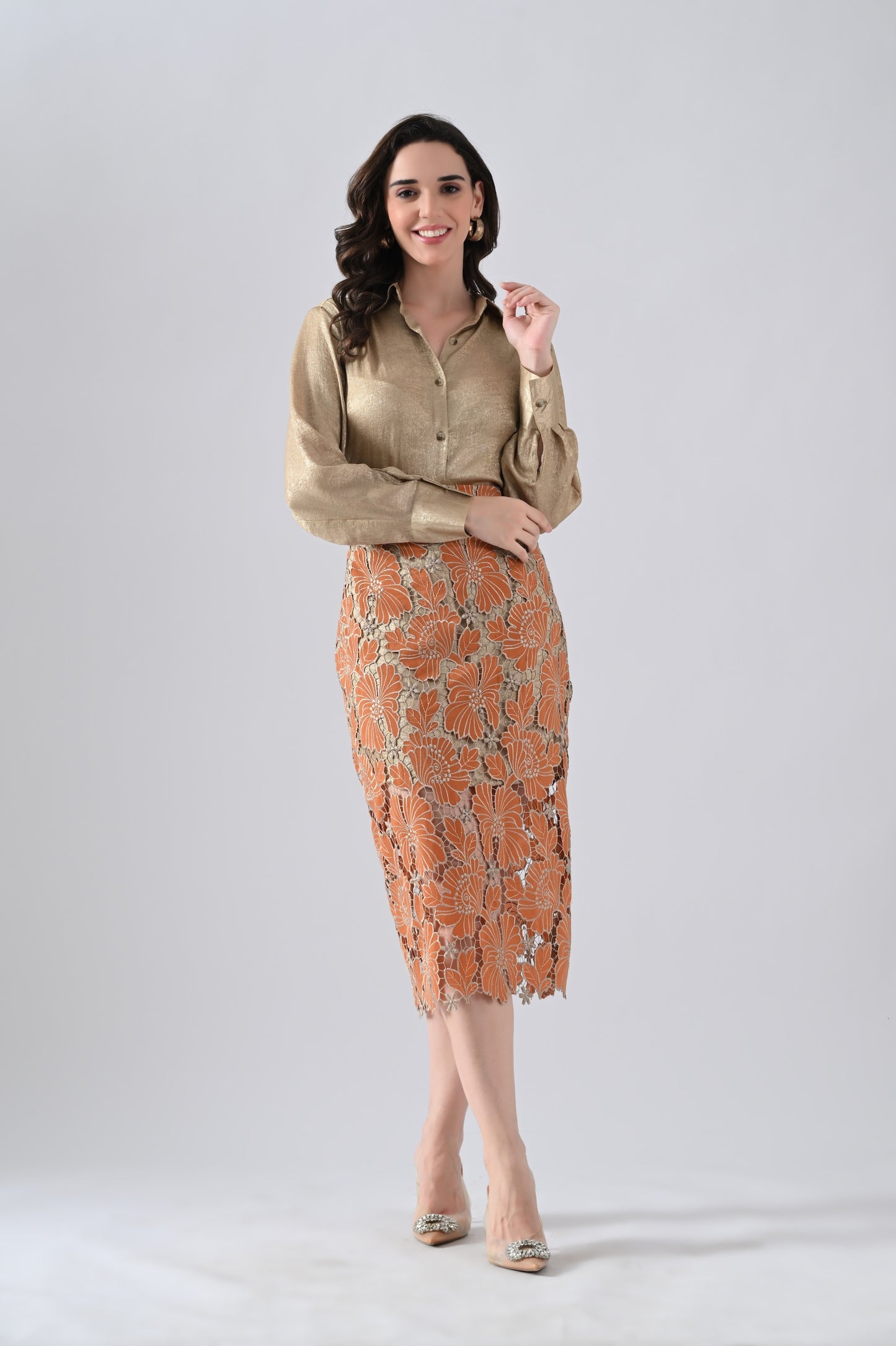 Rust Floral Lace Detailed Straight Skirt with Golden Shirt