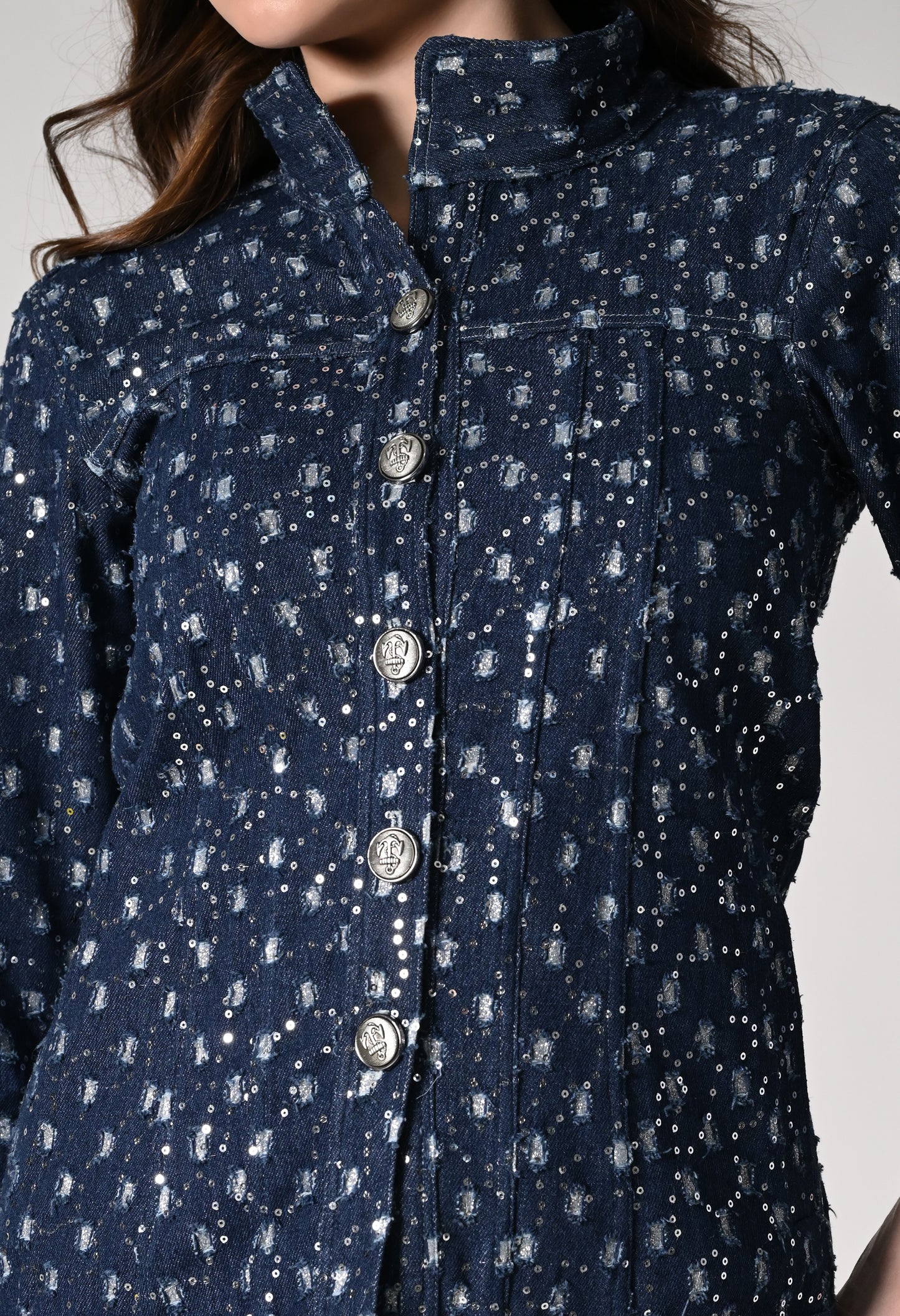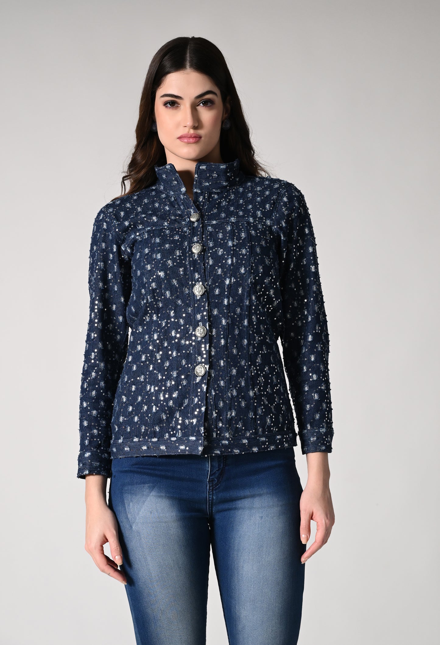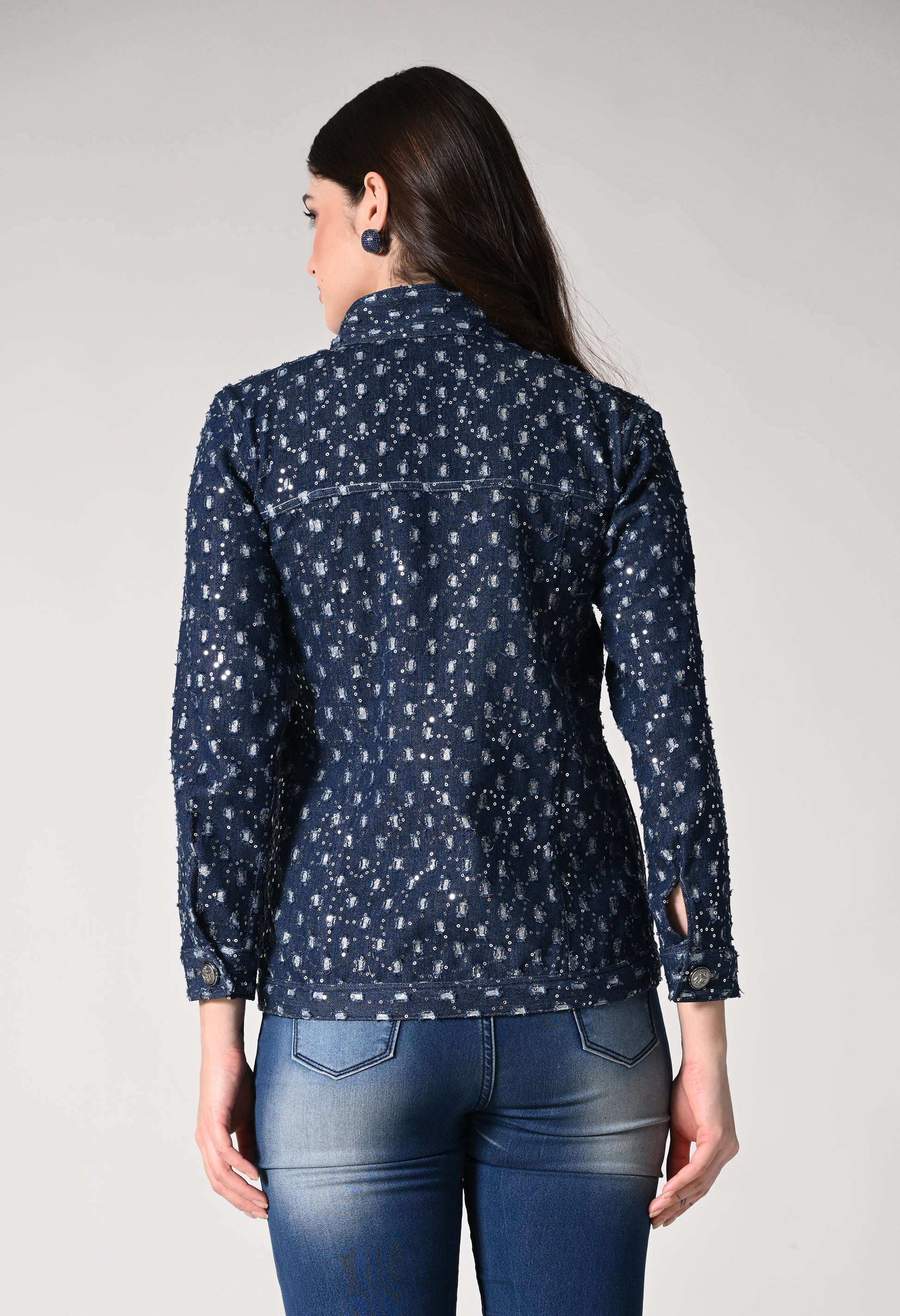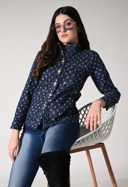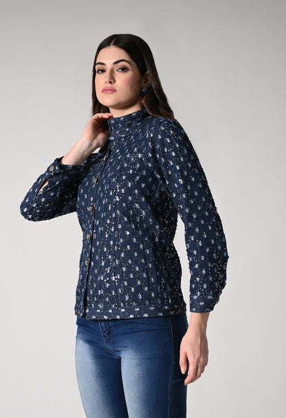 Dress up in this shimmer denim jacket which has a retro appeal. Denim jackets just got a whole lot more fun