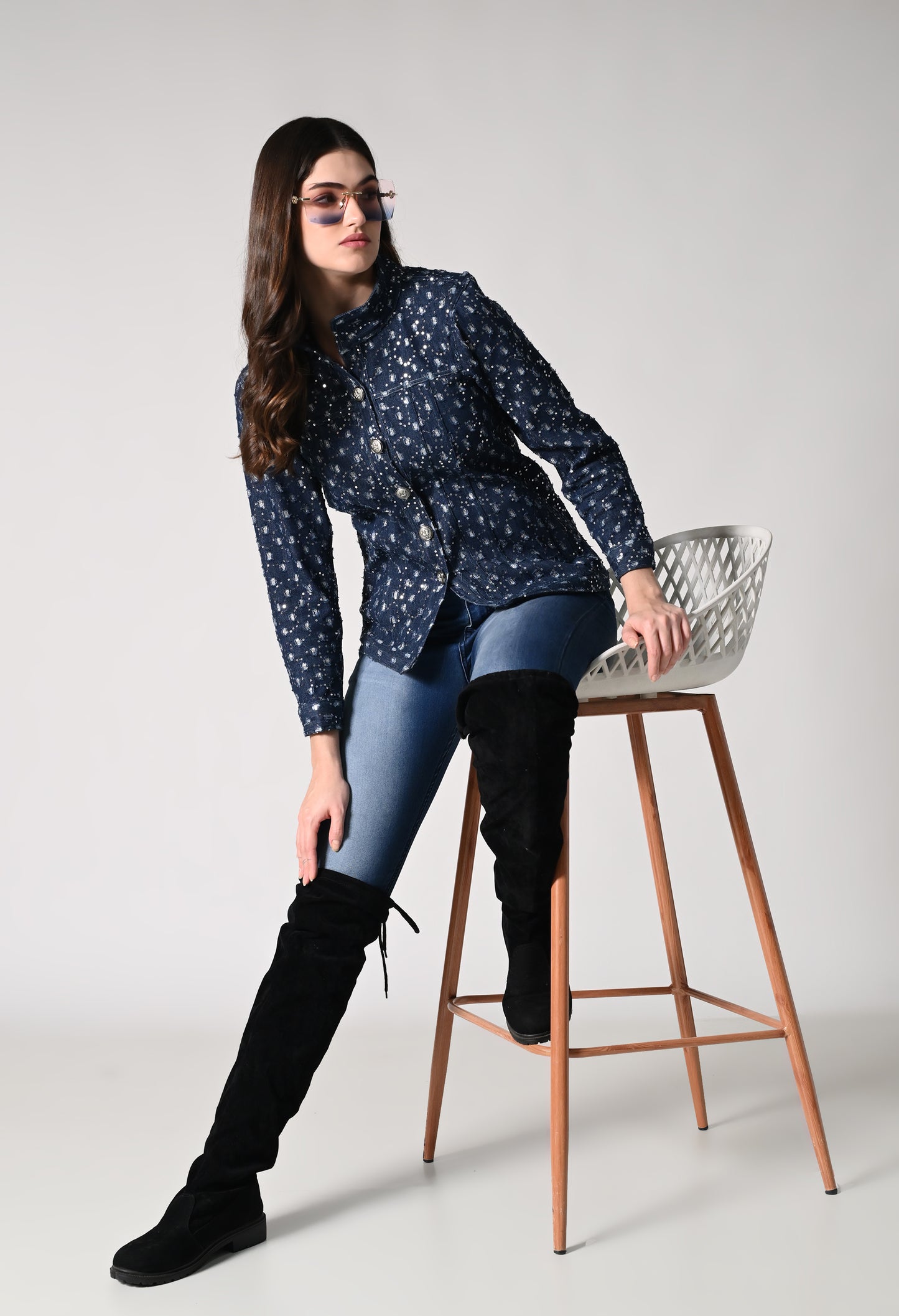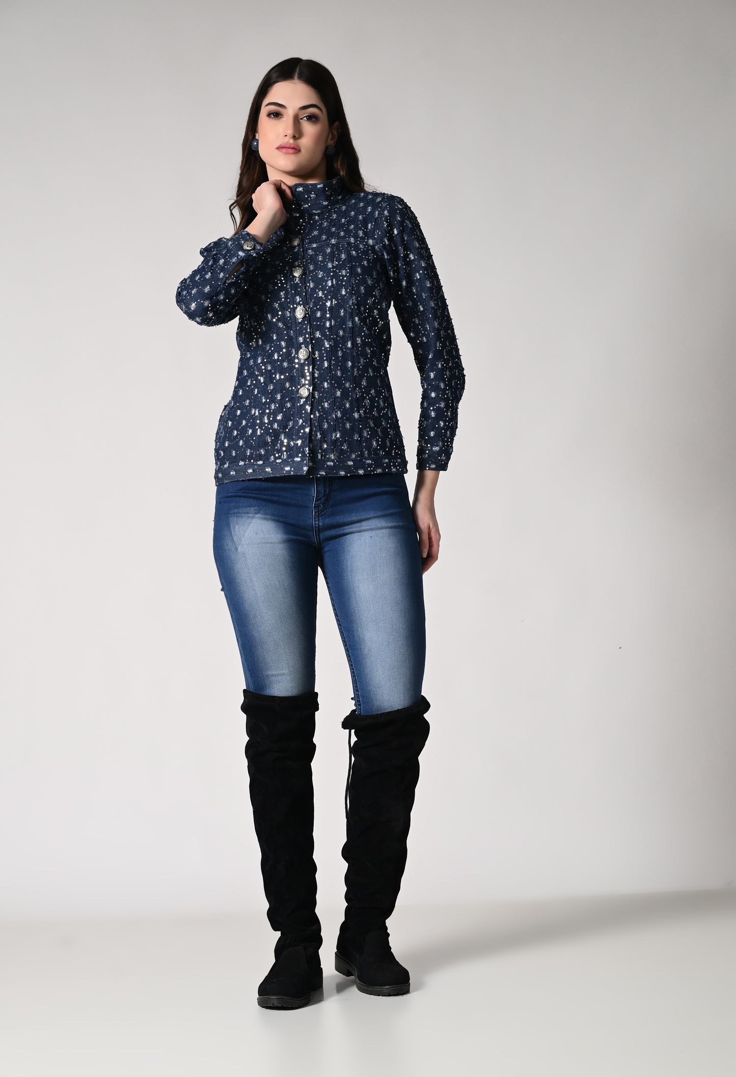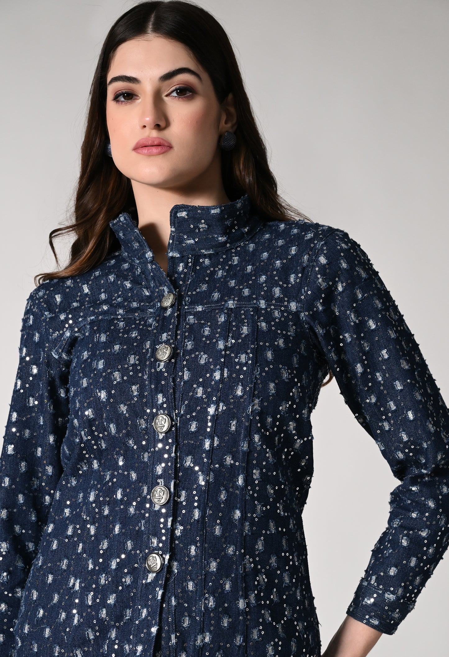 Dress up in this shimmer denim jacket which has a retro appeal. Denim jackets just got a whole lot more fun