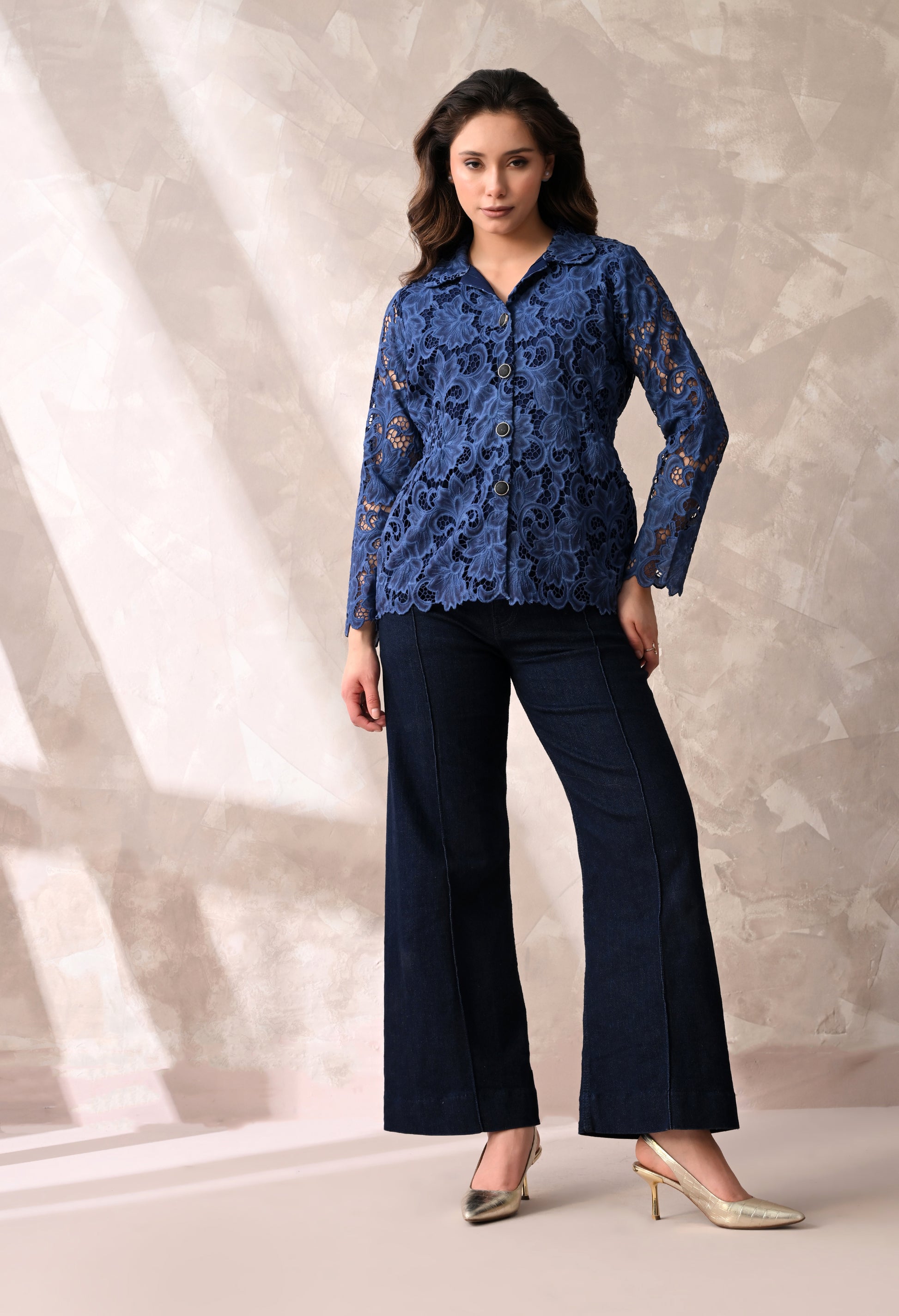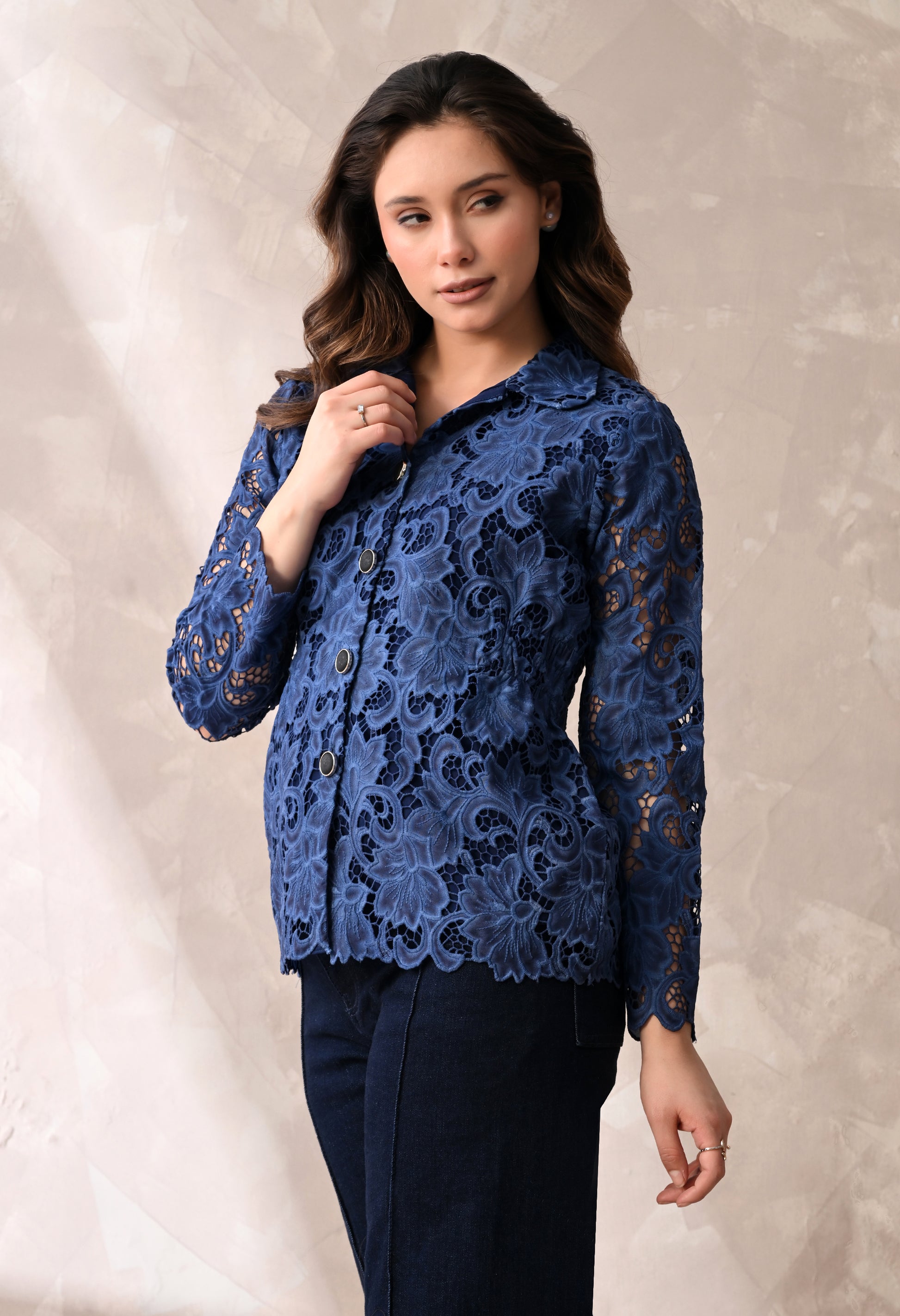 Feminine and refined, this floral lace button-down shirt features intricate cutwork lace and a flattering elasticated waist that softly cinches the silhouette. Designed with a classic collar, full button front, and scalloped lace sleeves, it blends elegance with modern structure. Perfect for pairing with tailored trousers or skirts for a polished day-to-evening look.
