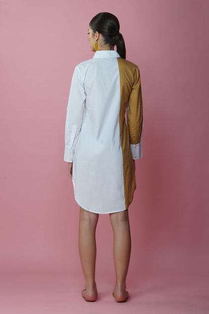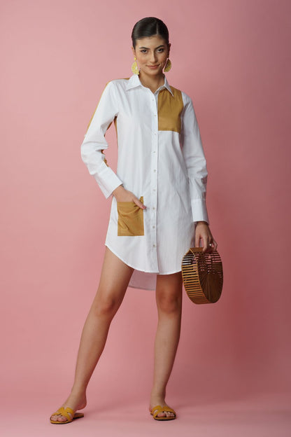 Urban style shirt dress with with mustard patch pockets and mustard detailing at the back. Get sunset ready with this stylish yet casual shirt dress