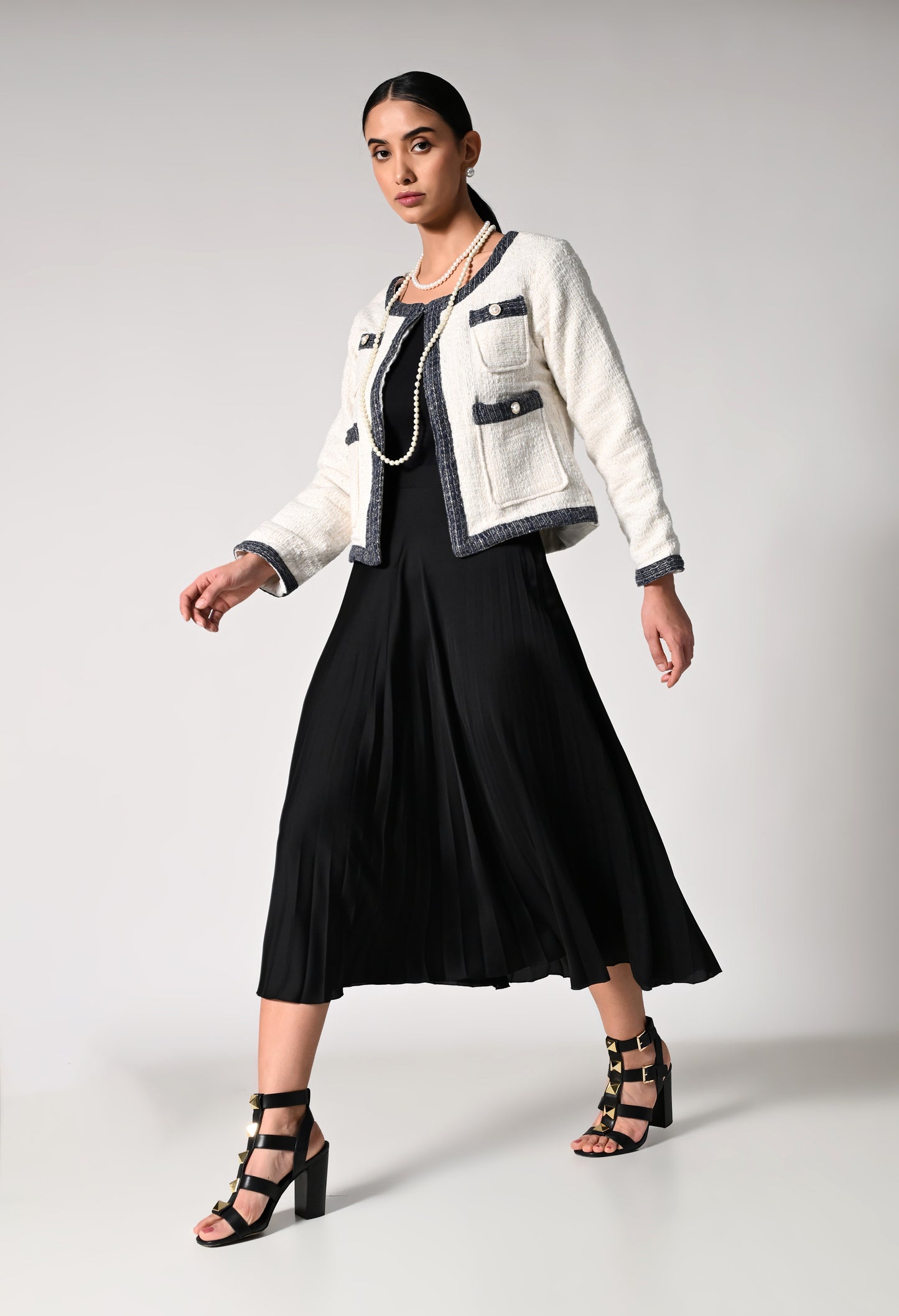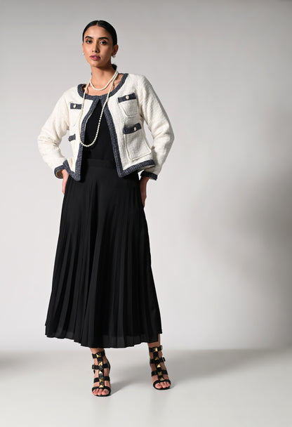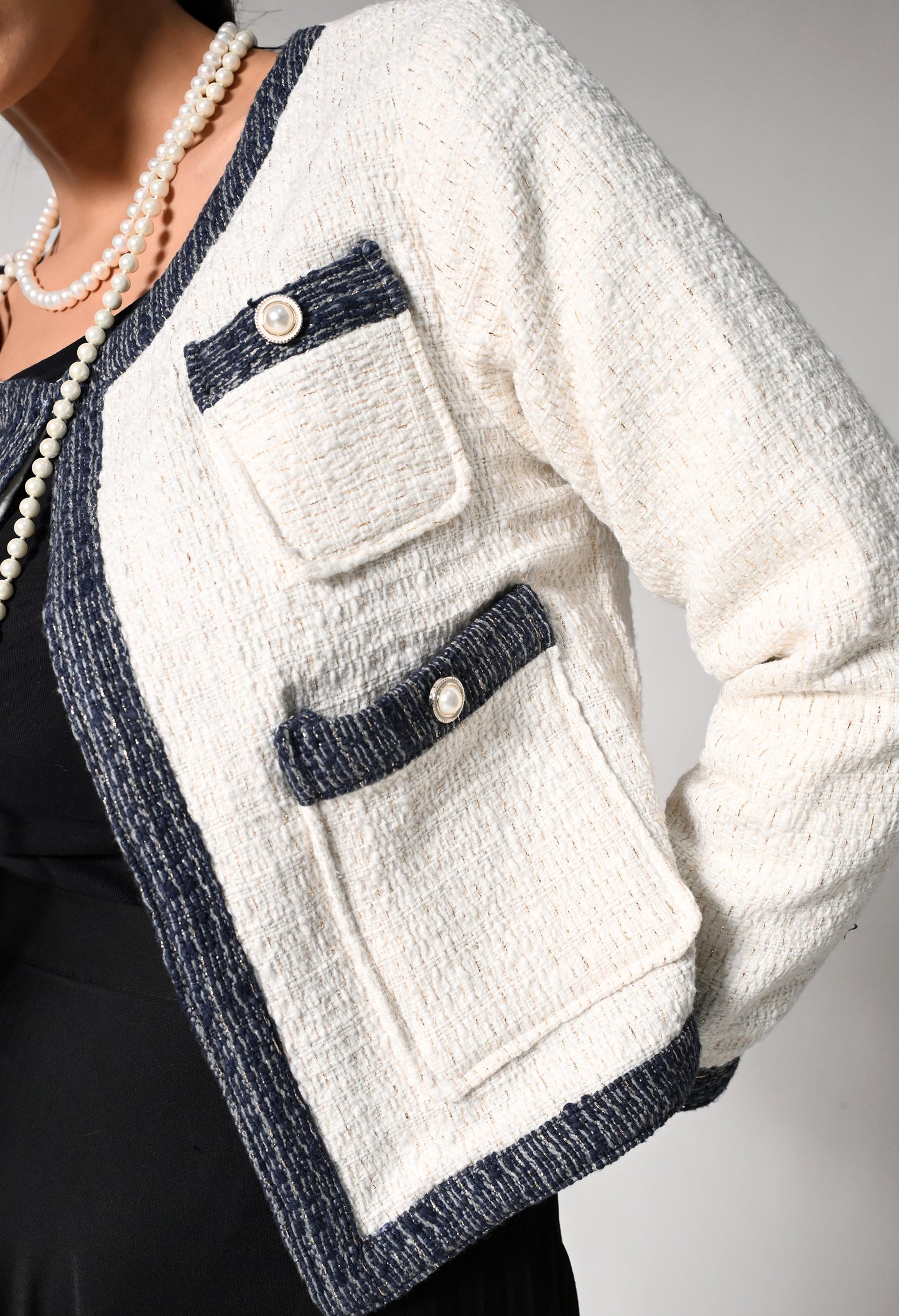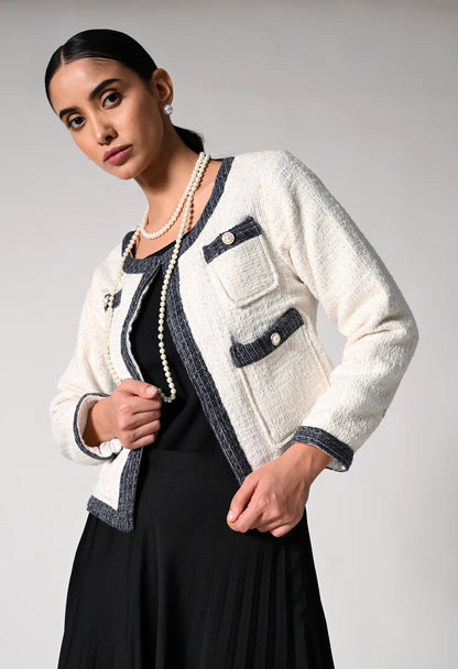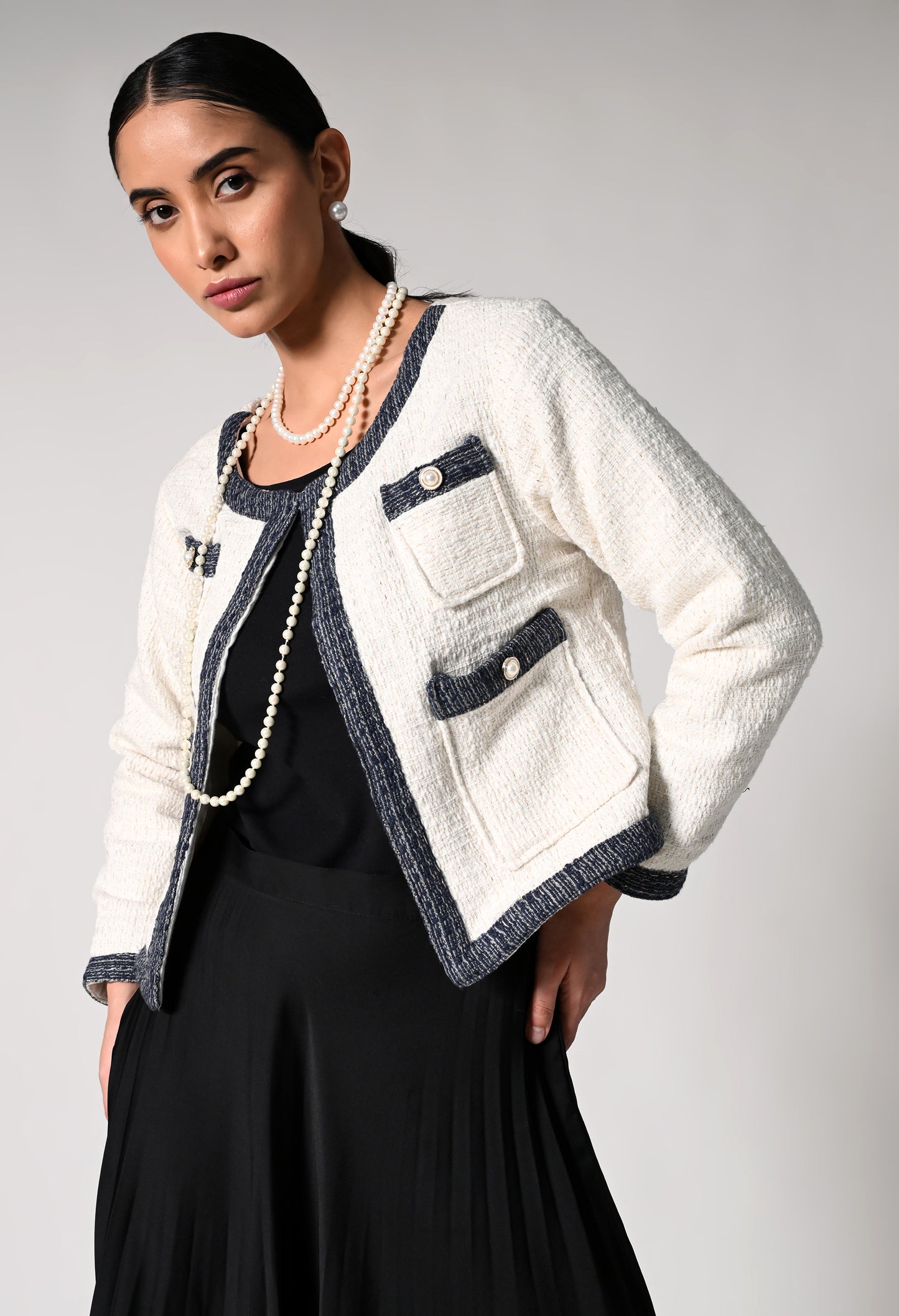 Come winter, there's nothing we love more than being swaddled in a tweed jacket. Cream Jacket with black borders makes it extra special