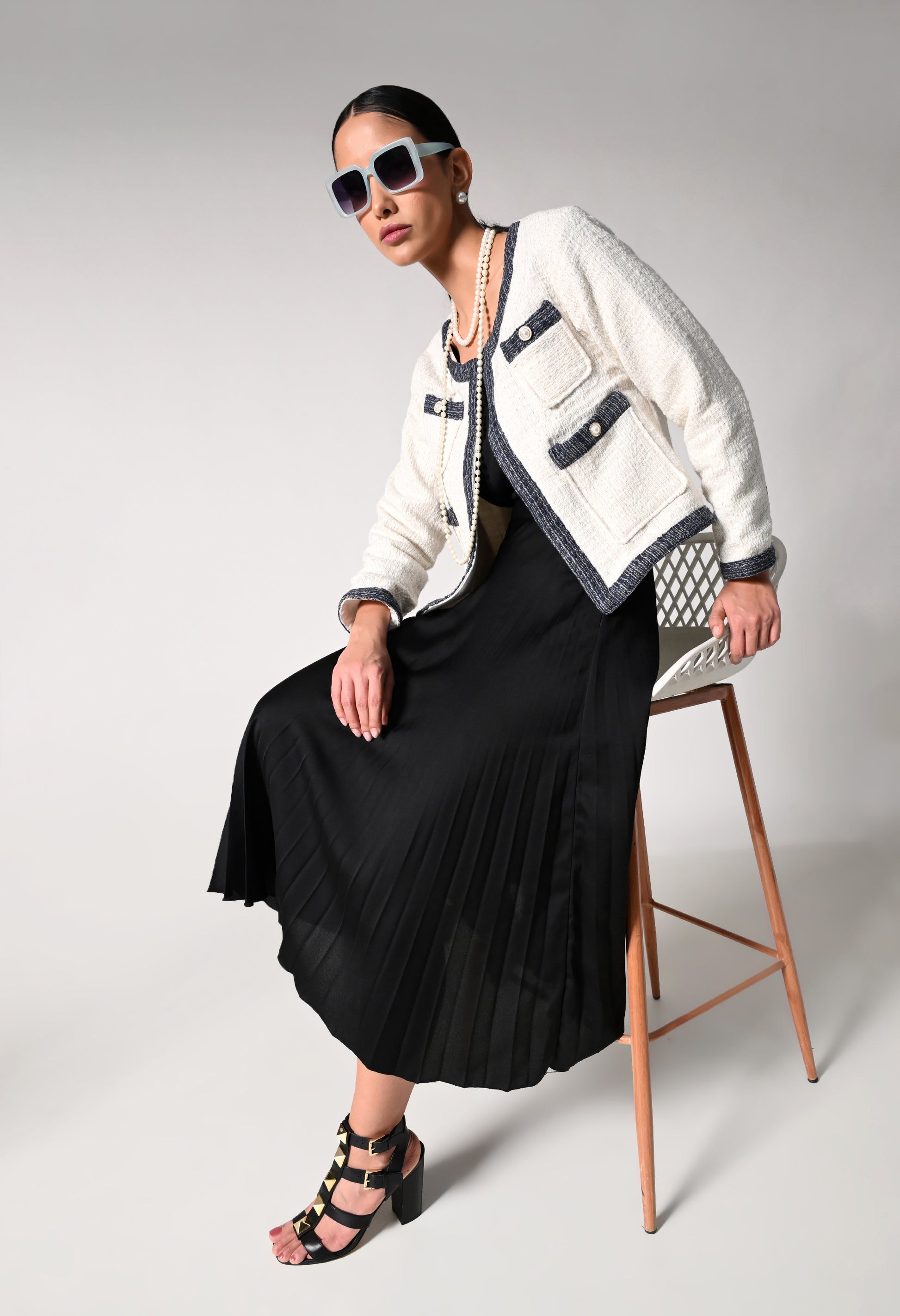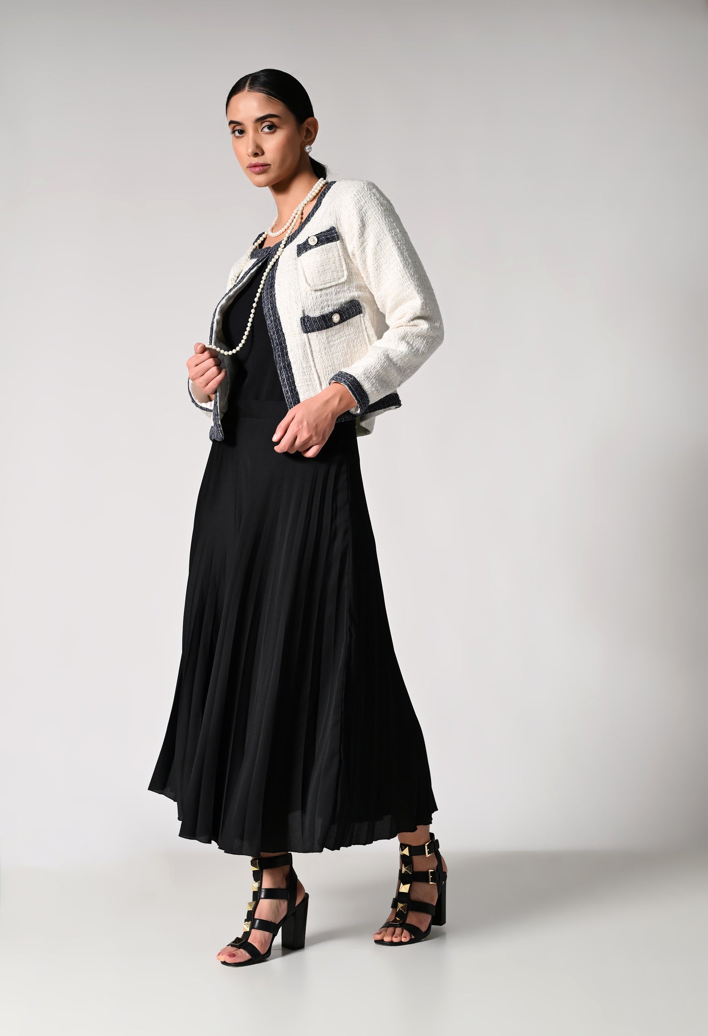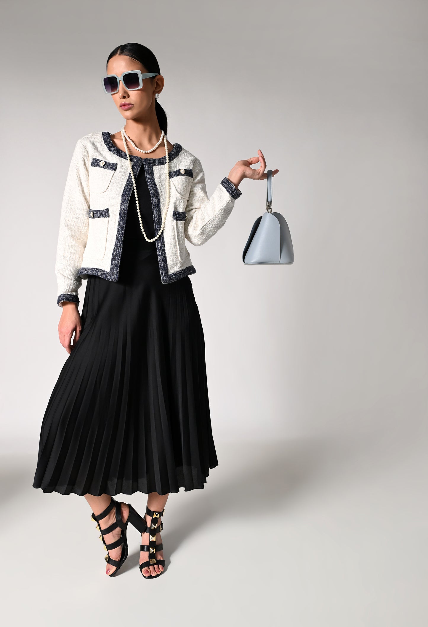 Come winter, there's nothing we love more than being swaddled in a tweed jacket. Cream Jacket with black borders makes it extra special