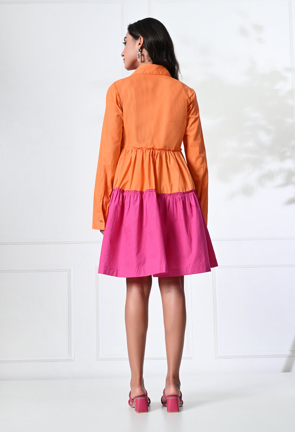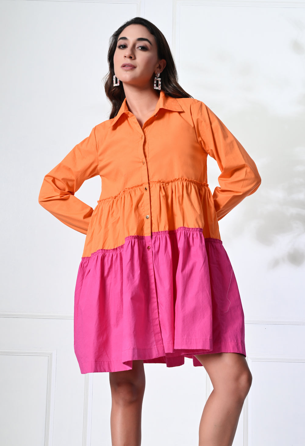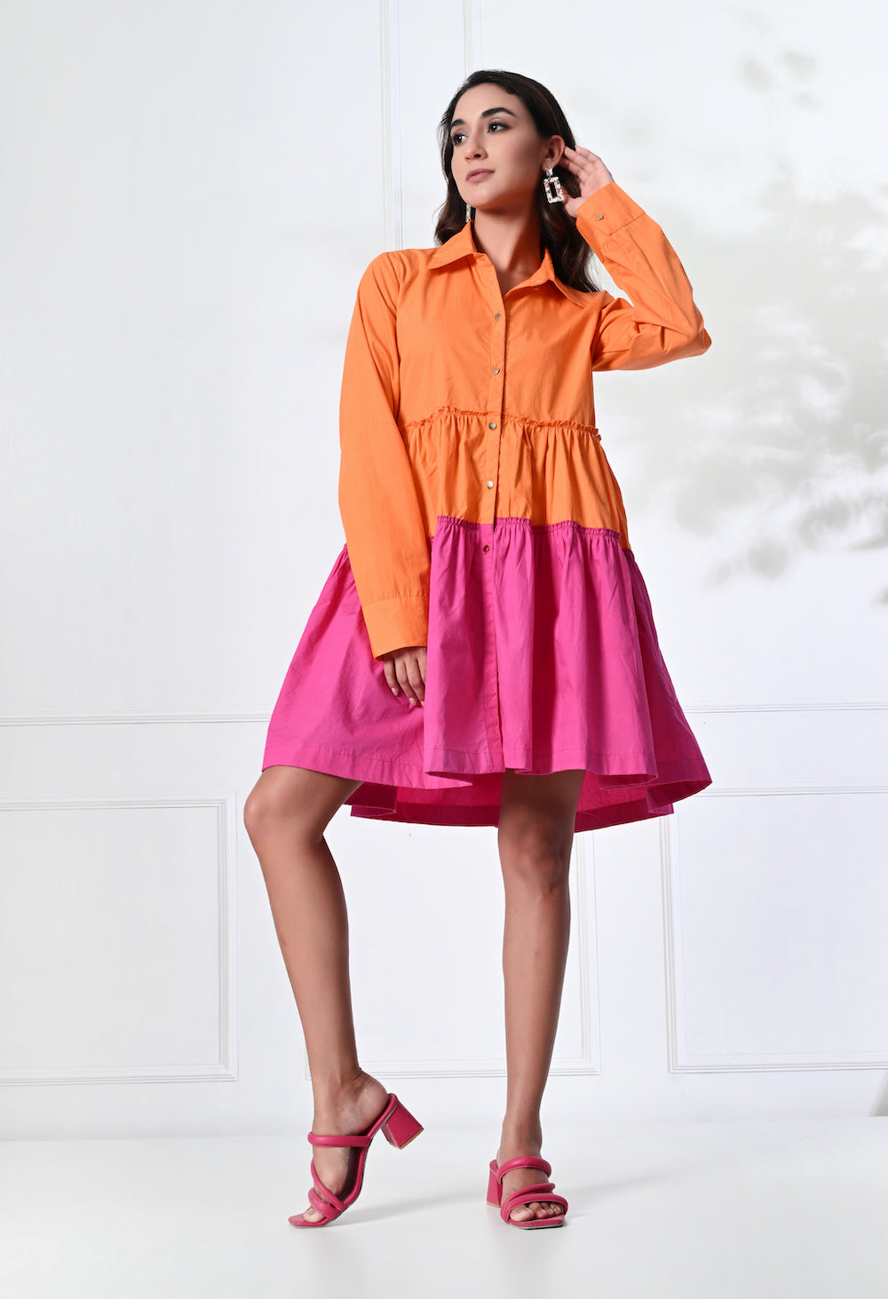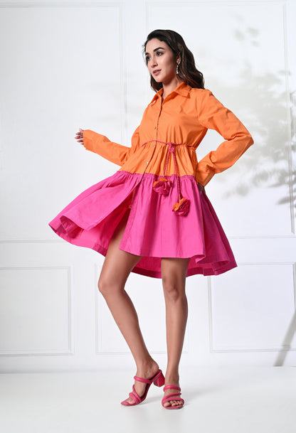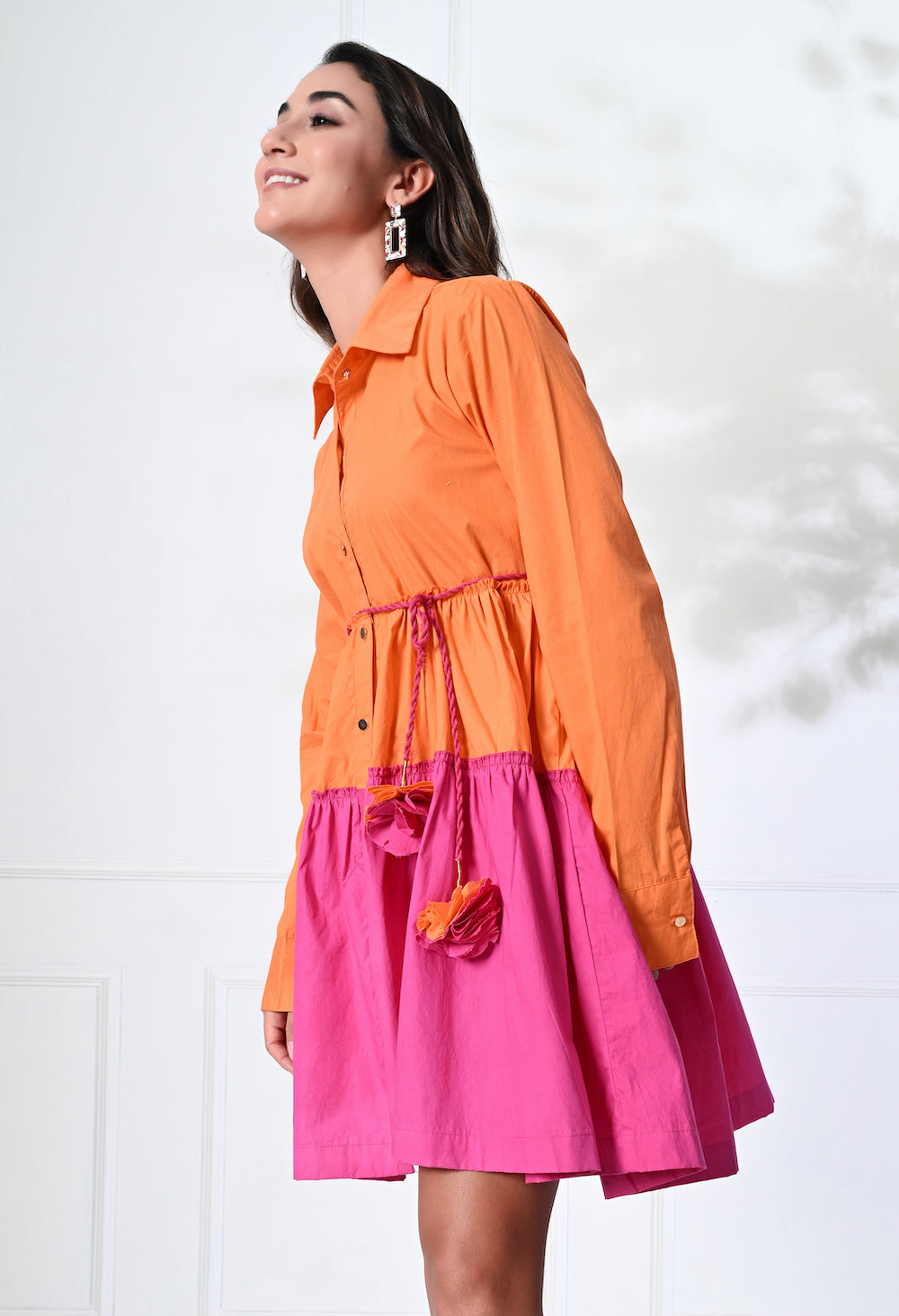 This charming piece blooms with vibrant colours of oarange and pinks. The flared skirt dances with every step, making it a perfect fusion of vibramnce and feminity