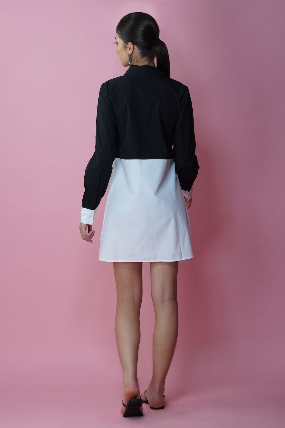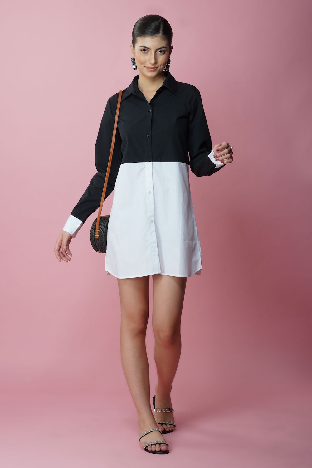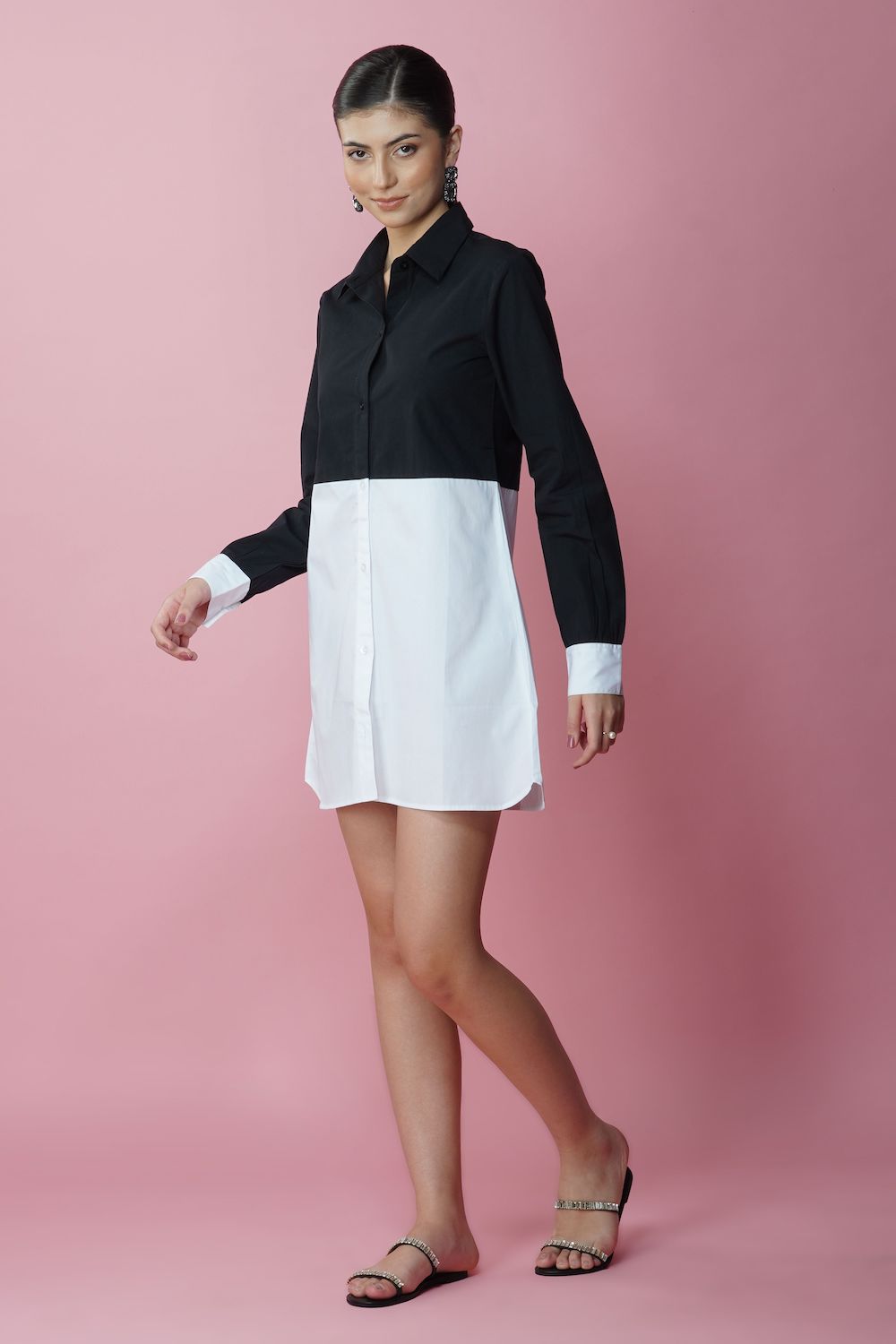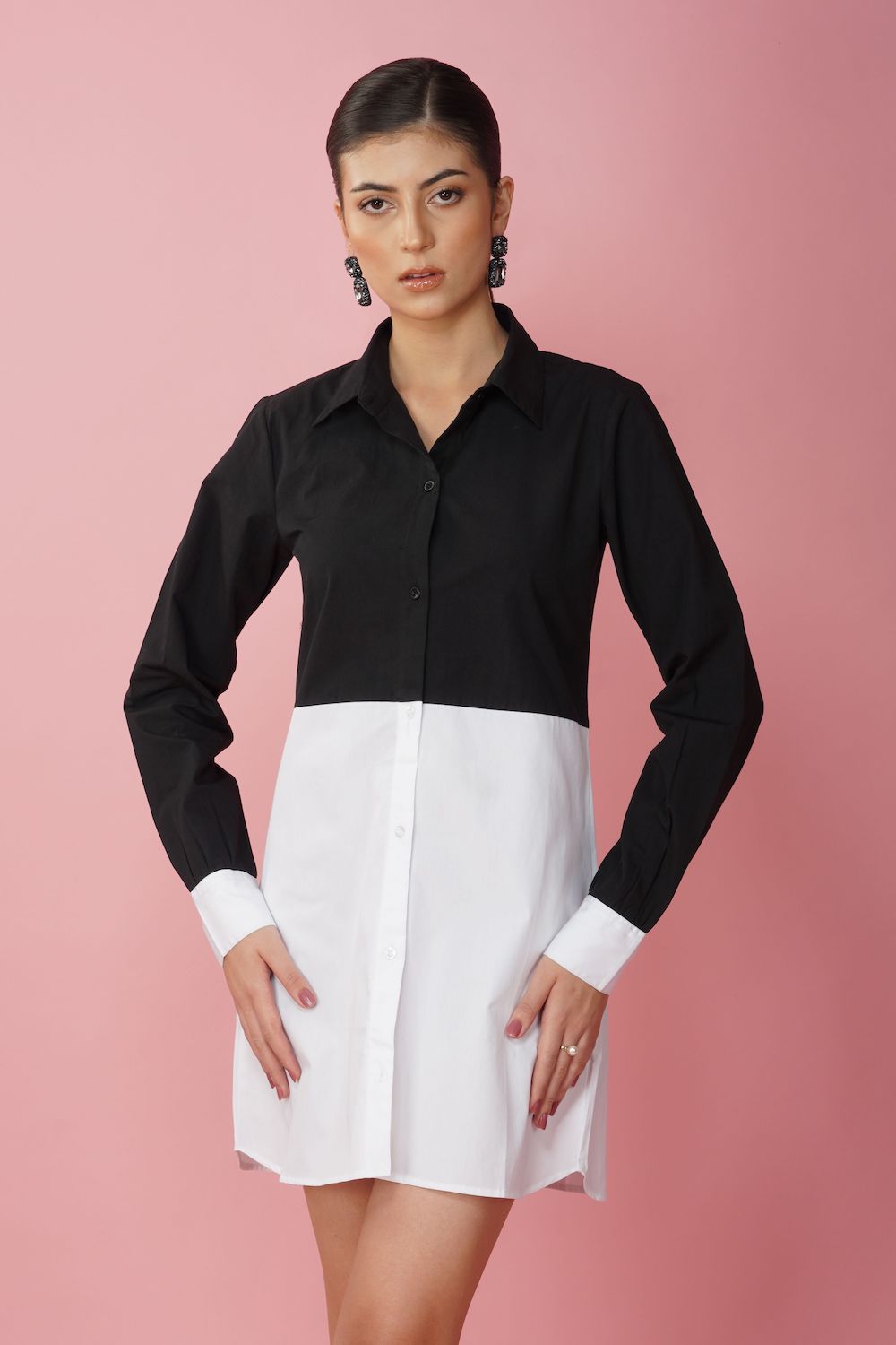 This contemporary colour blocked black and white shirt dress is synonymous with comfort and style