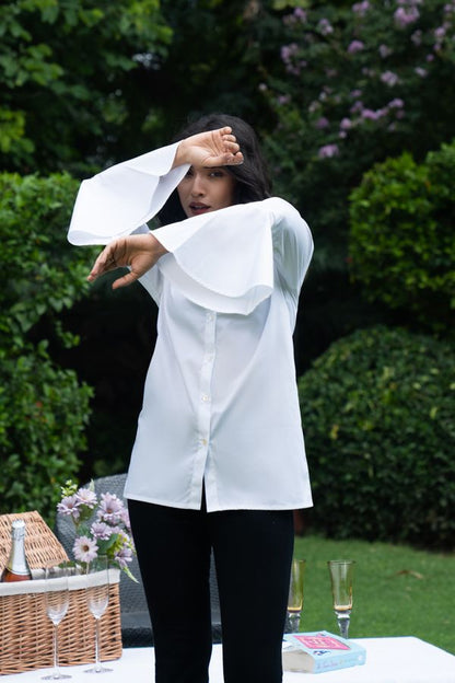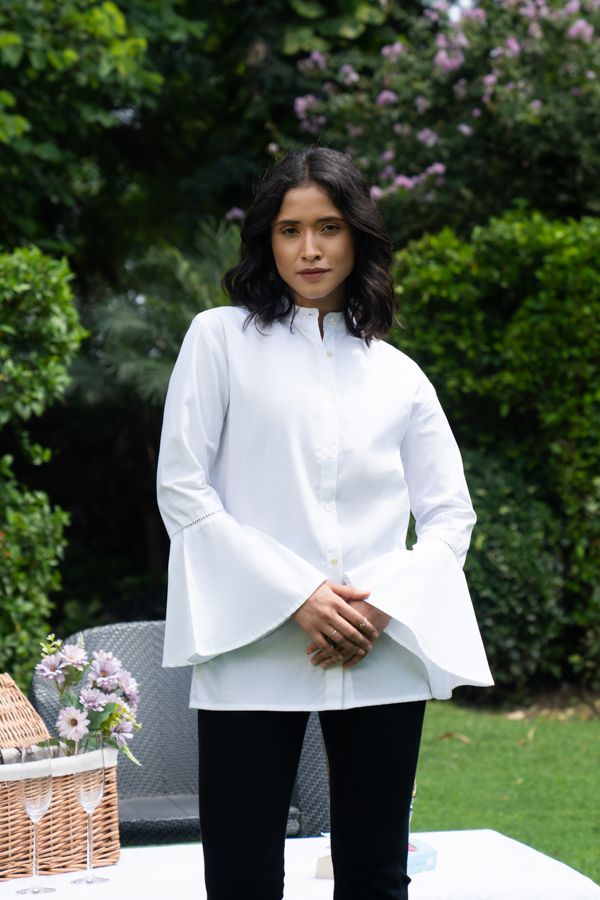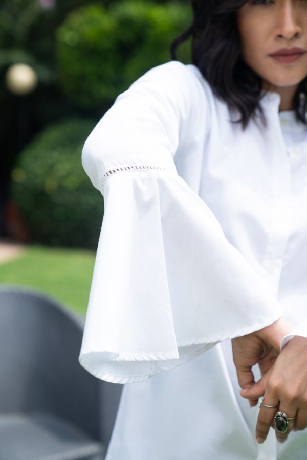 Our comfy, breathable white shirt features flowy bell sleeves with cutwork detailing. Perfect for day or night events