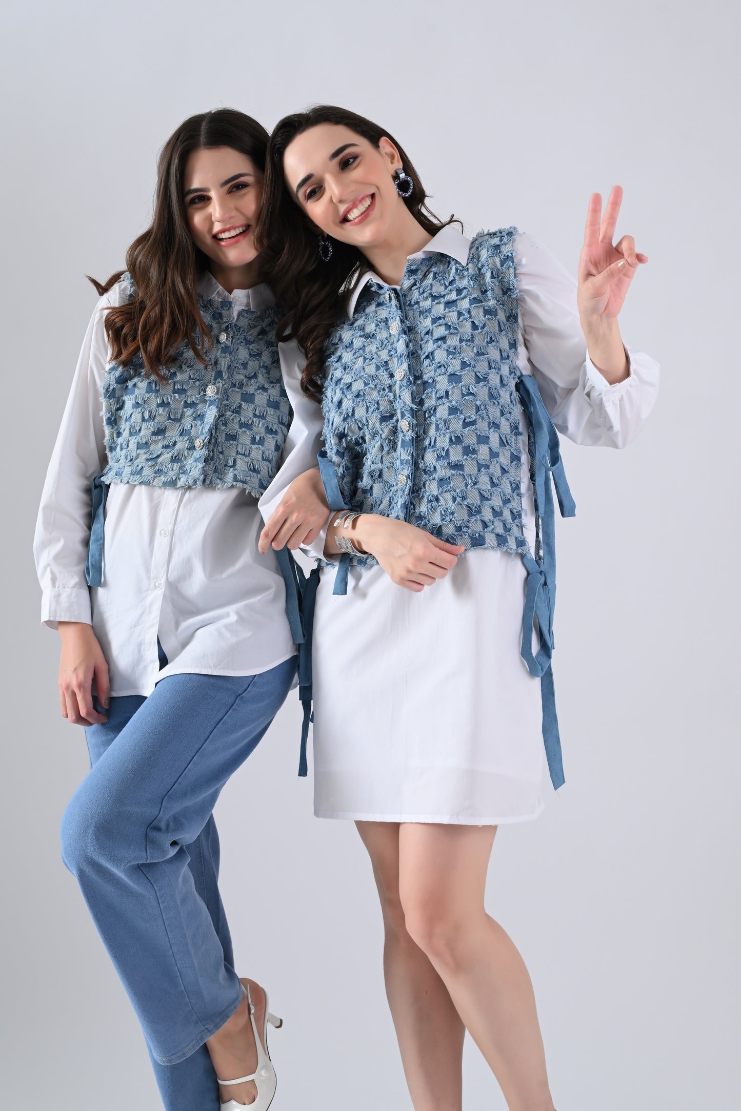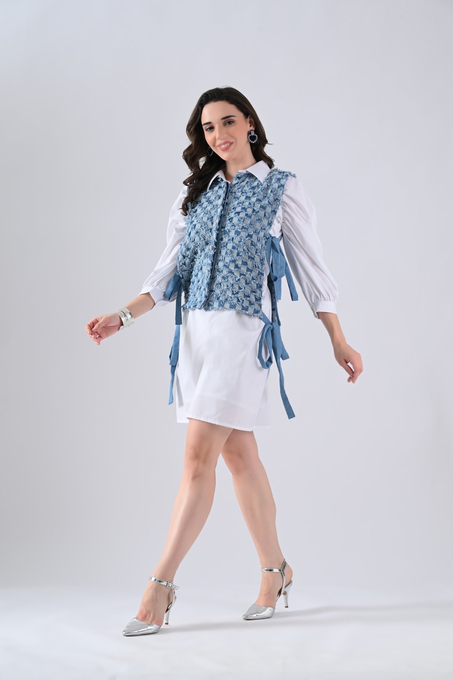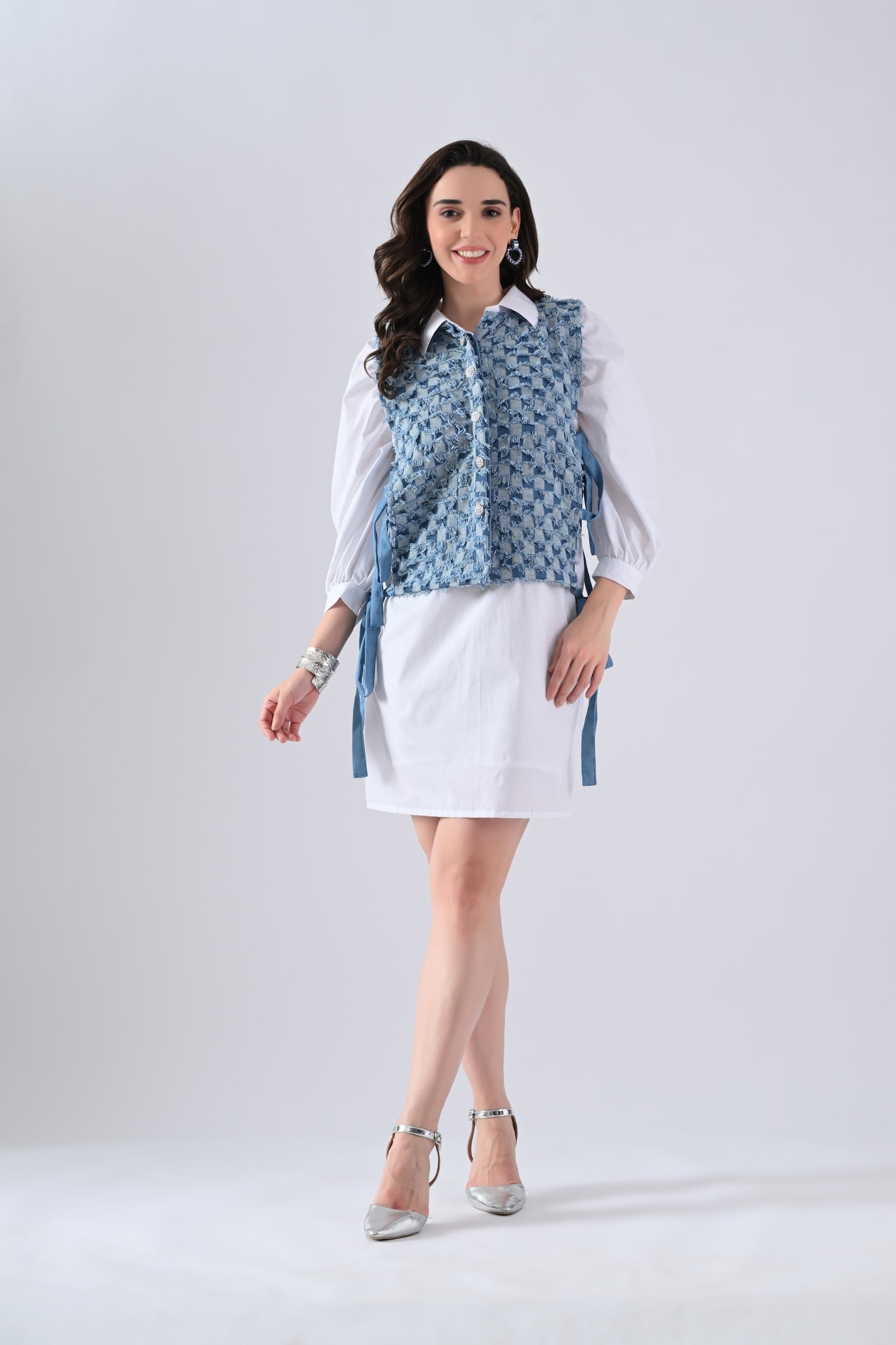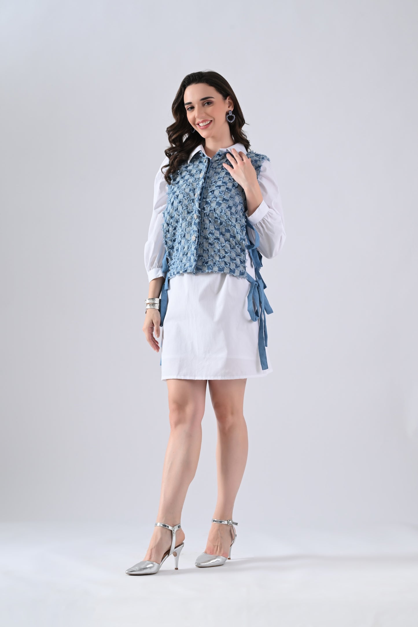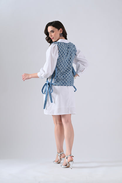 White Cotton Shirt Dress with Blue Checked Cape and Tie Strings