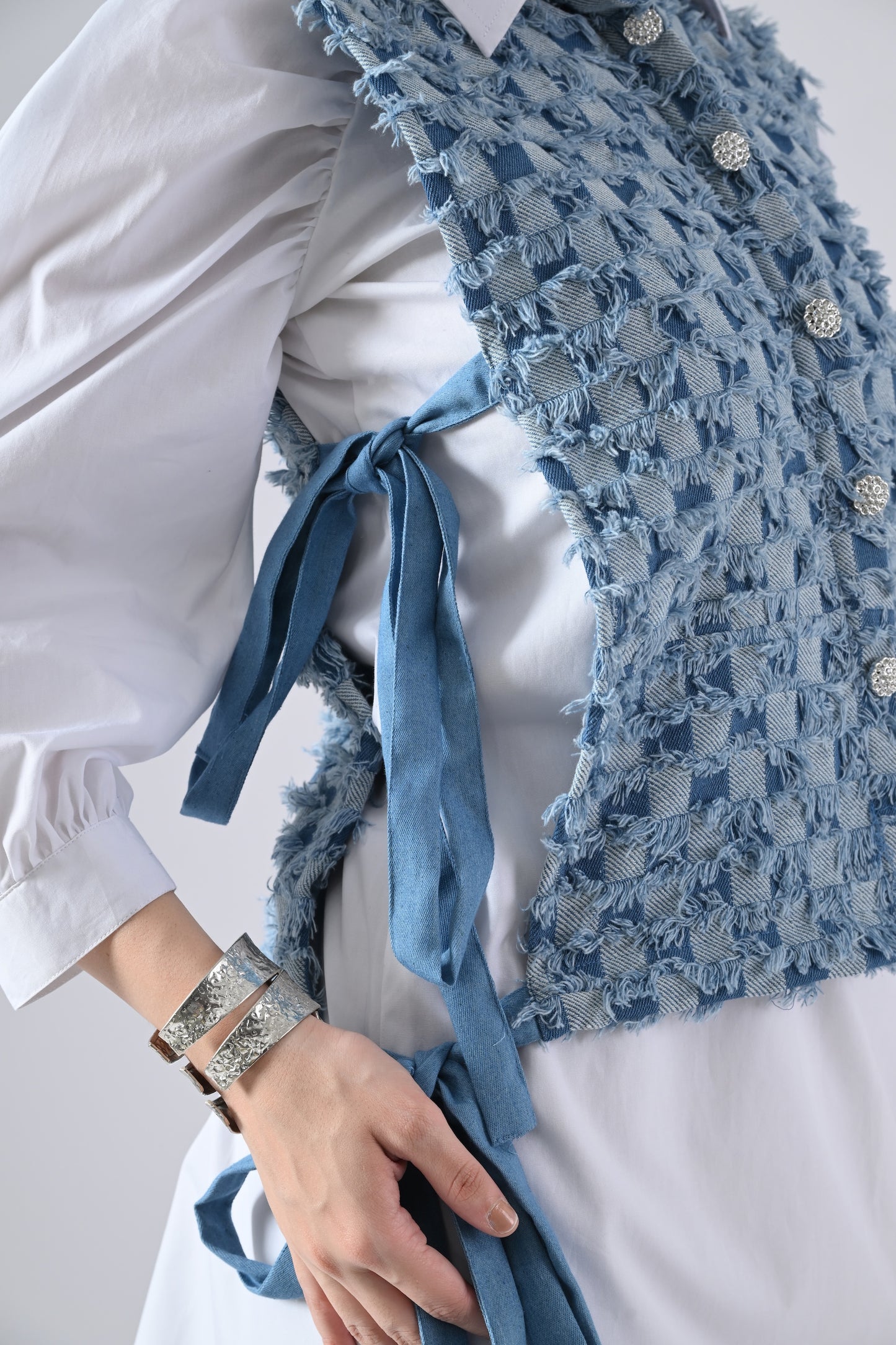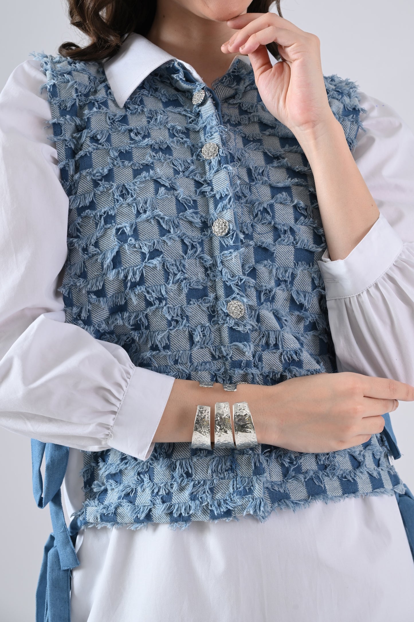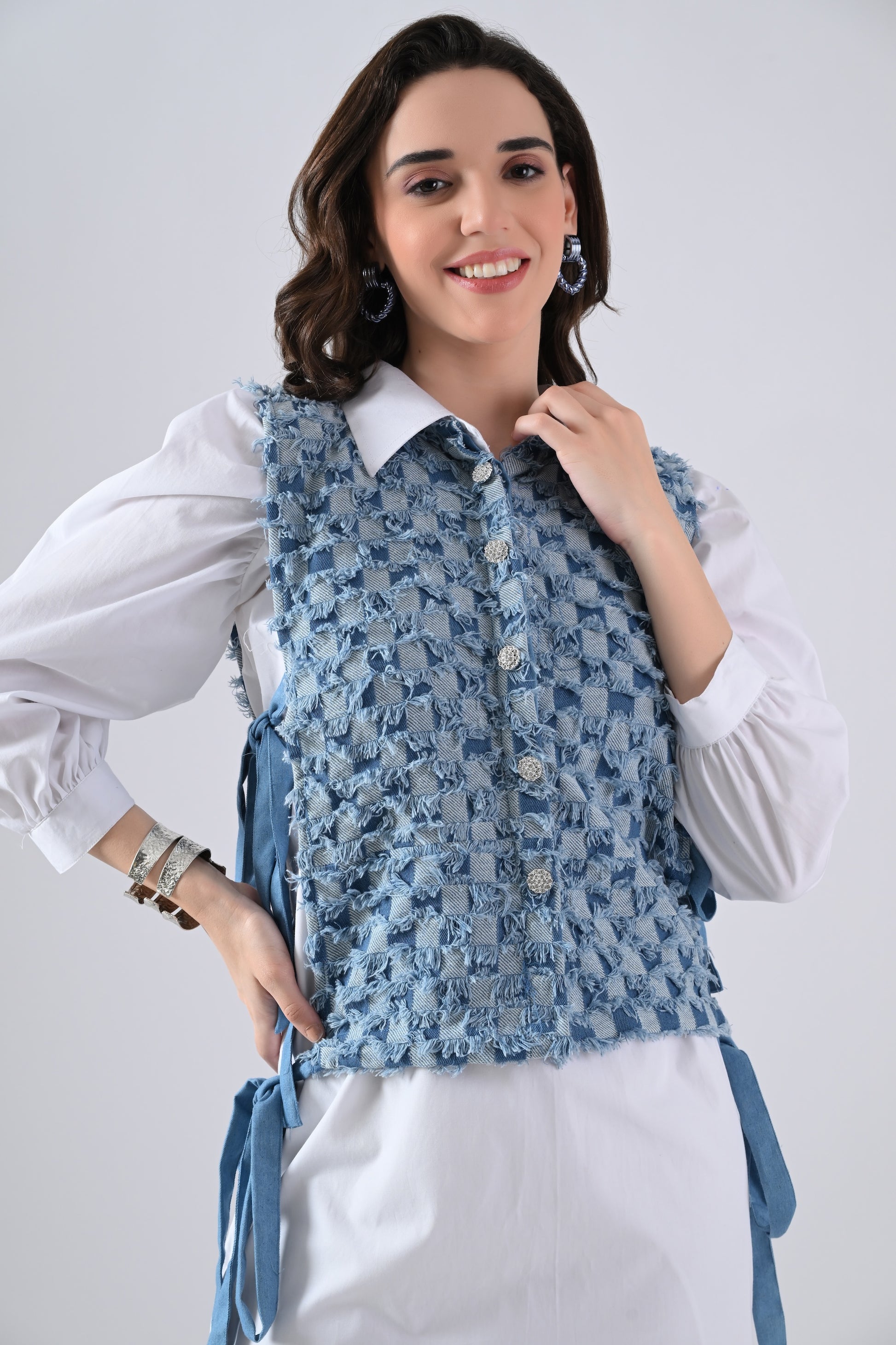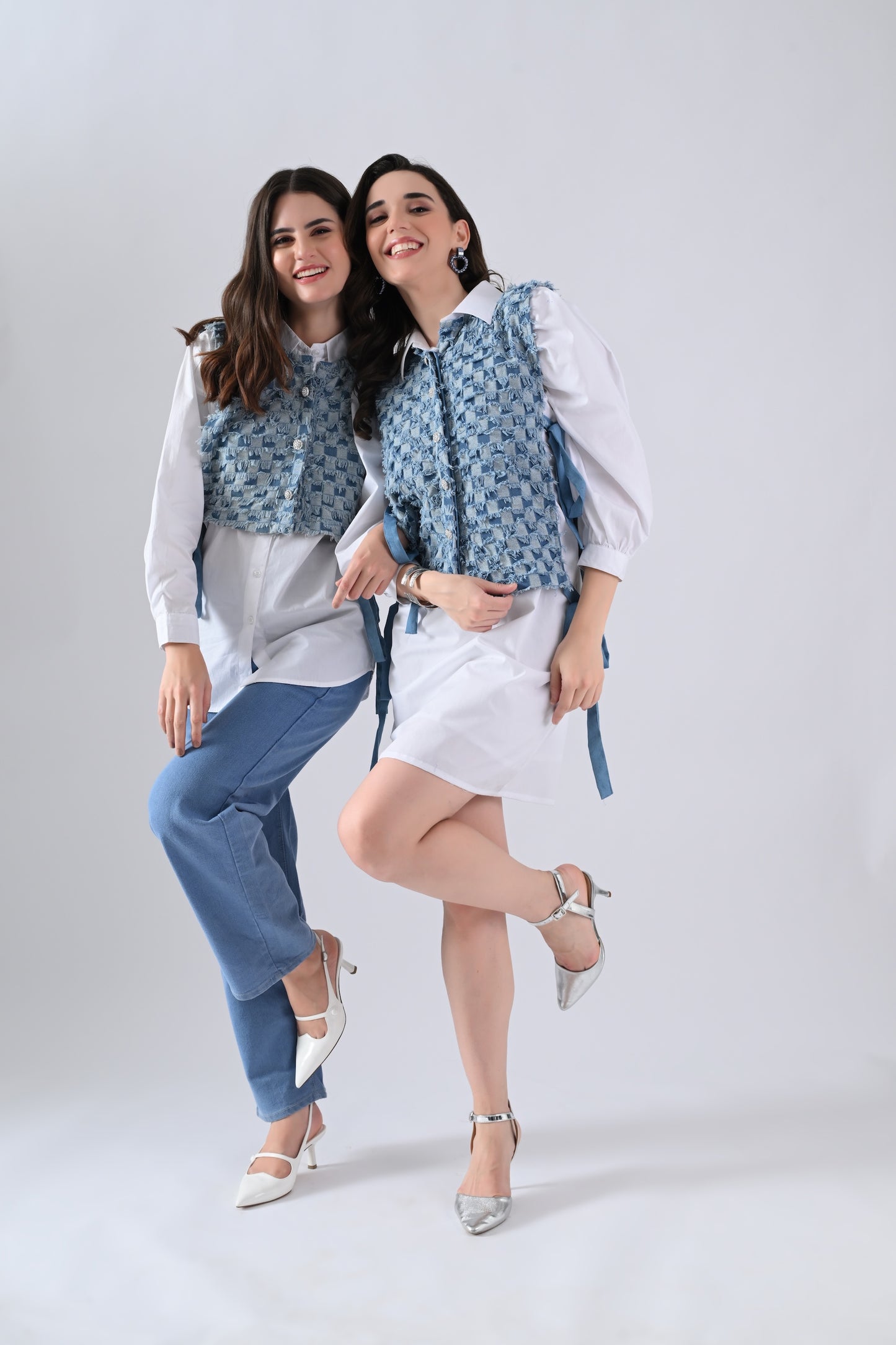 White Cotton Shirt Dress with Blue Checked Cape and Tie Strings
