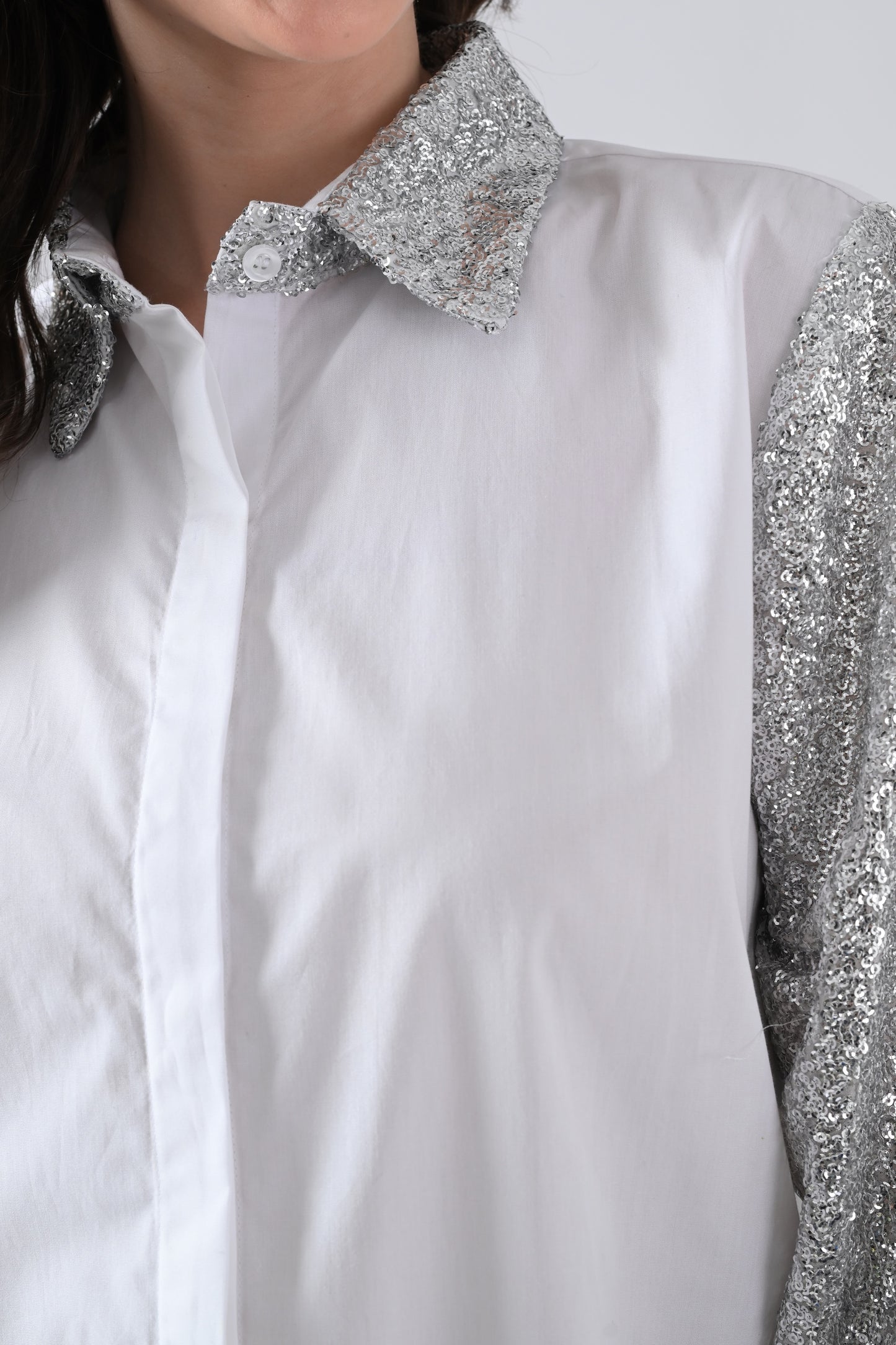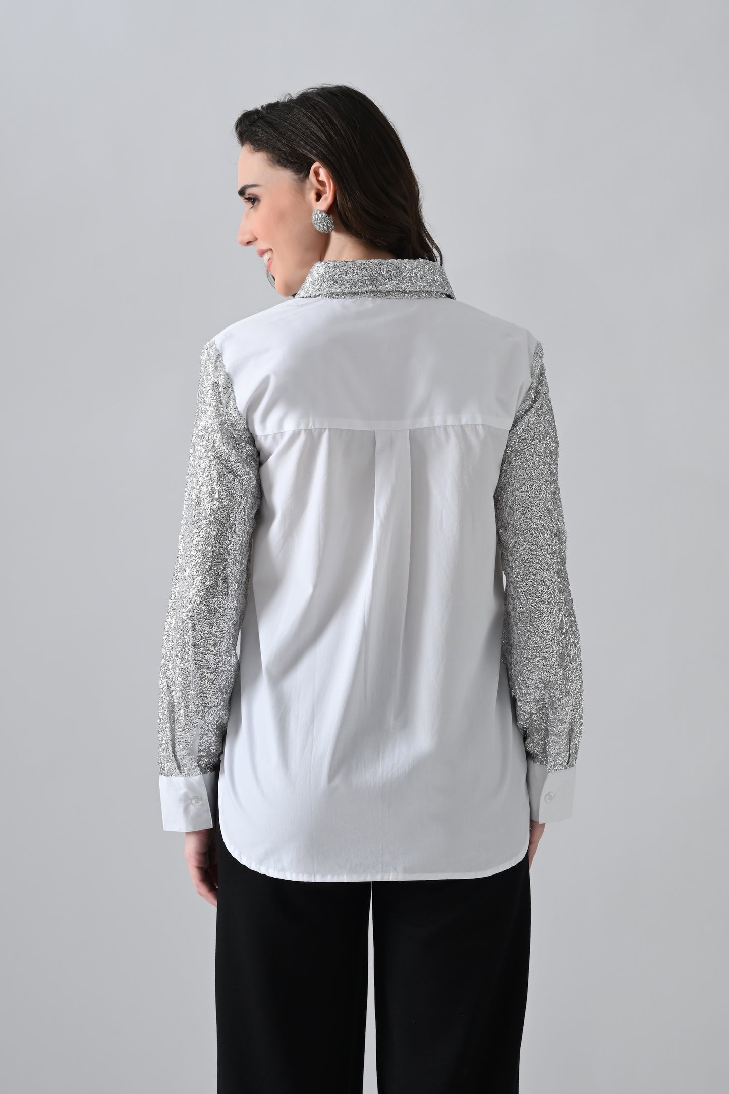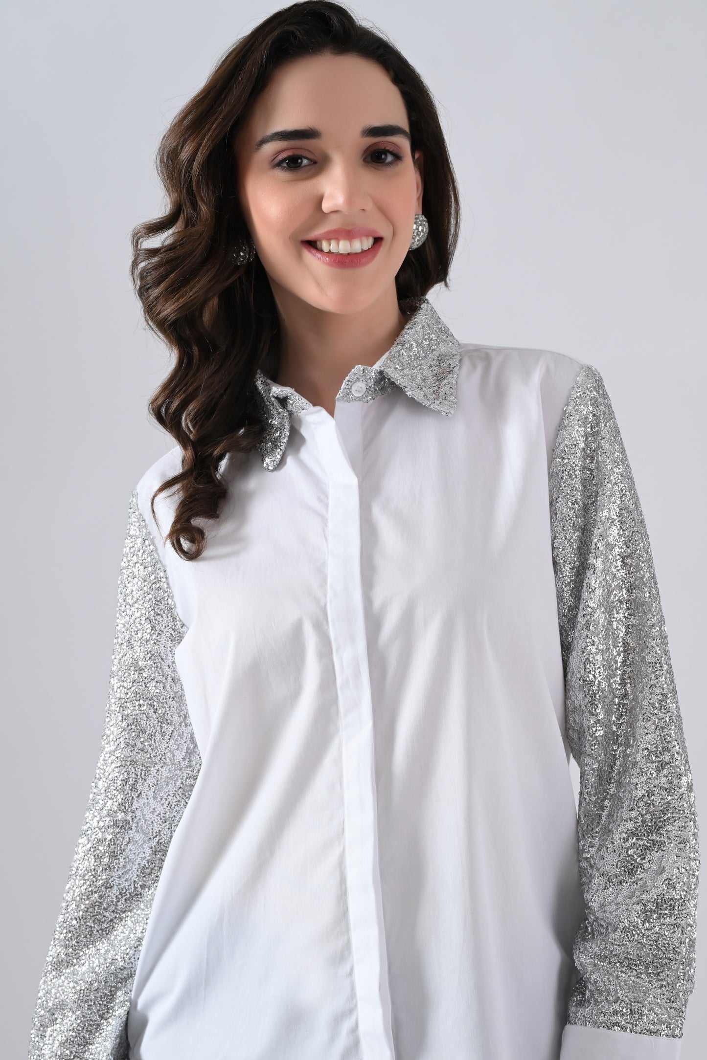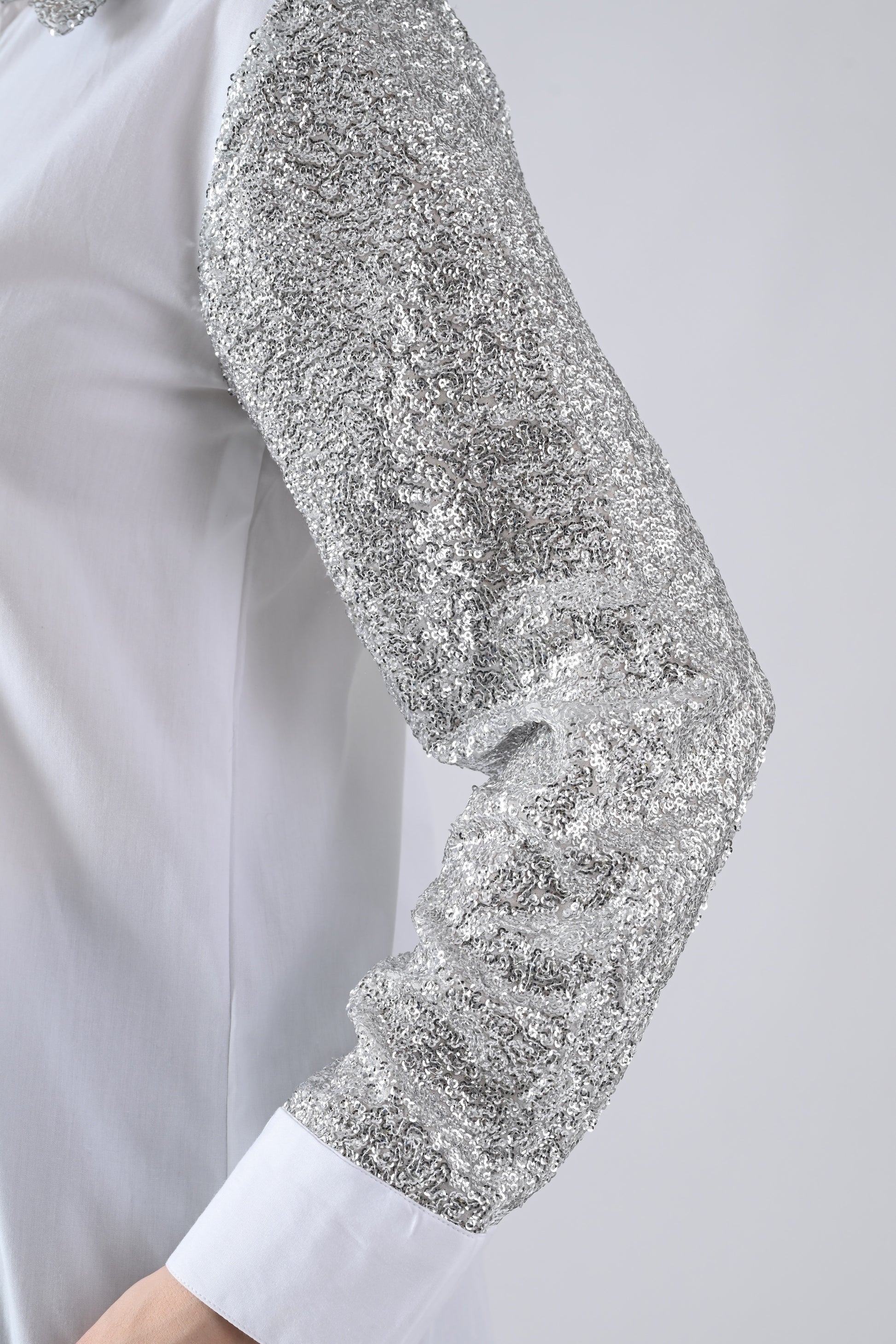 White Cotton Shirt with Silver Shimmer Collar and Sleeves