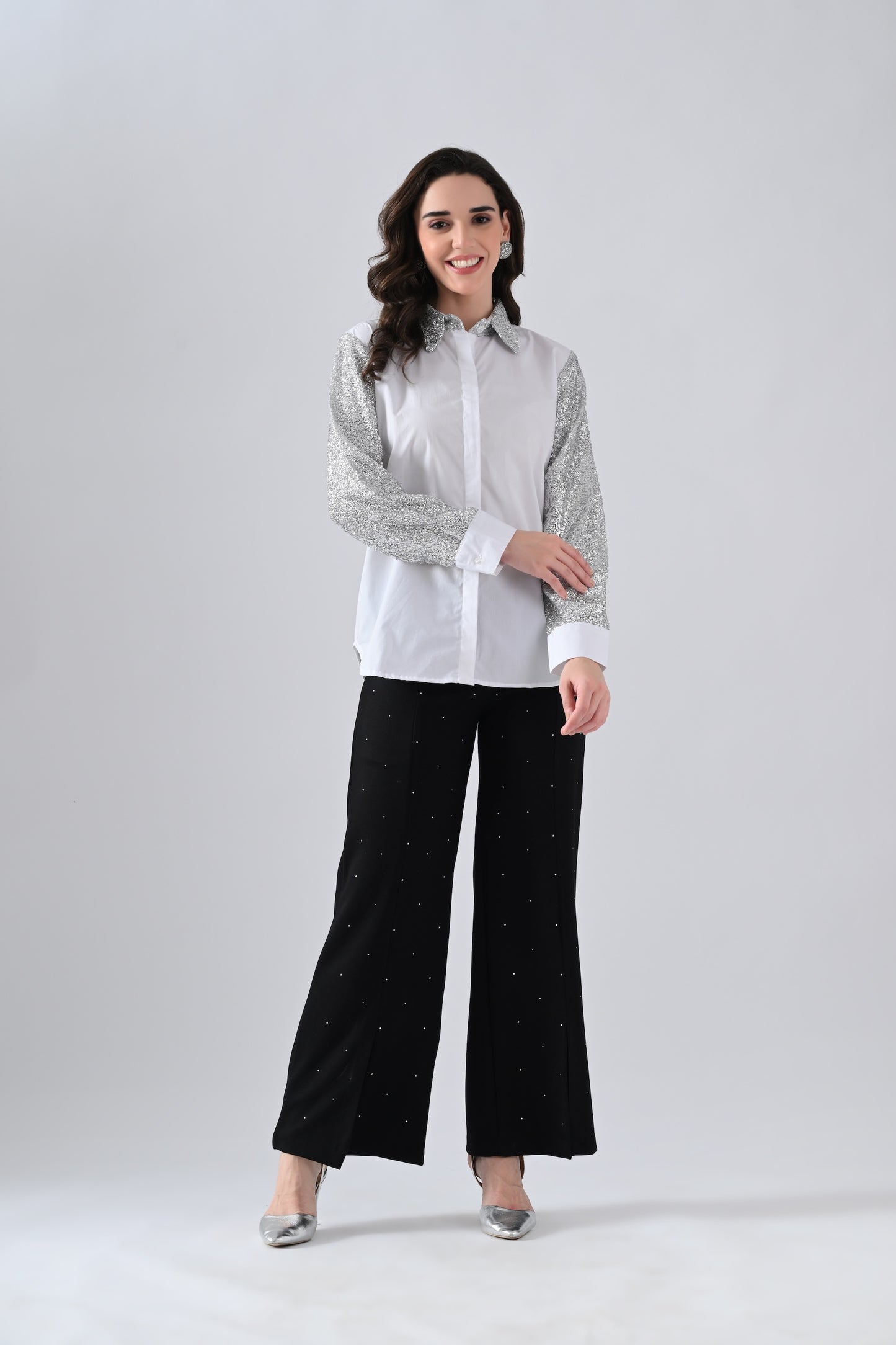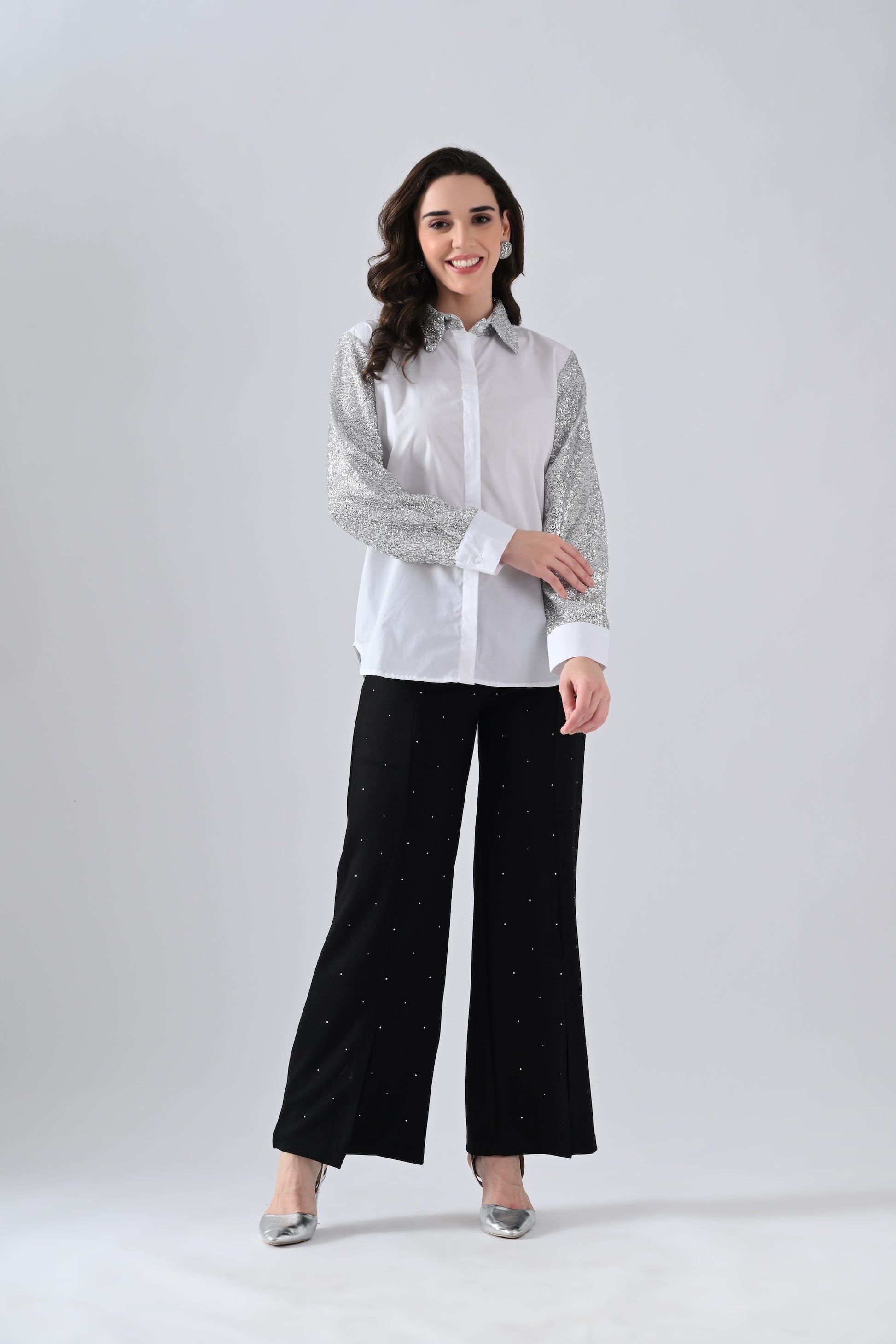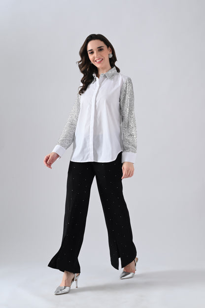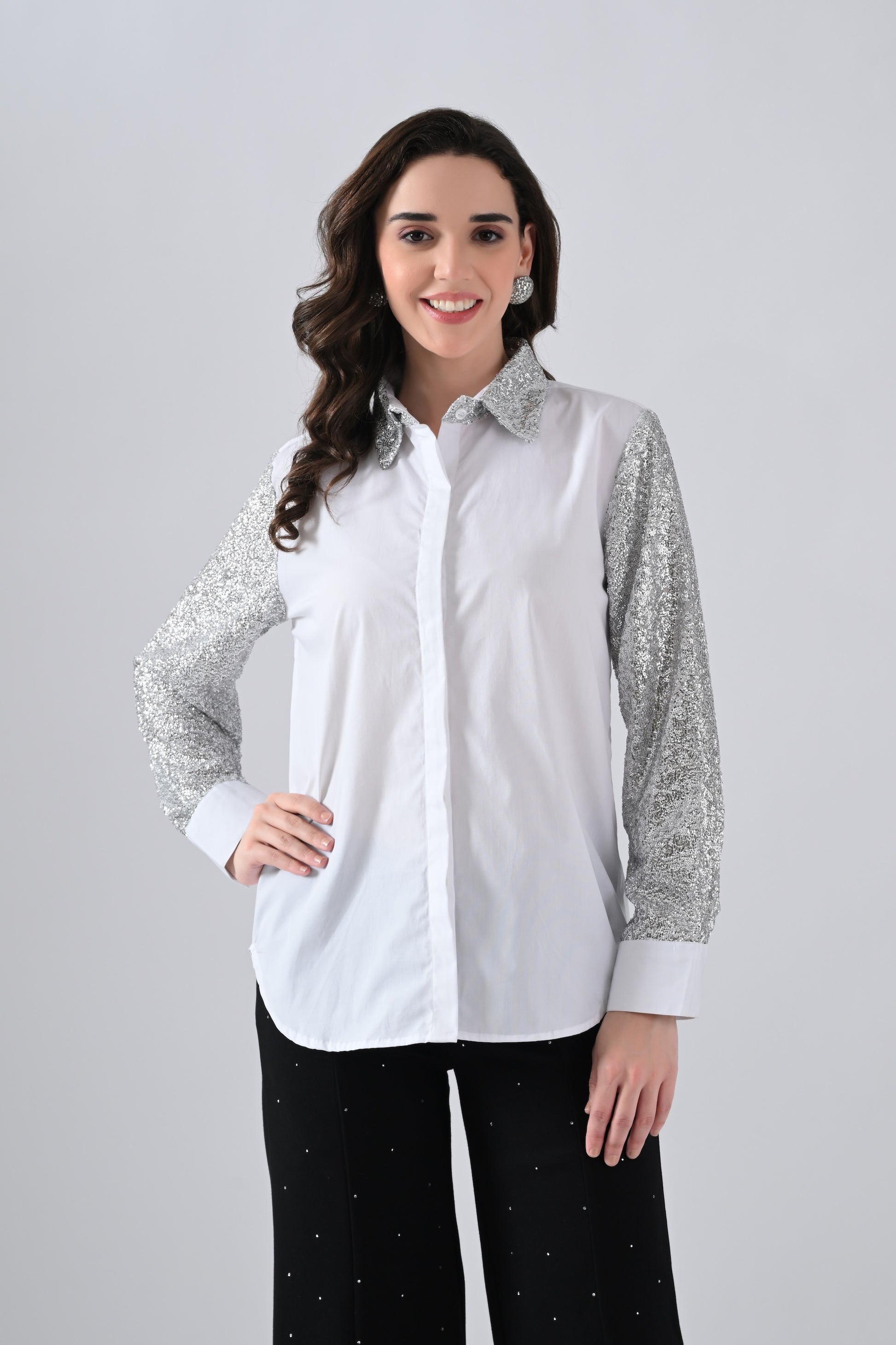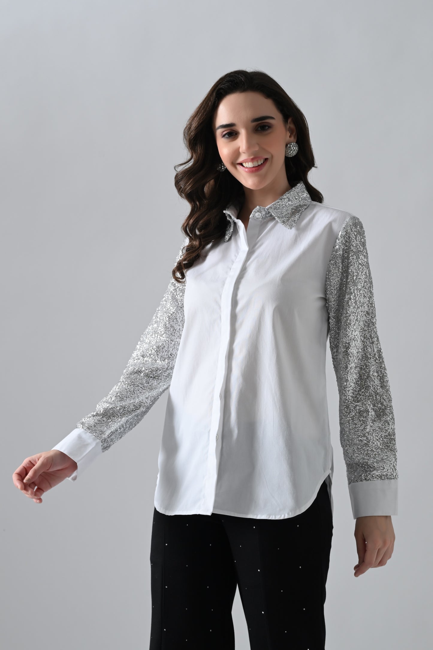 White Cotton Shirt with Silver Shimmer Collar and Sleeves