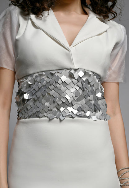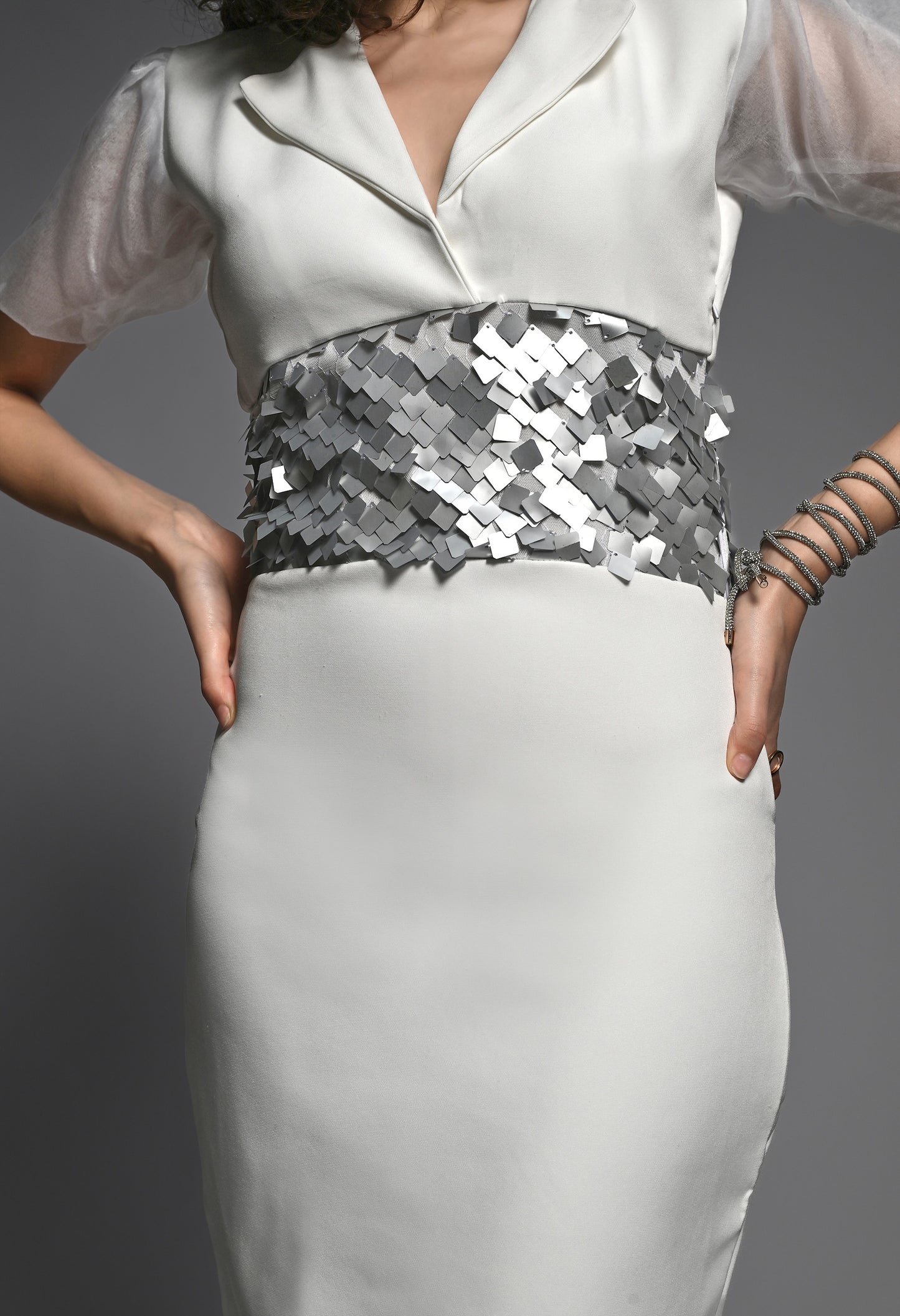 This bodycon dress features intricate shimmer detailing on the waist and organza sleeves. Gather all the attention in this refined, elegant silhouette.