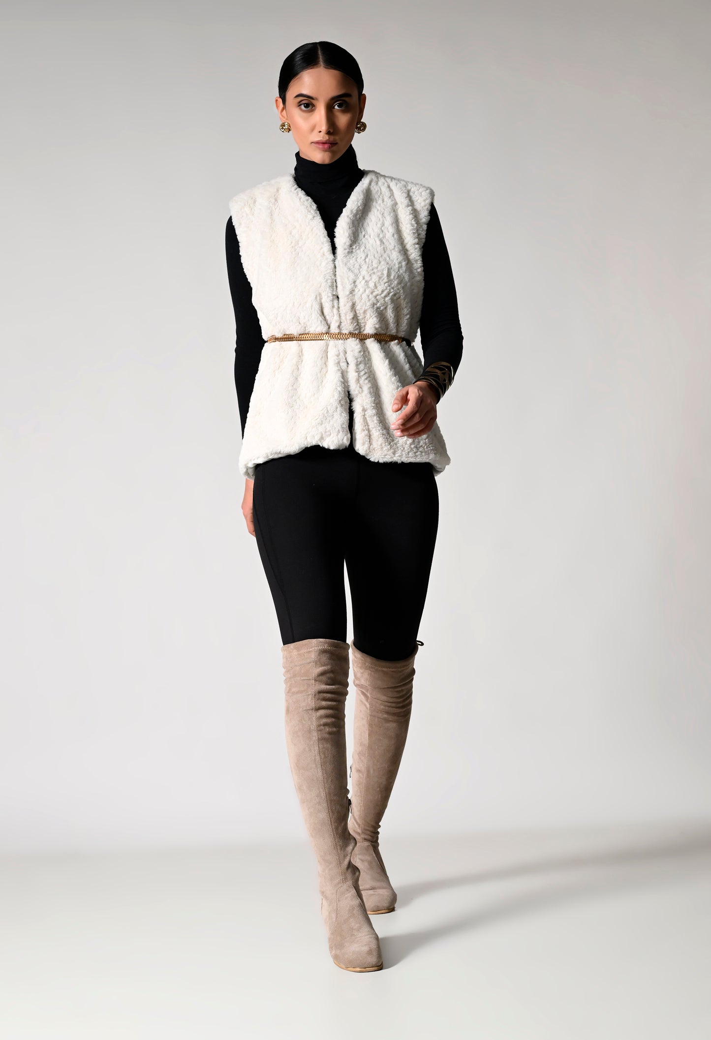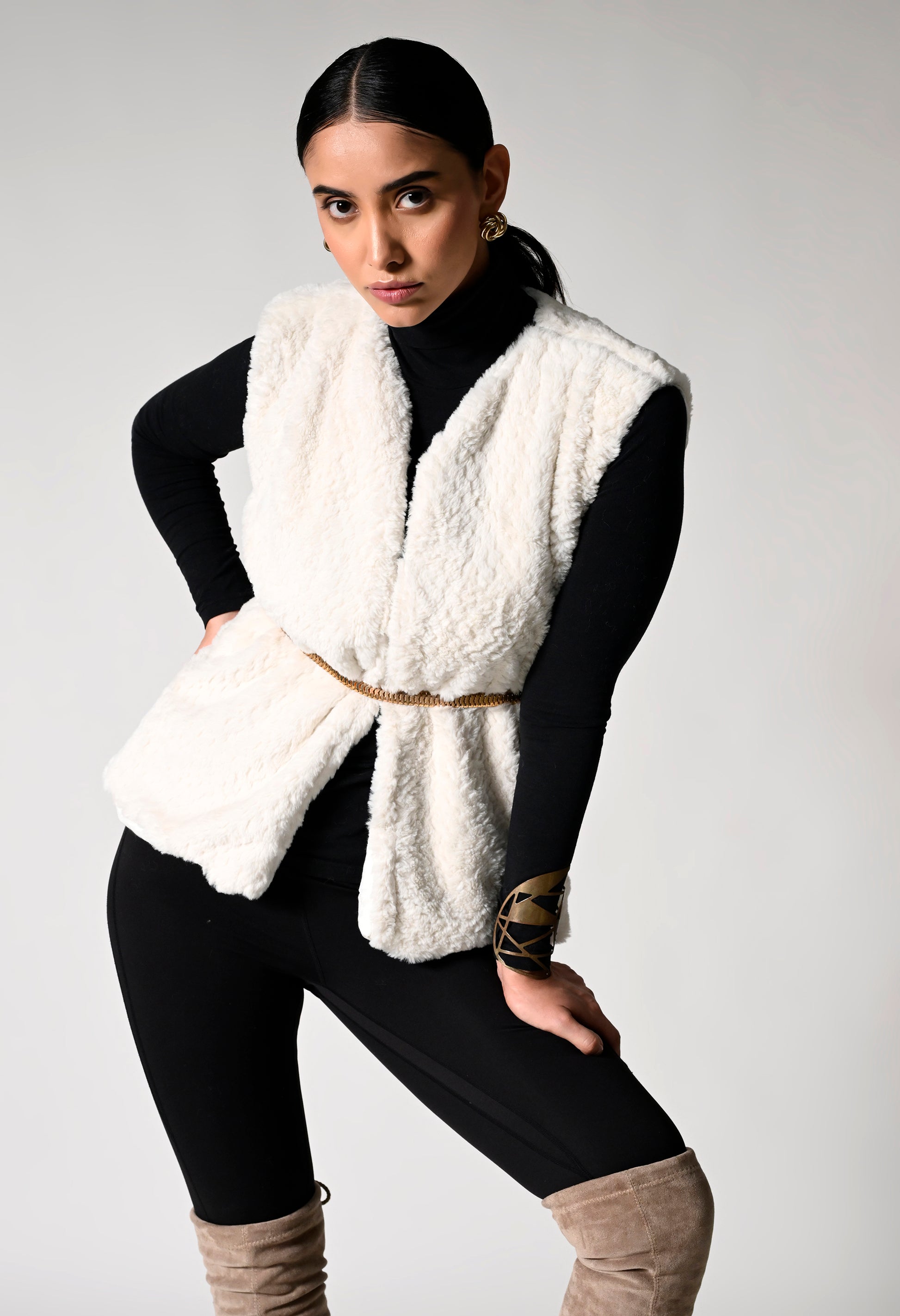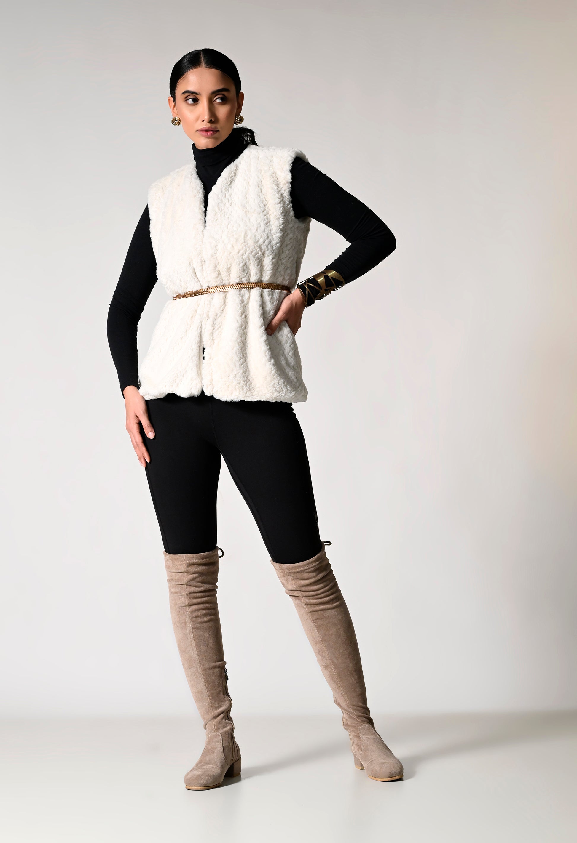 Whether you're looking for a dazzling smart party wear or a casual party outfit, this fur jacket in white with a golden belt is designed to suit all.