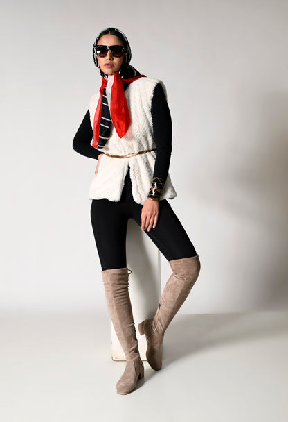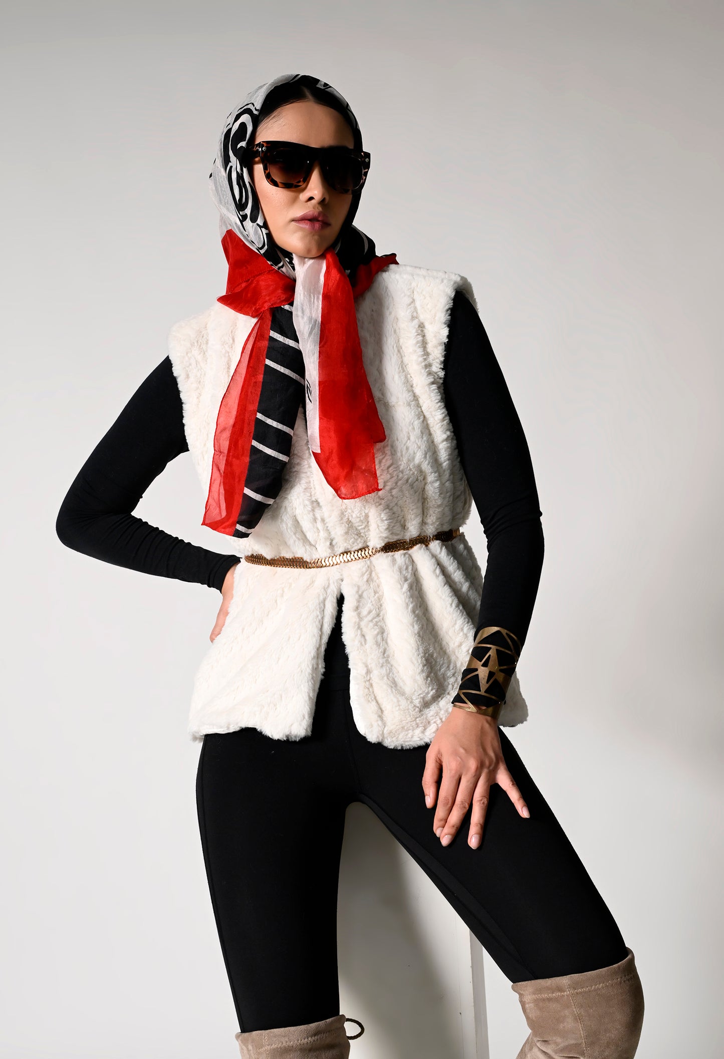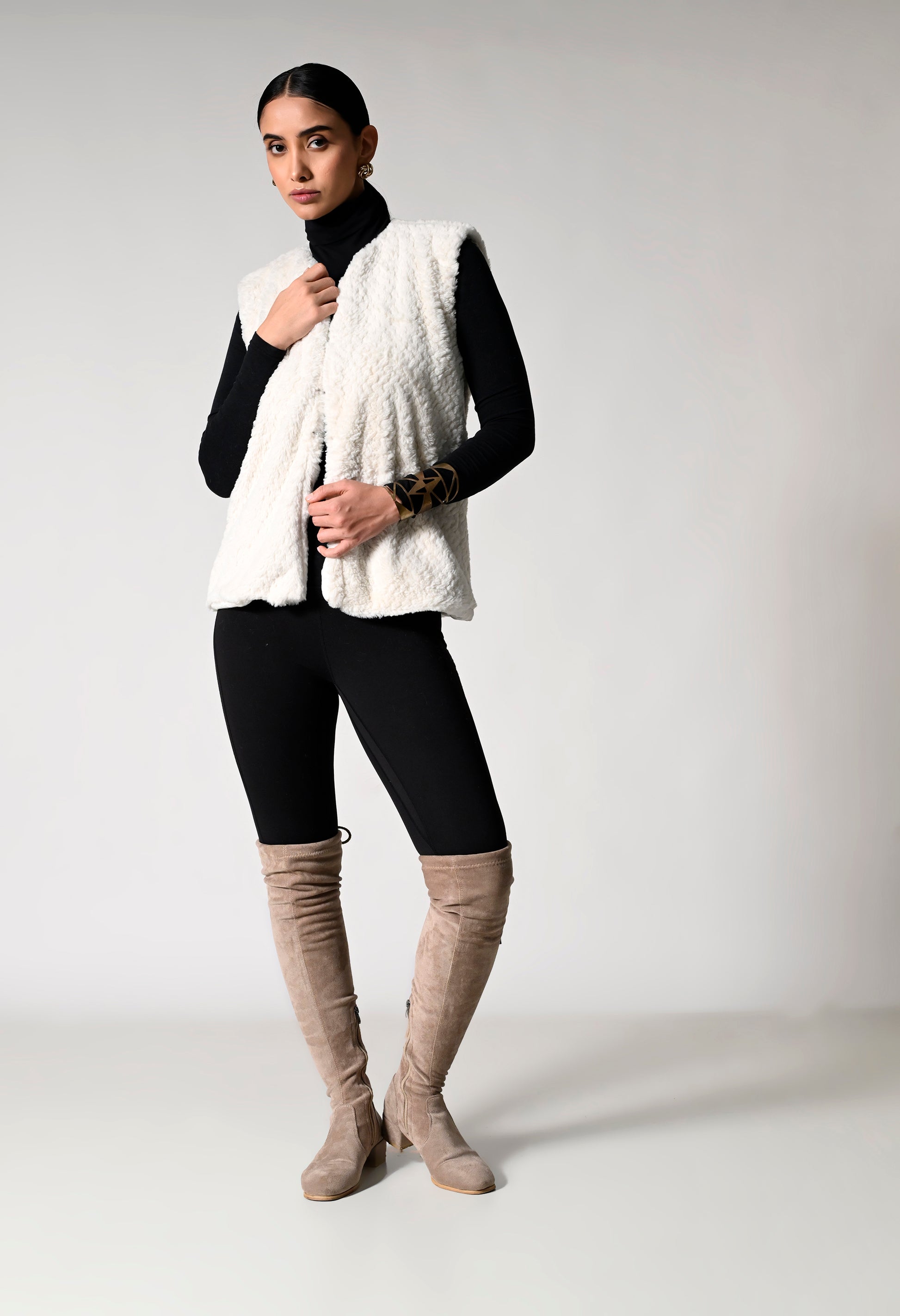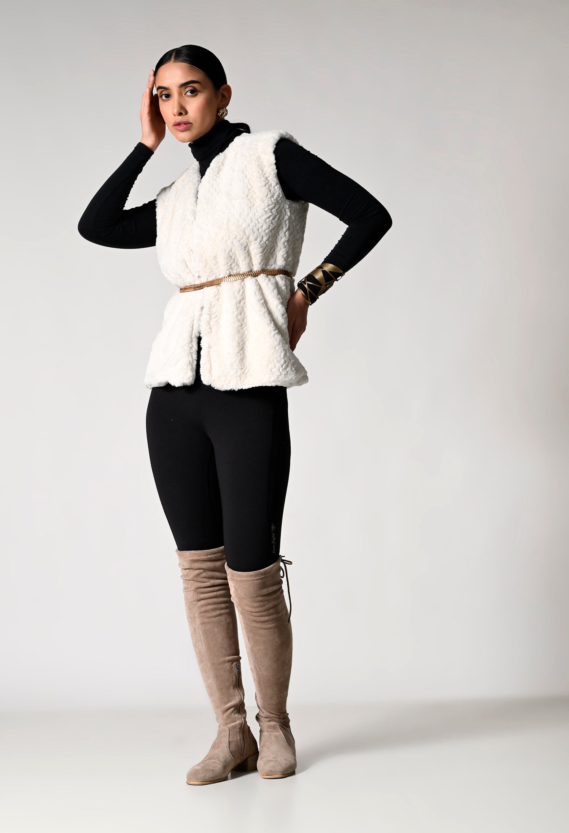 Whether you're looking for a dazzling smart party wear or a casual party outfit, this fur jacket in white with a golden belt is designed to suit all.