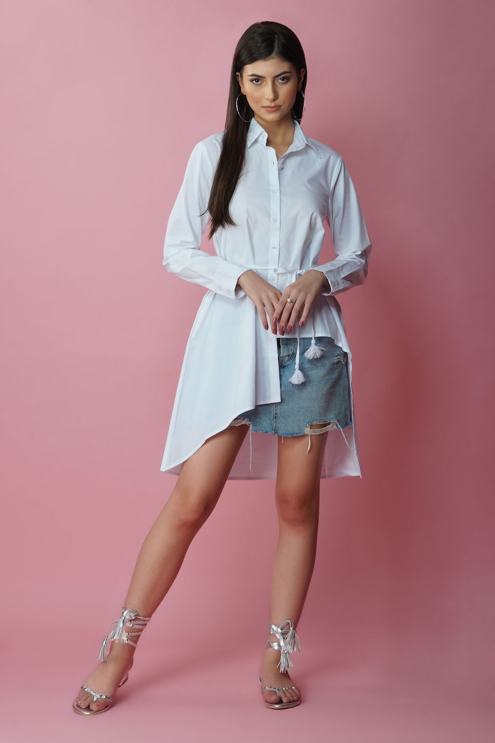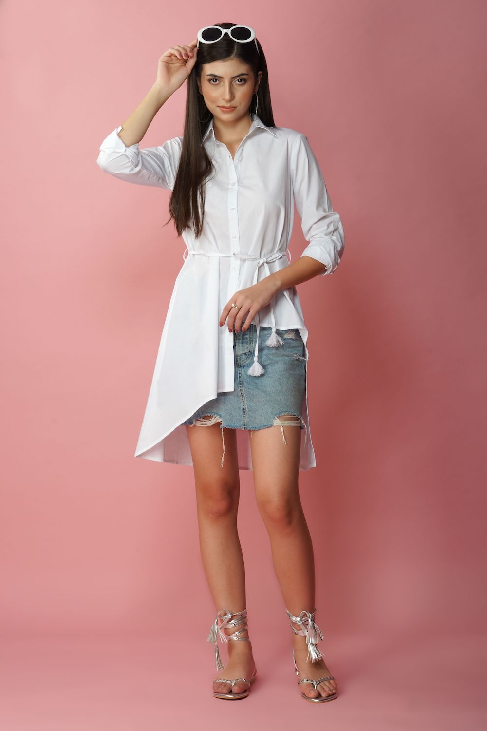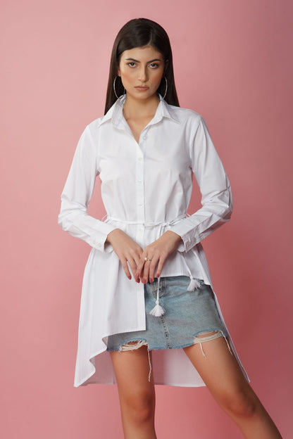 This comfort shirt is shaped with a deconstructed silhouette and a tasseled belt at the waist.