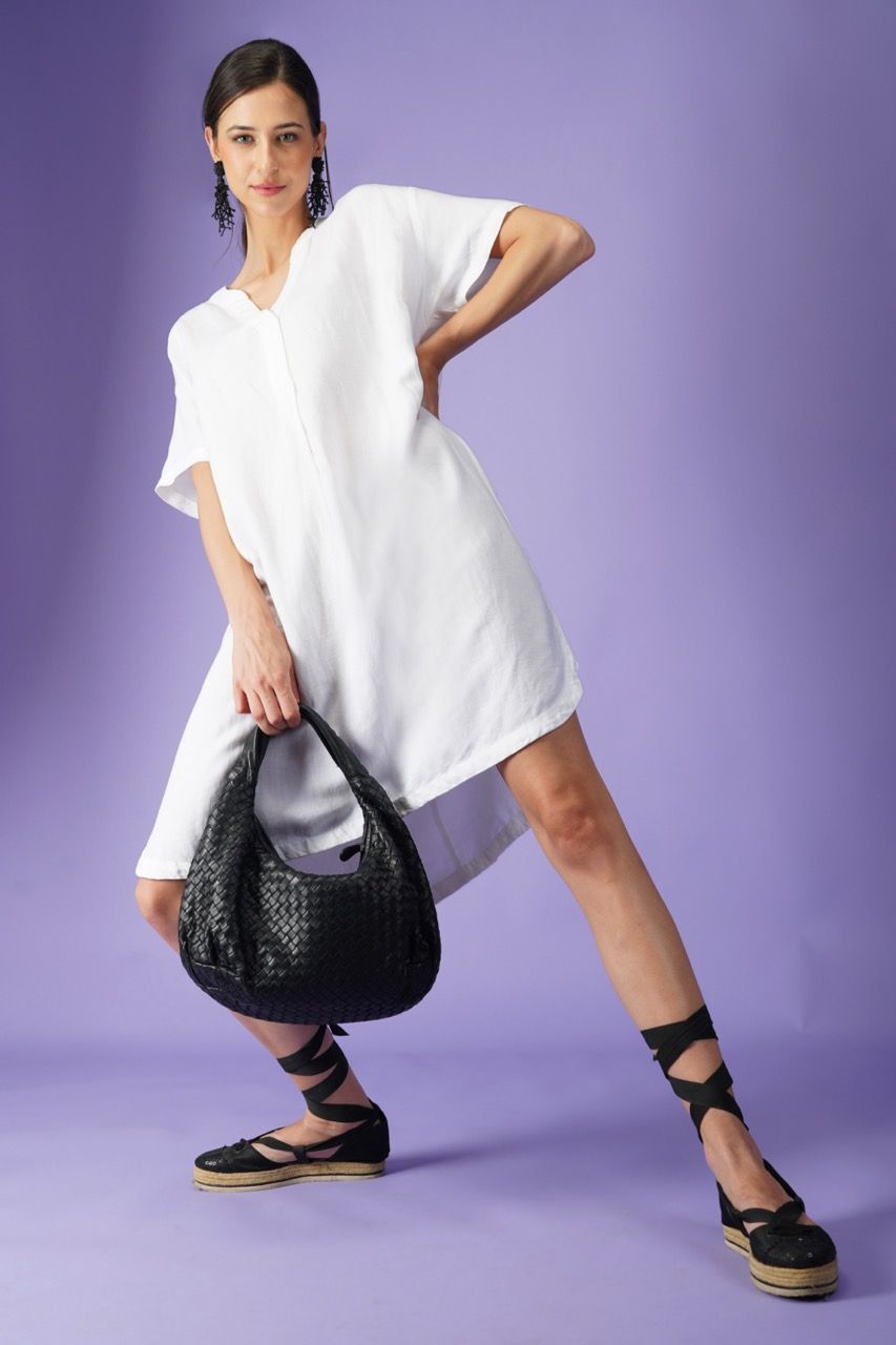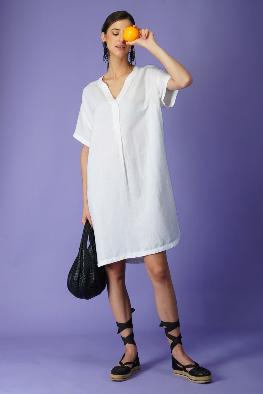 The oh-so-soft style of this lovely linen dress with a V-neck and flowy drape keeps you comfortable all day.