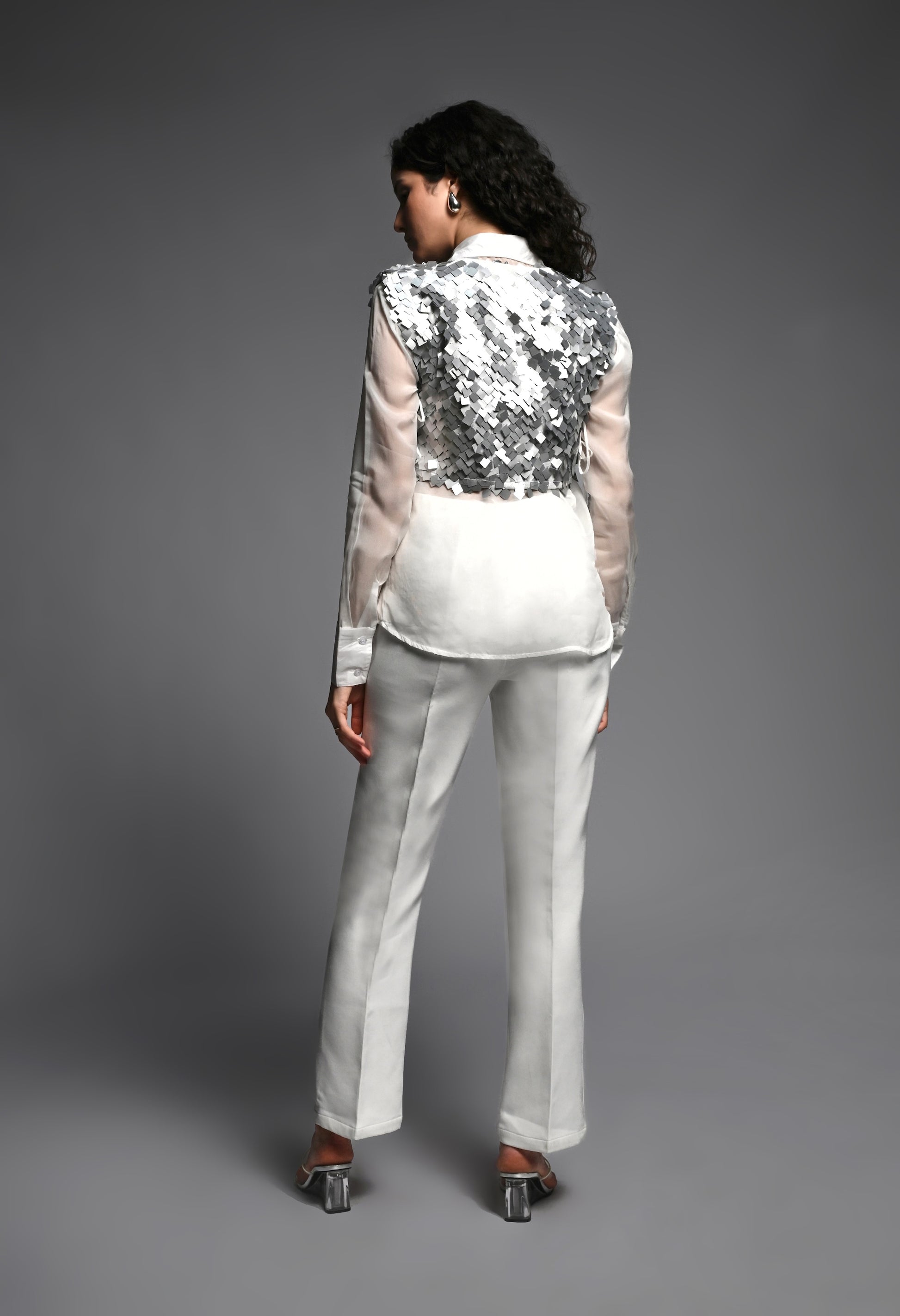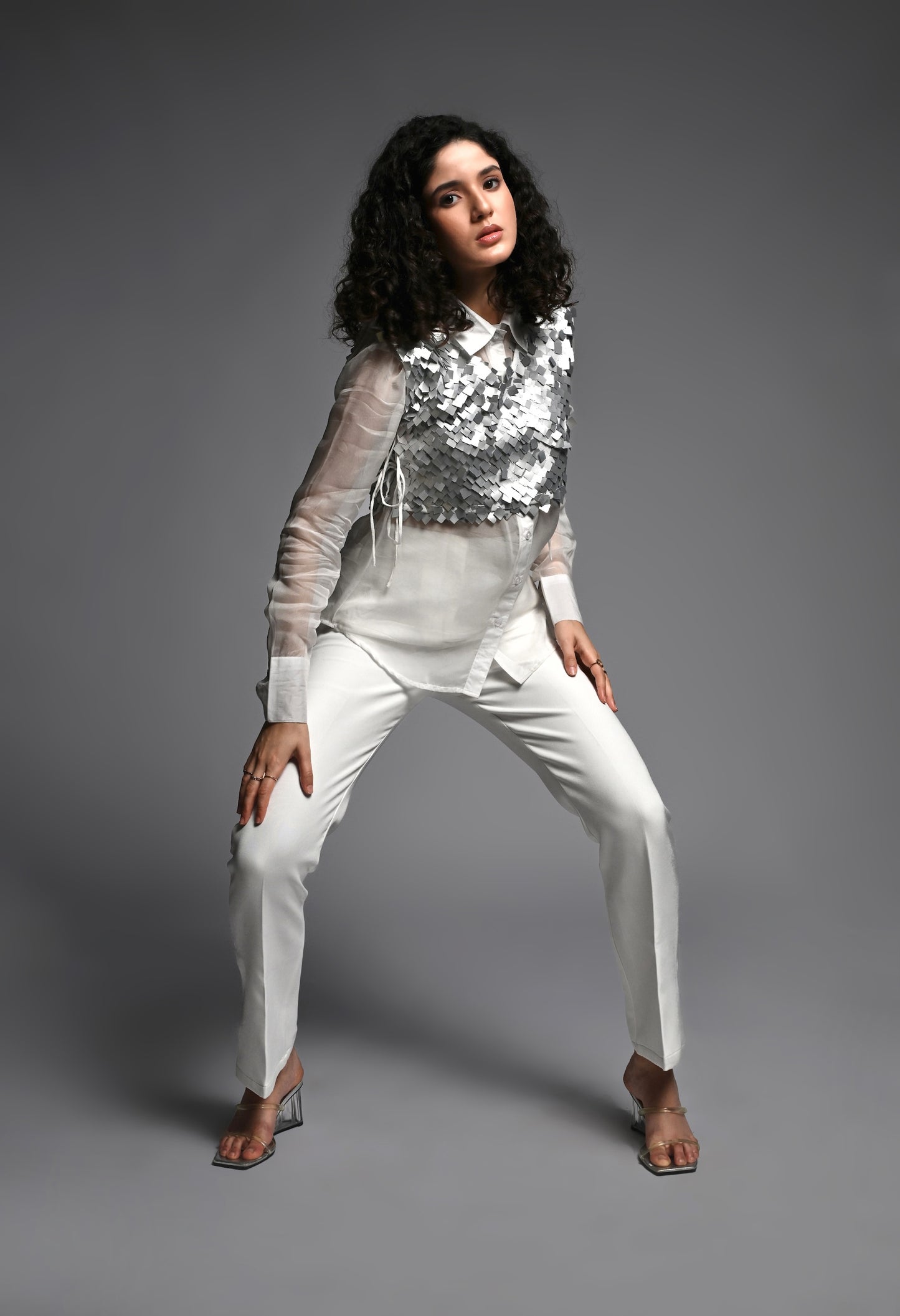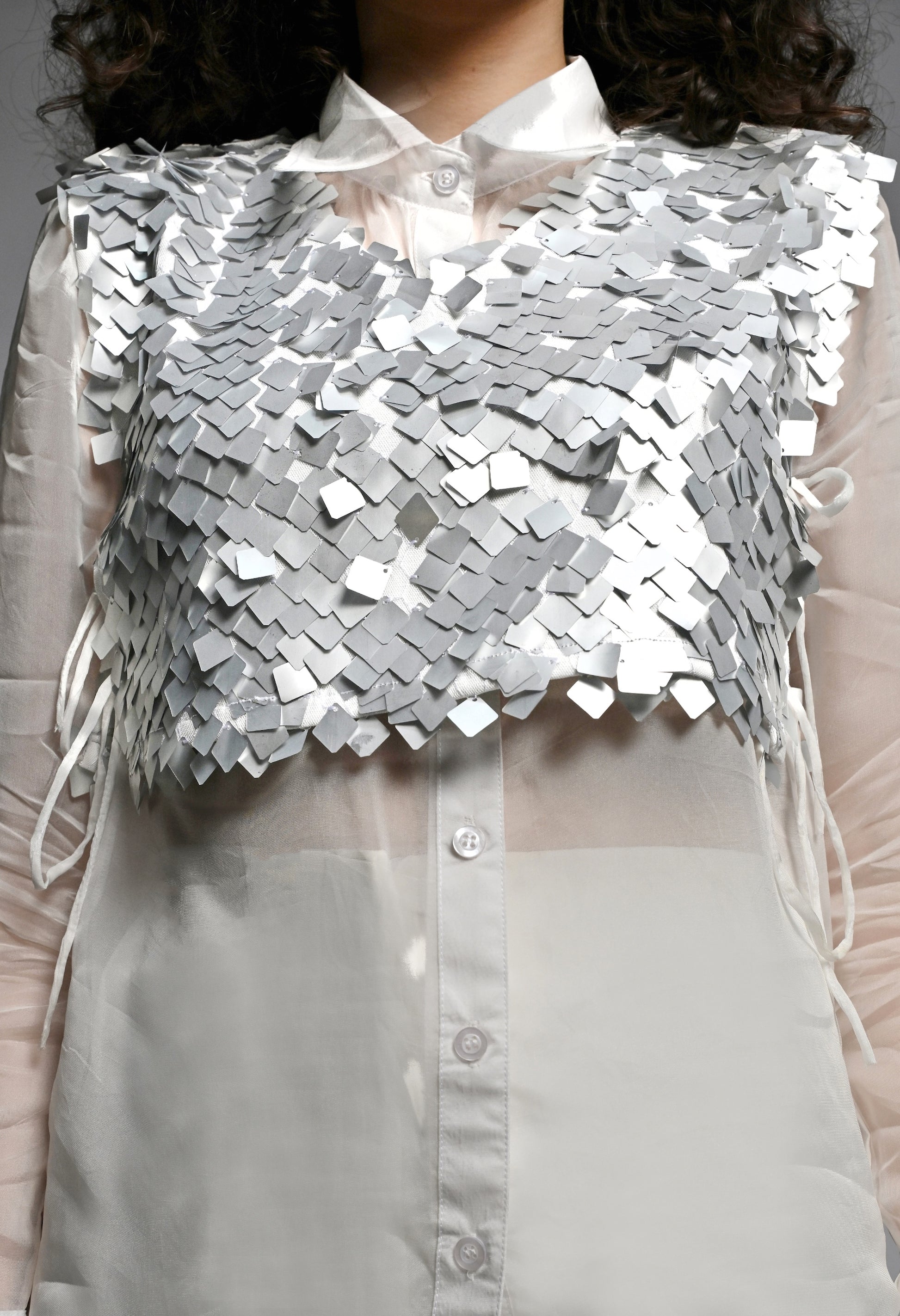 A never before seen shirt with a short silver jacket and tie strings on the corners.This shirt features pointed collar, buttoned cuffed and a mesmerising cover up