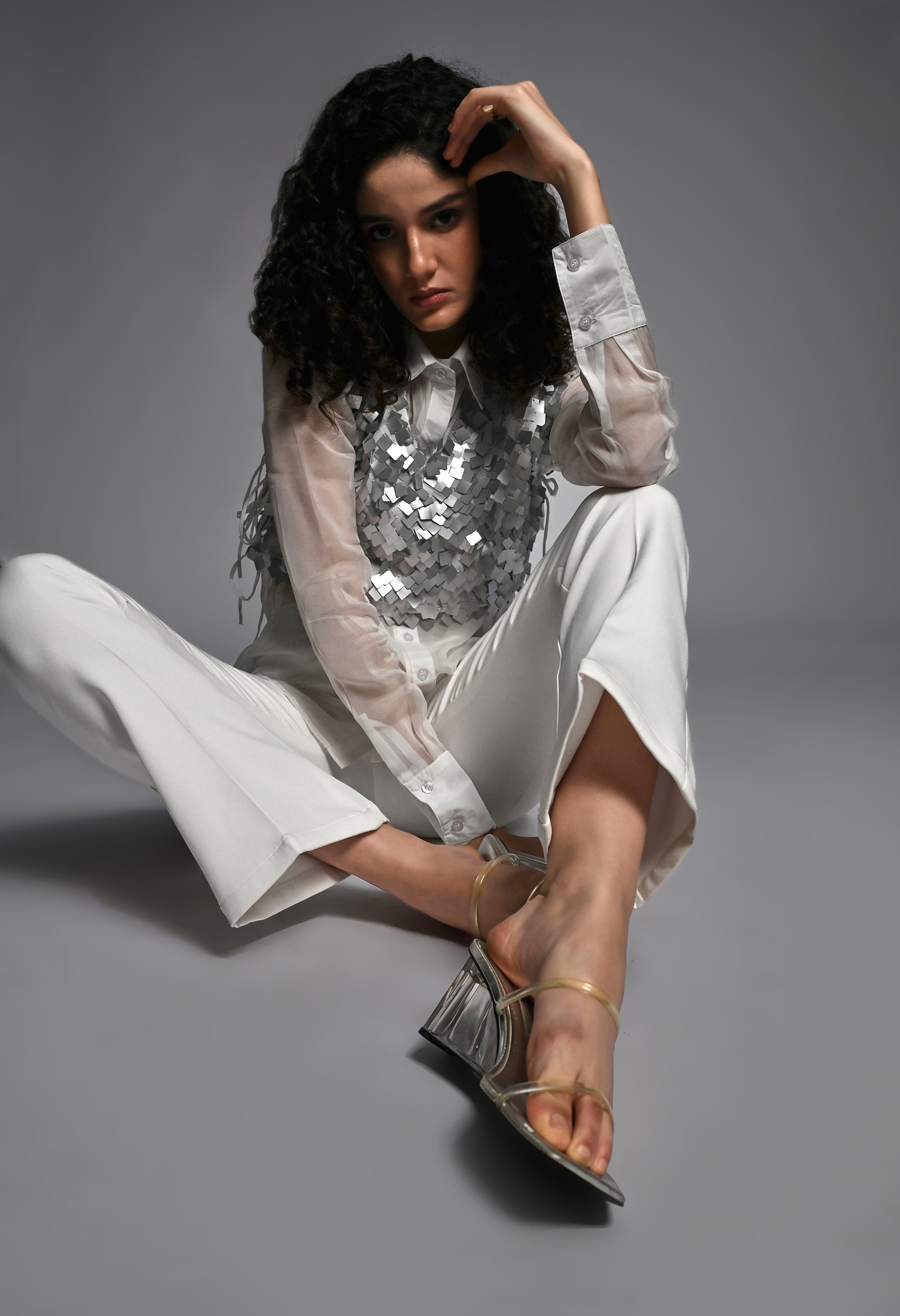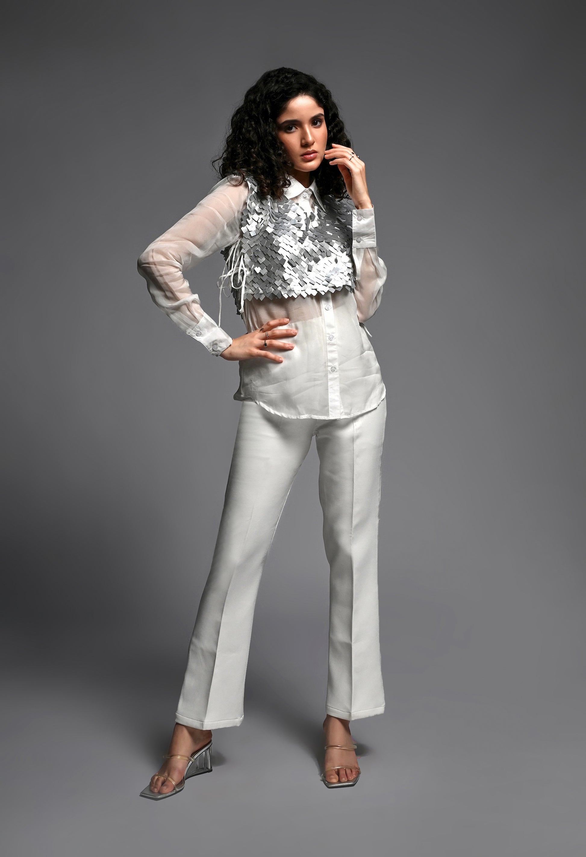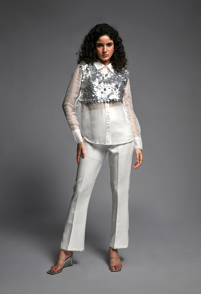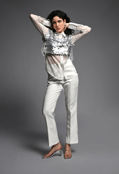A never before seen shirt with a short silver jacket and tie strings on the corners.This shirt features pointed collar, buttoned cuffed and a mesmerising cover up