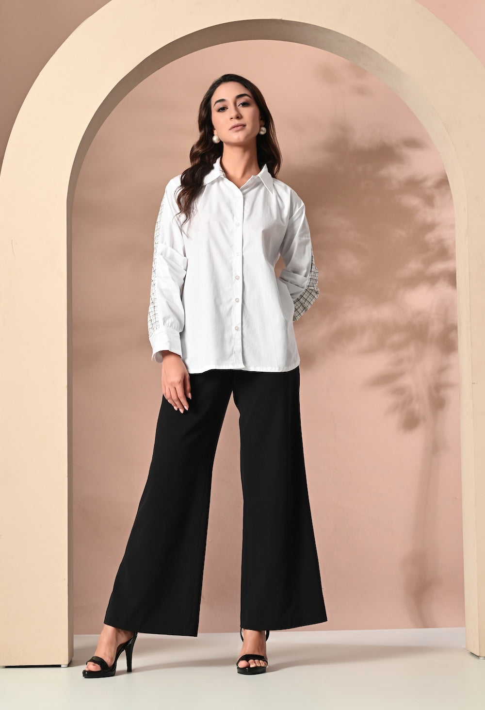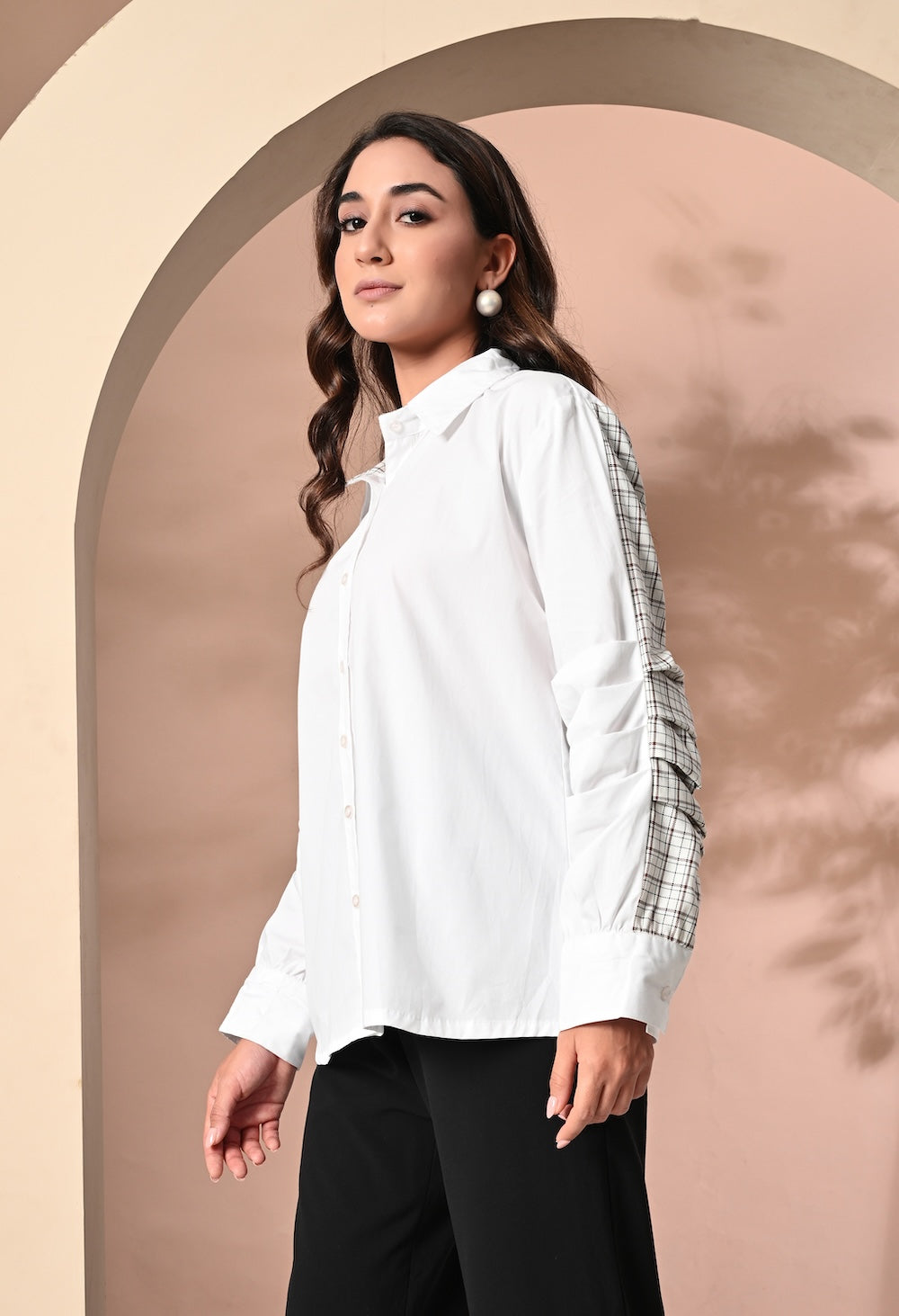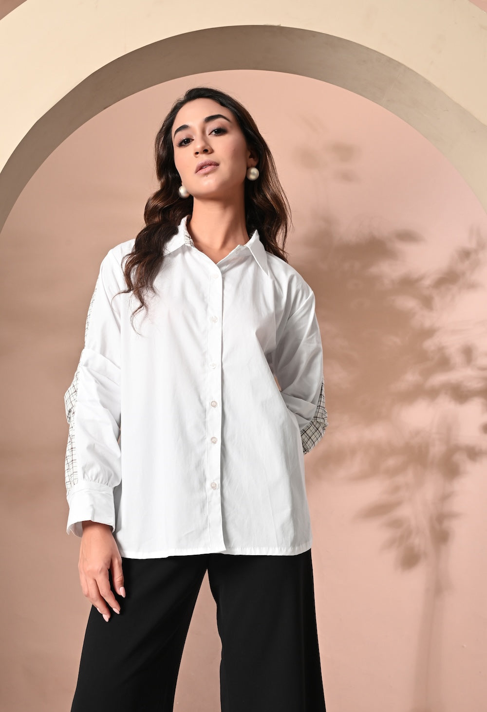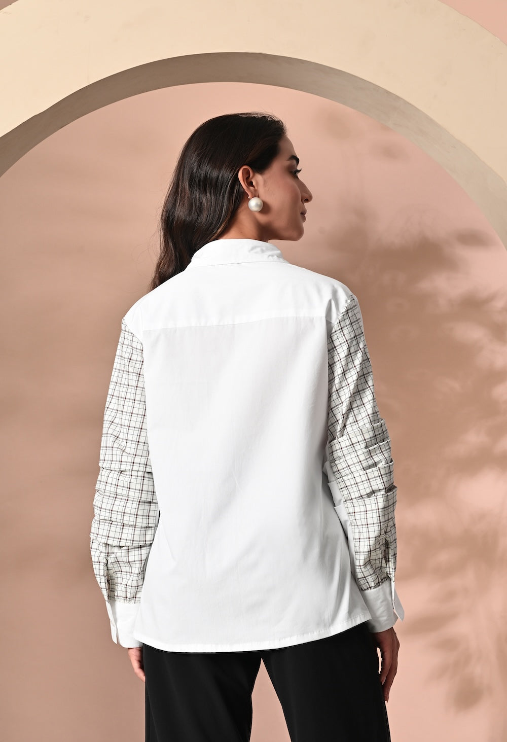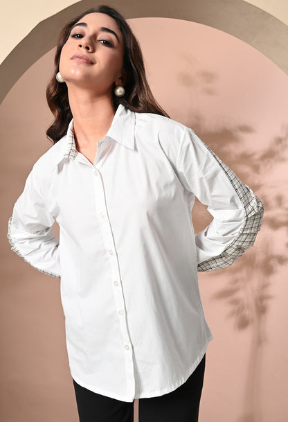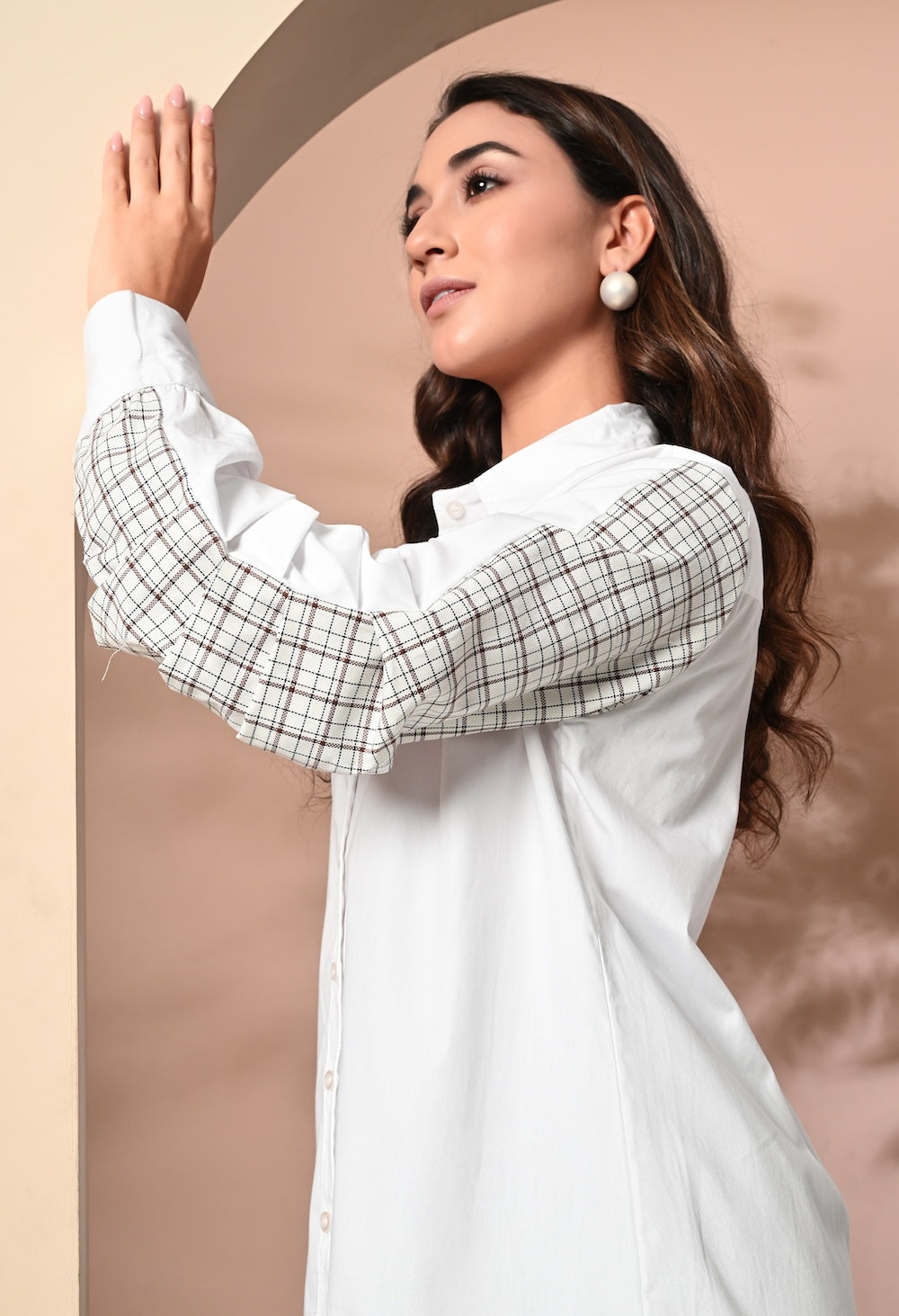From desk to dawn! Look trendy at all times in our white shirt with check sleeves