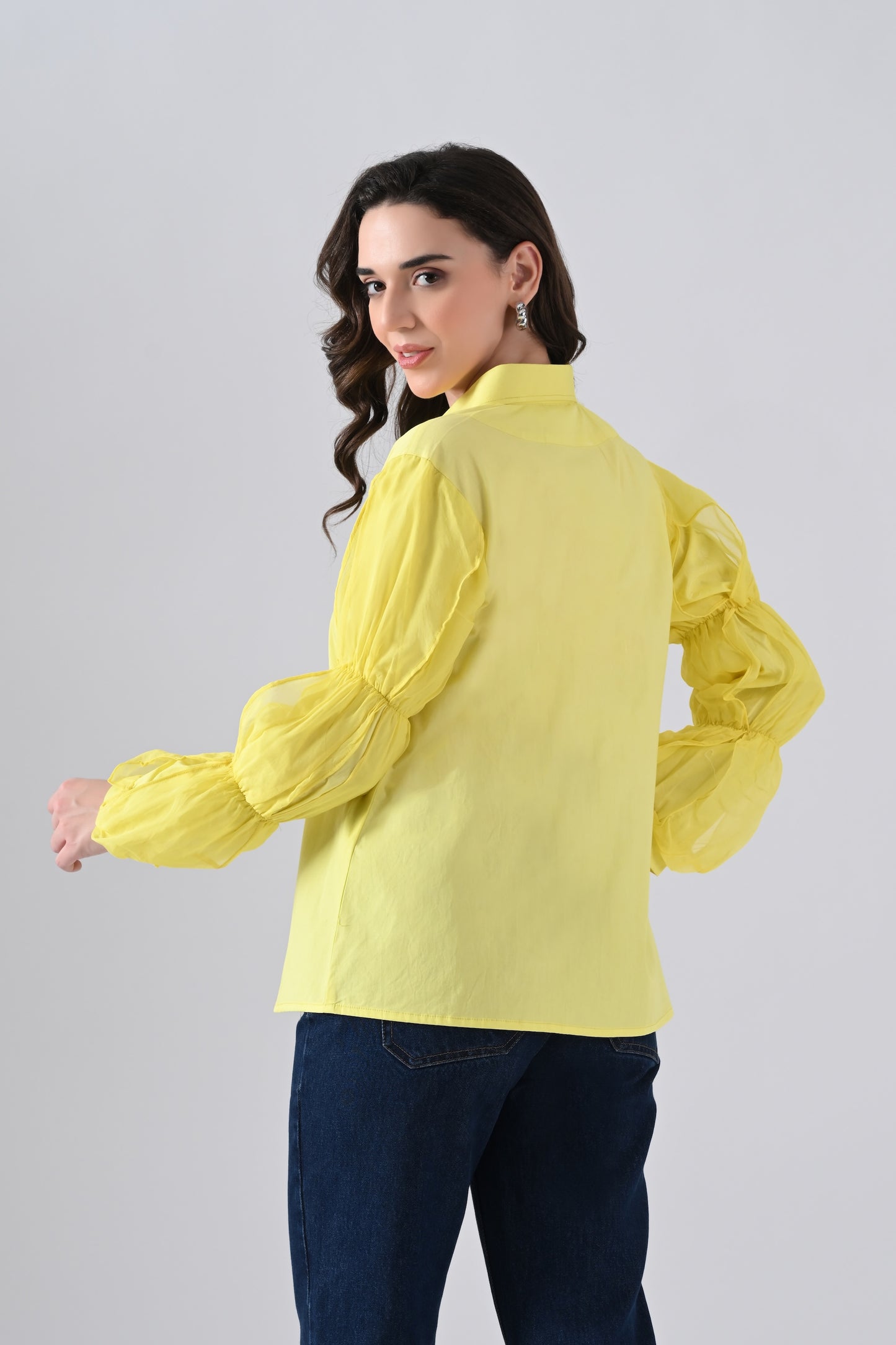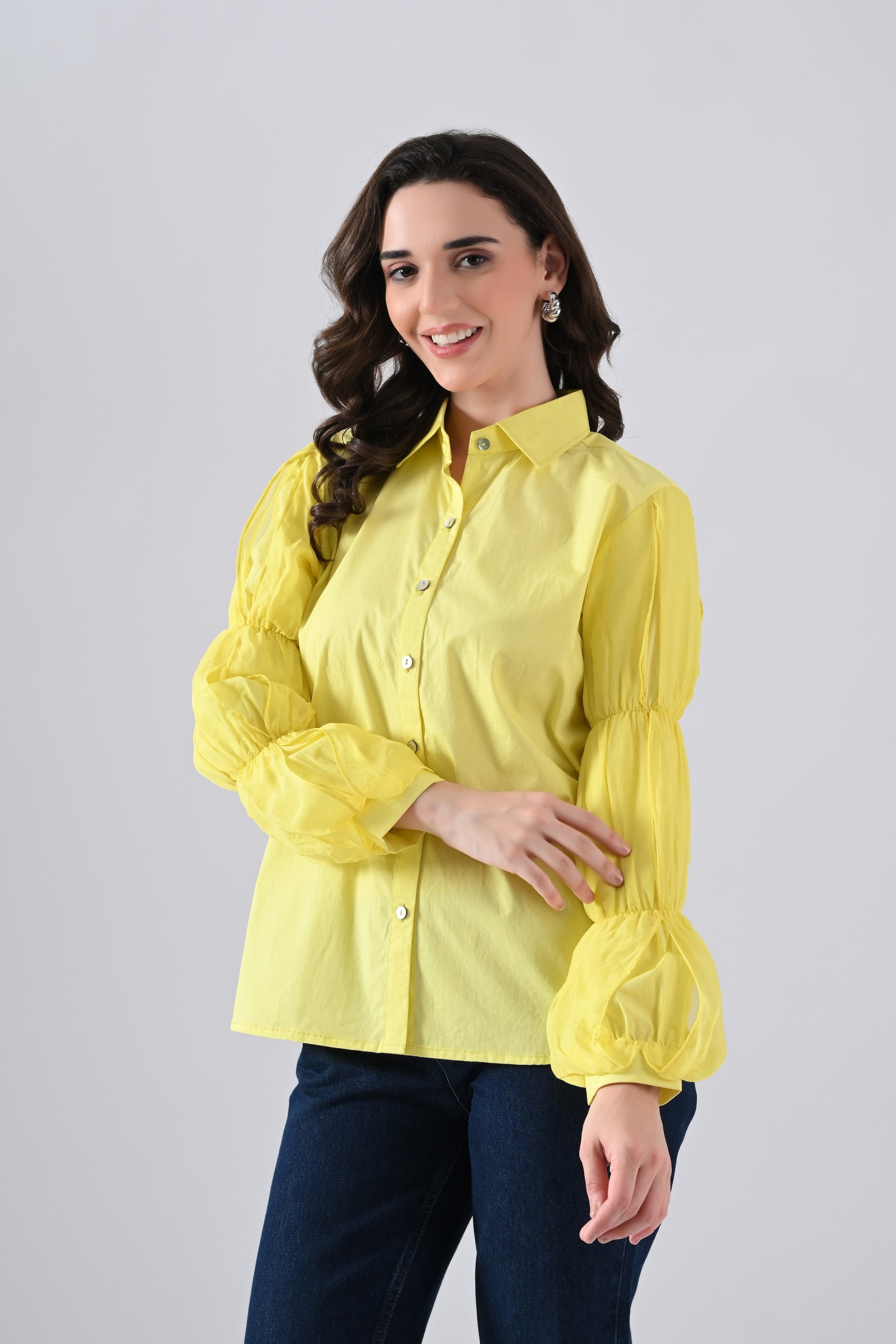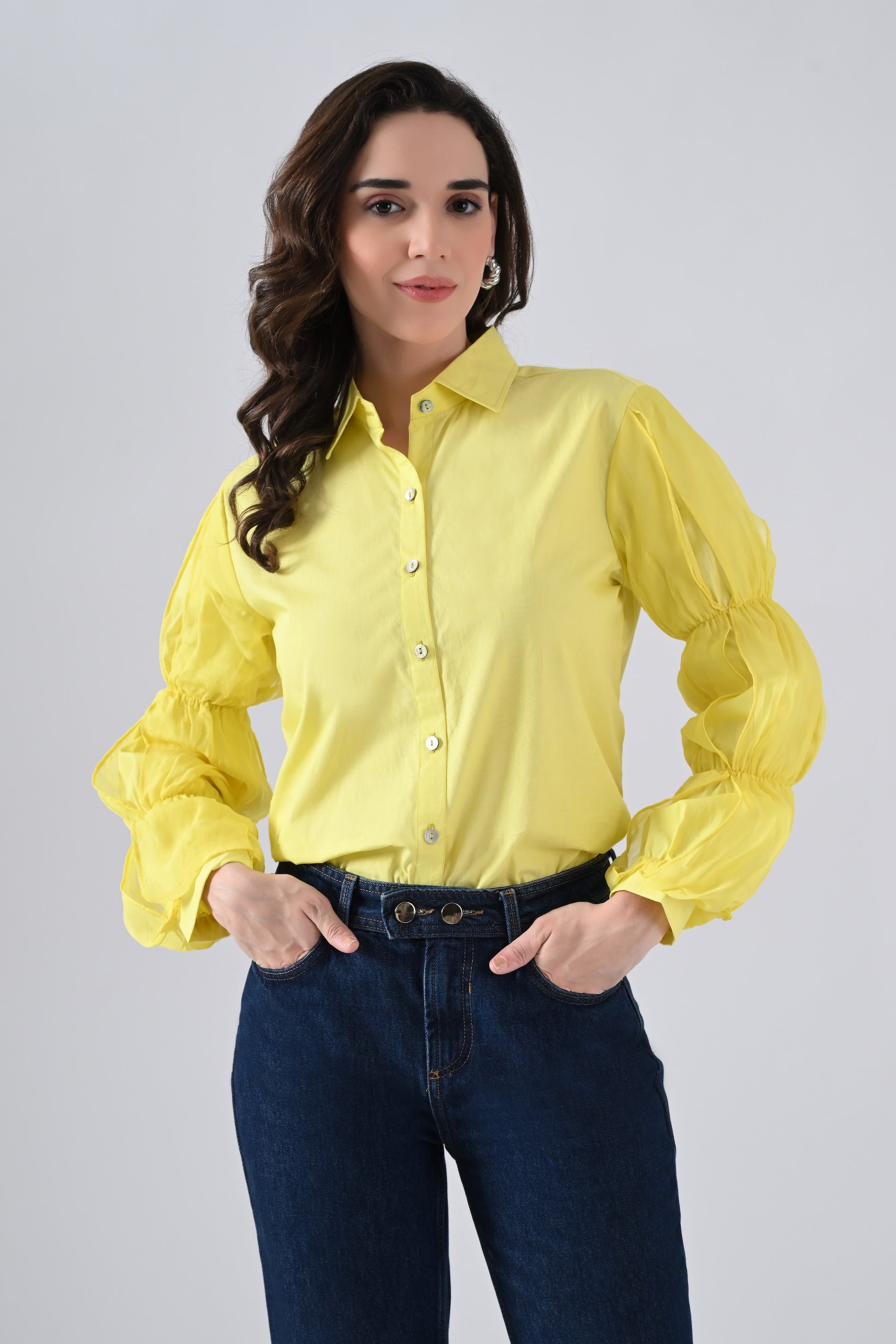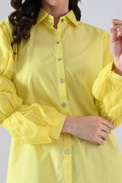 Yellow Cotton Shirt with Organza Frilled Sleeves