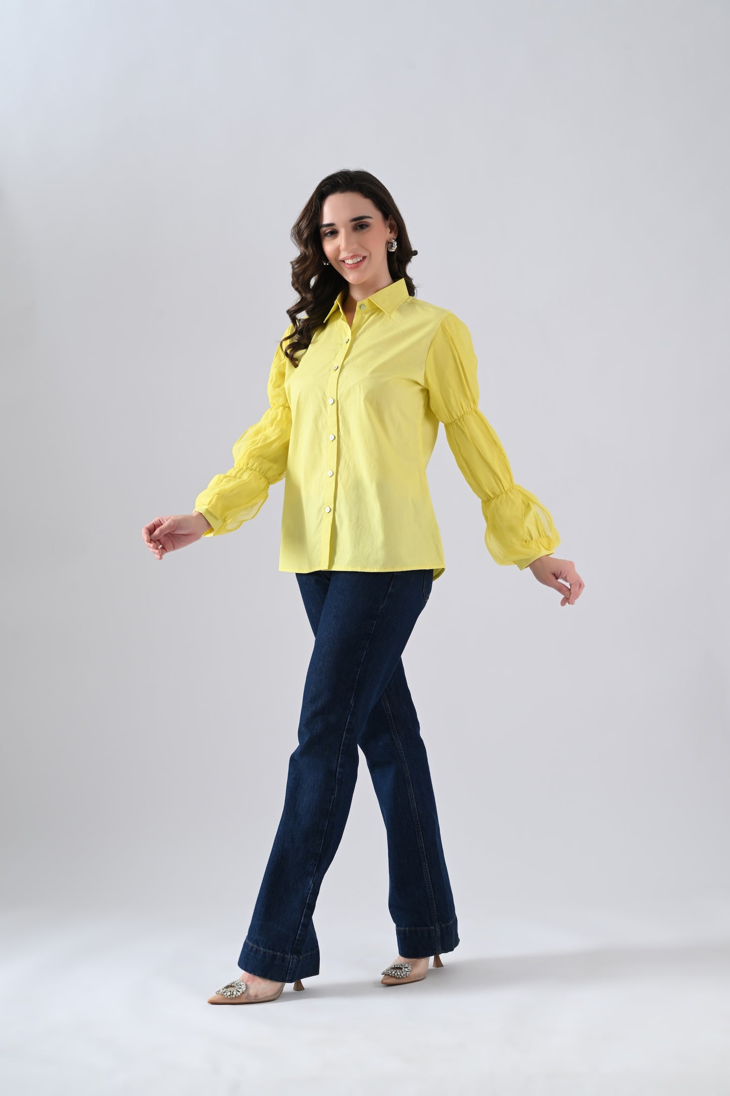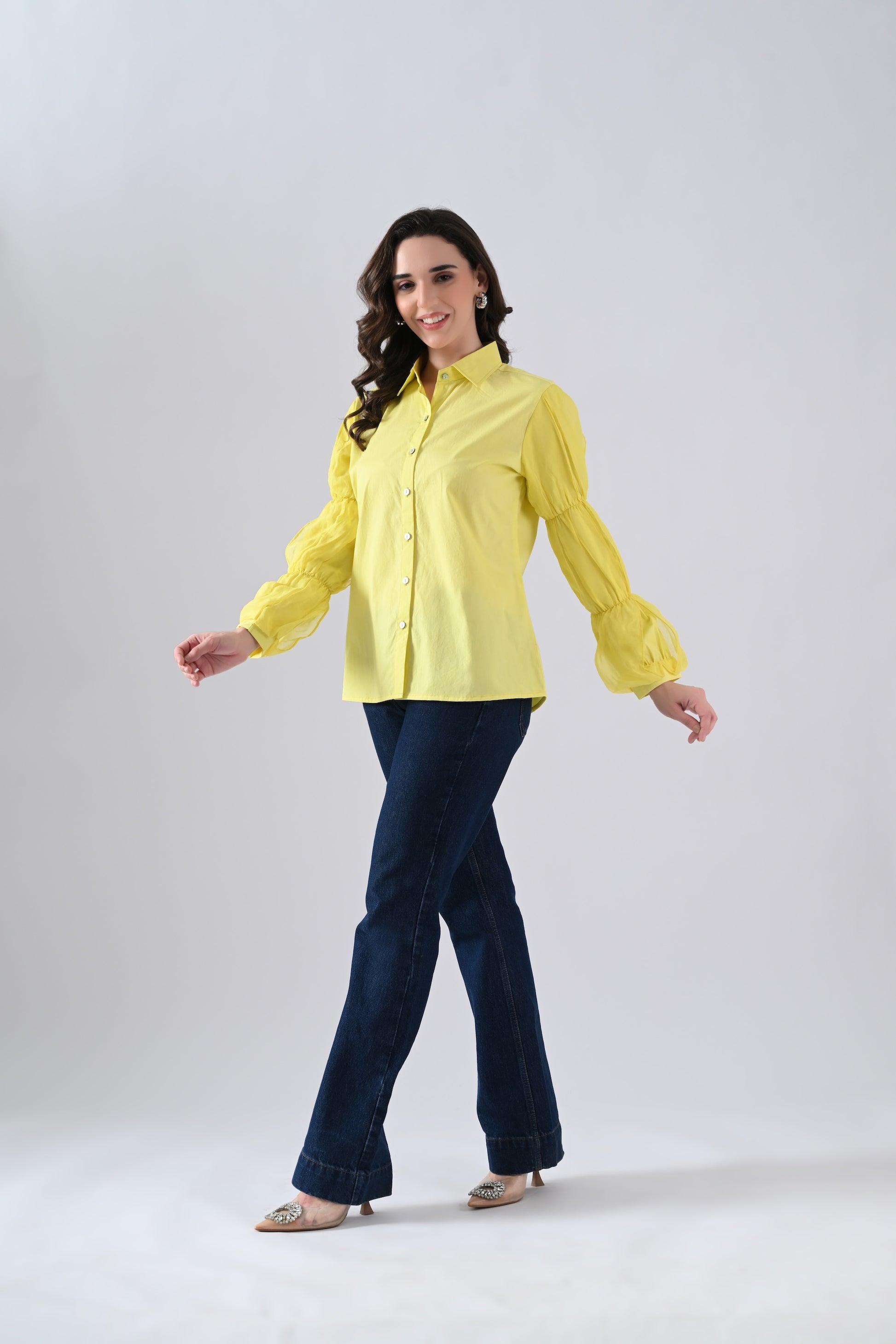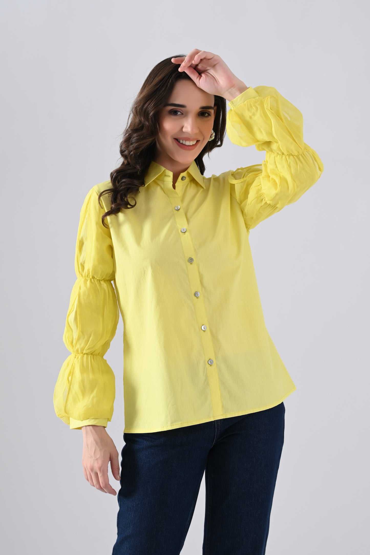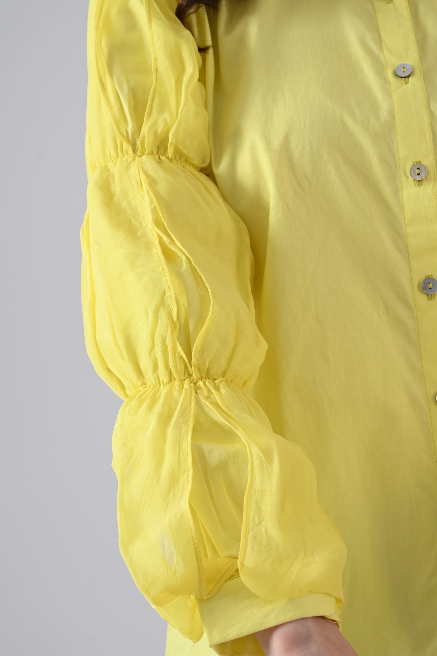 Yellow Cotton Shirt with Organza Frilled Sleeves